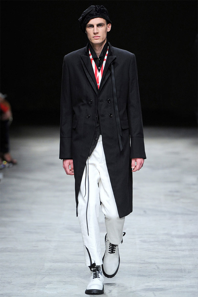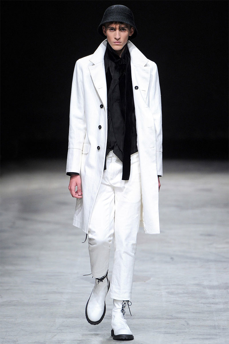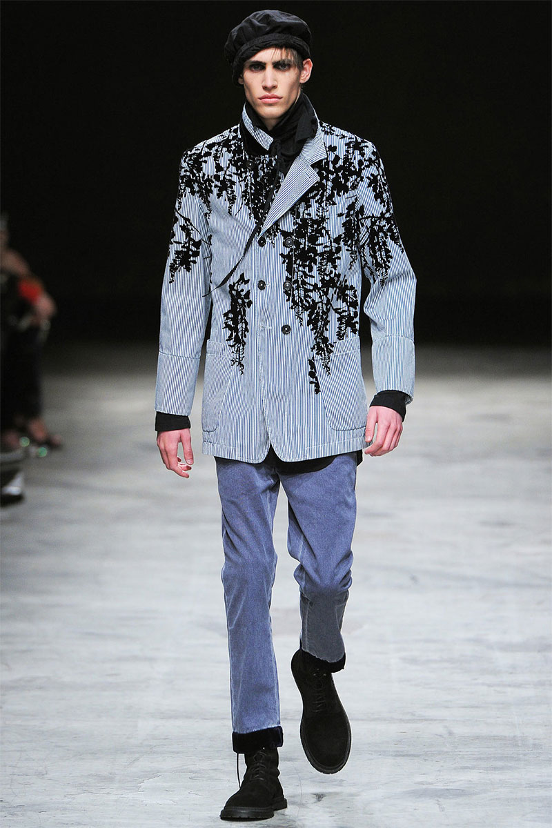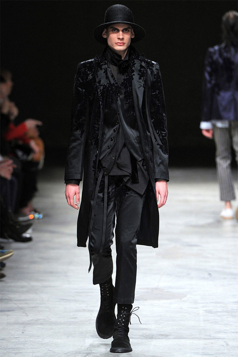 Ann Demeulemeester presented a romantic and dark Spring/Summer 2014 collection during Paris Fashion Week, featuring formal tailoring, stripes and velvet flowers all over the collection.
