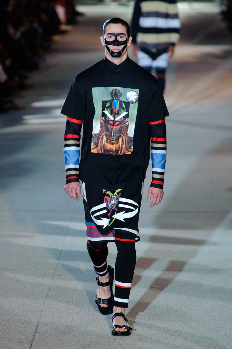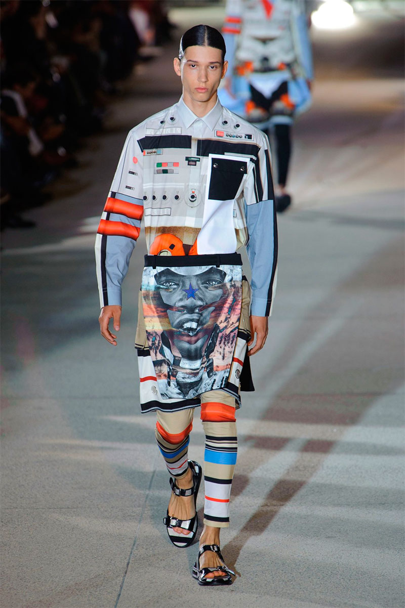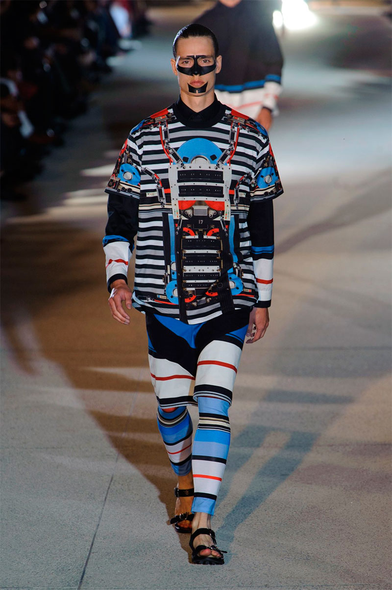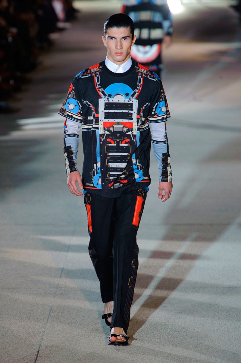 For the Givenchy Spring/Summer 2014 collection, Riccardo Tisci embarks upon a journey from America to Africa. From L.A. skaters, nerds obsessed with vintage 1970s computers, electronics’ loudspeakers to African ethnography, the show is about mixing colors, shapes, designs and prints. Colorful silhouettes exude a sporty elegance and a freedom of layering with contrasting elements.