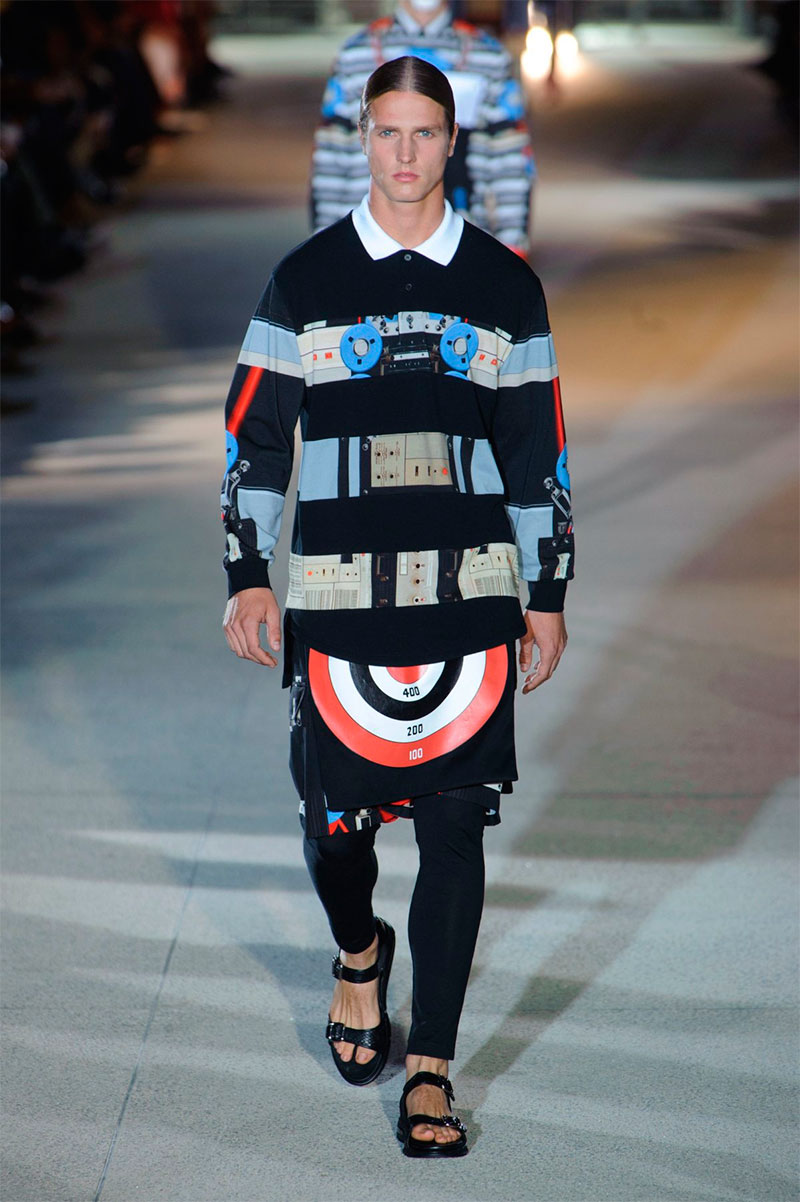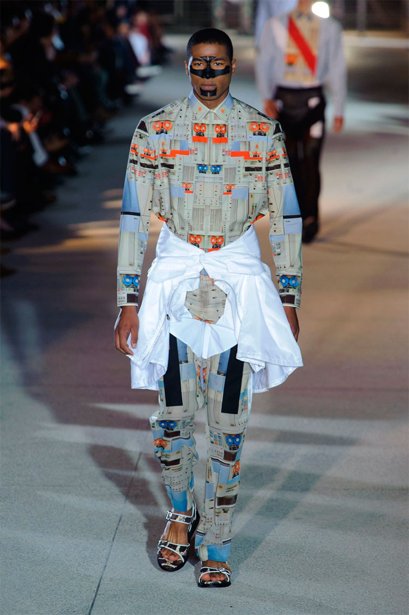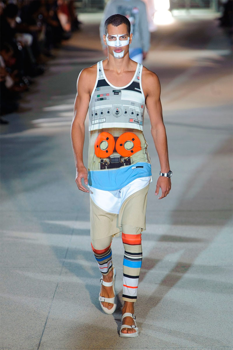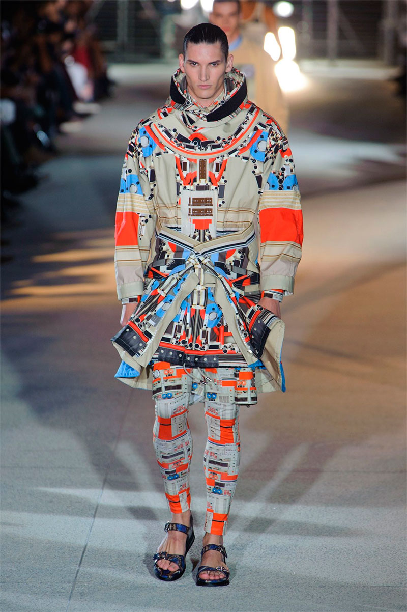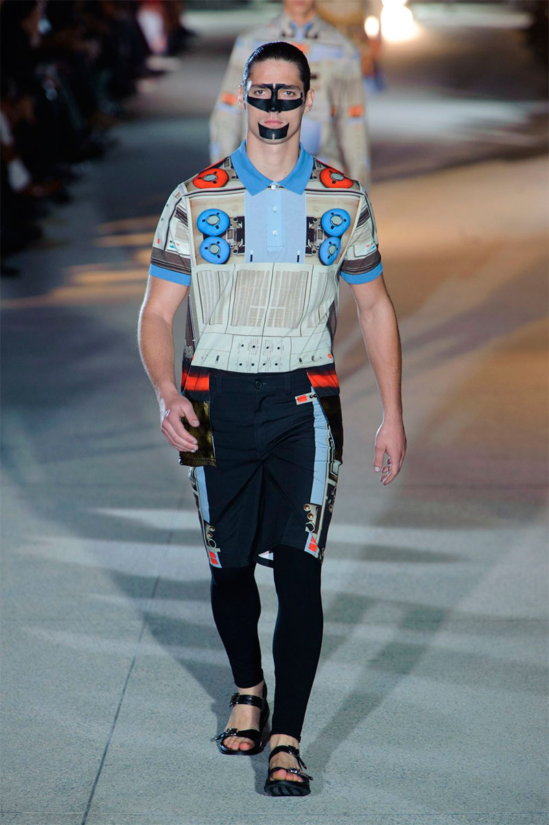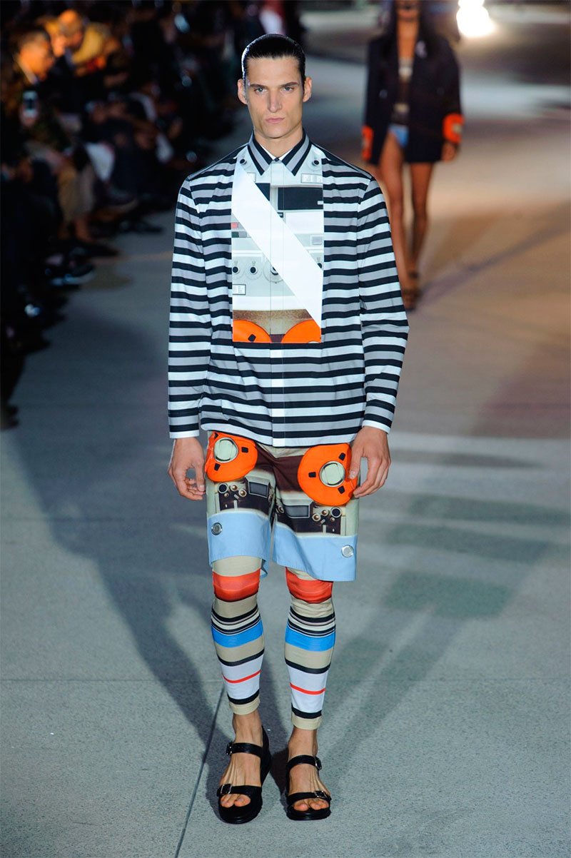 Bright and light computerized motifs give a dynamic and graphic take to prints. They are merged with an influence of Masaï and Zulu bold iconography, layered together with the energy of sportswear. Every kind of stripe animates the garments while targets and go-carts add further visual effects. Placed or worked in patchwork, each print reveals elaborate compositions. Intricate fronted shirts and athletic t-shirts with cut-outs also inject geometry.