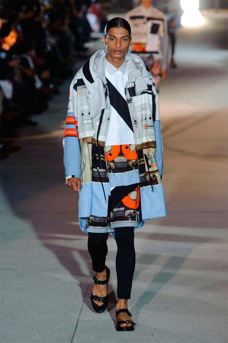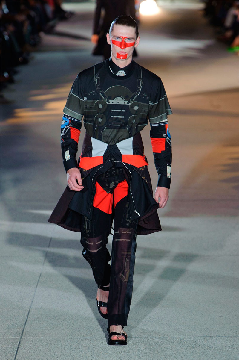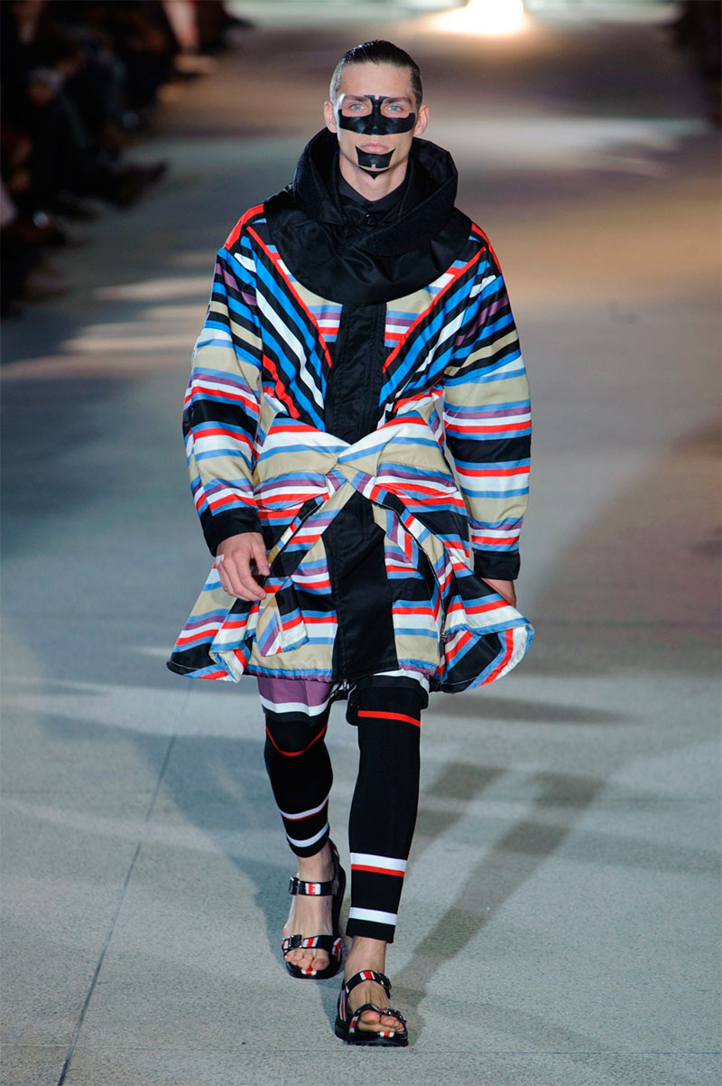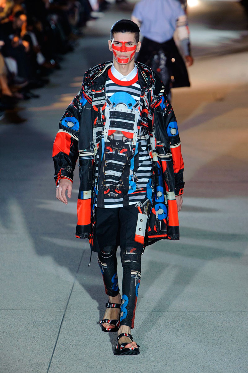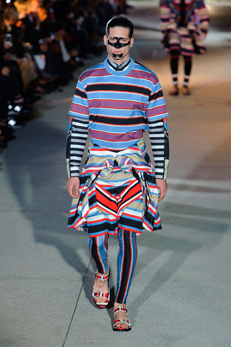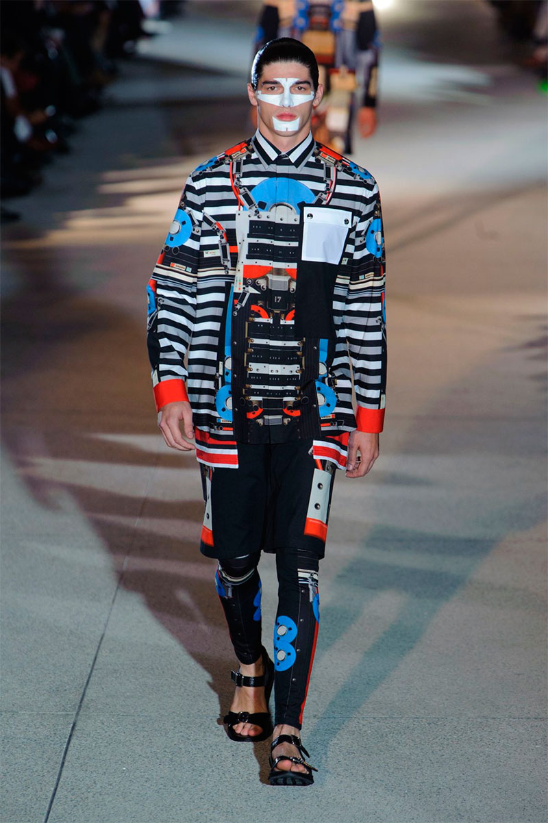 Bright and light computerized motifs give a dynamic and graphic take to prints. They are merged with an influence of Masaï and Zulu bold iconography, layered together with the energy of sportswear. Every kind of stripe animates the garments while targets and go-carts add further visual effects. Placed or worked in patchwork, each print reveals elaborate compositions. Intricate fronted shirts and athletic t-shirts with cut-outs also inject geometry.