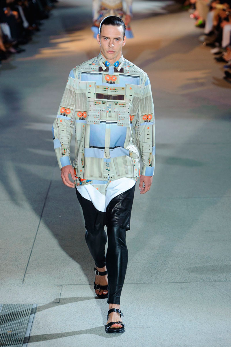 For the Givenchy Spring/Summer 2014 collection, Riccardo Tisci embarks upon a journey from America to Africa. From L.A. skaters, nerds obsessed with vintage 1970s computers, electronics’ loudspeakers to African ethnography, the show is about mixing colors, shapes, designs and prints. Colorful silhouettes exude a sporty elegance and a freedom of layering with contrasting elements.