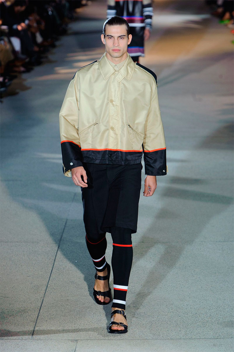 Oversized shirts, polos, parkas, pleated bermudas and leggings alternate with fitted tailoring. Classic cotton fabrics such as poplin, jersey, gabardine and piqué contrast with thick nylon, silk organza or georgette, printed leather, satin and nylon knitted mesh. Neo-tuxedo pants in plain or printed cotton poplin are layered with silk georgette demonstrating masterful construction.
