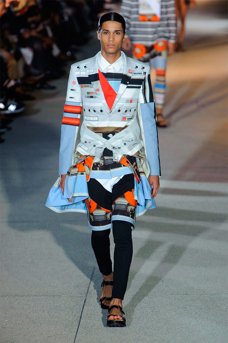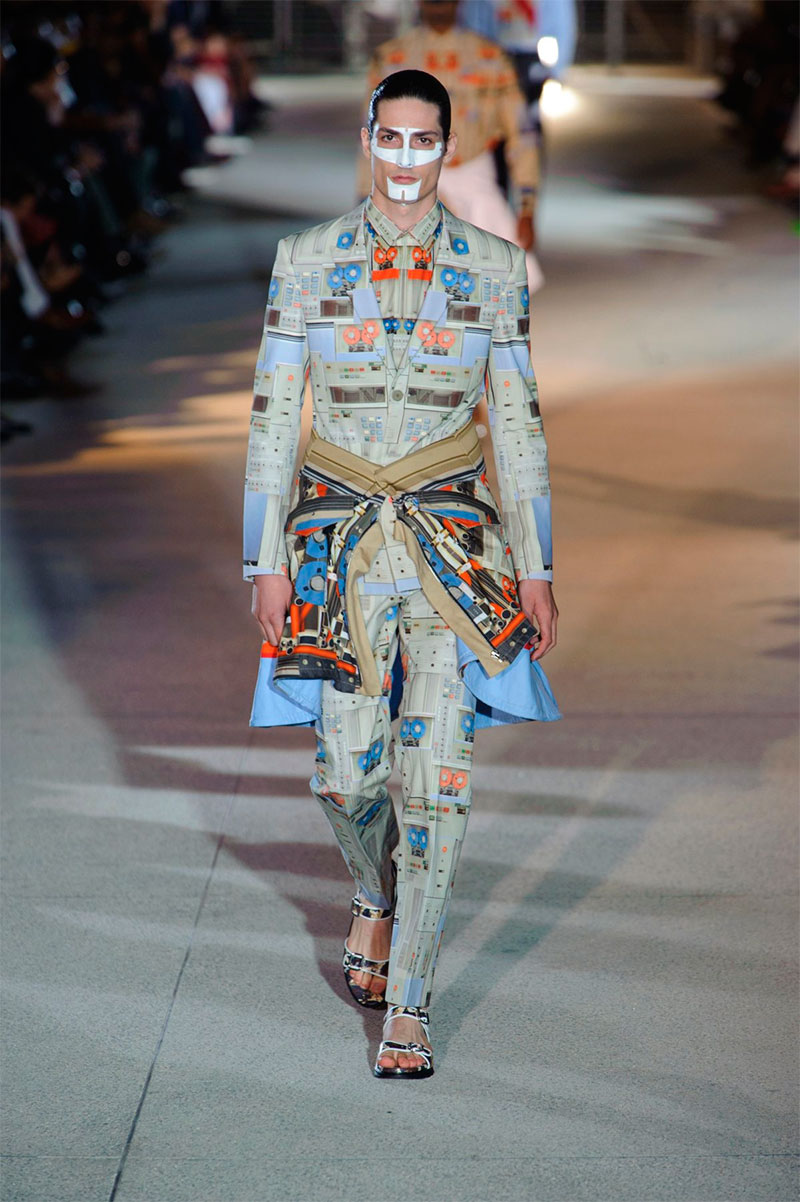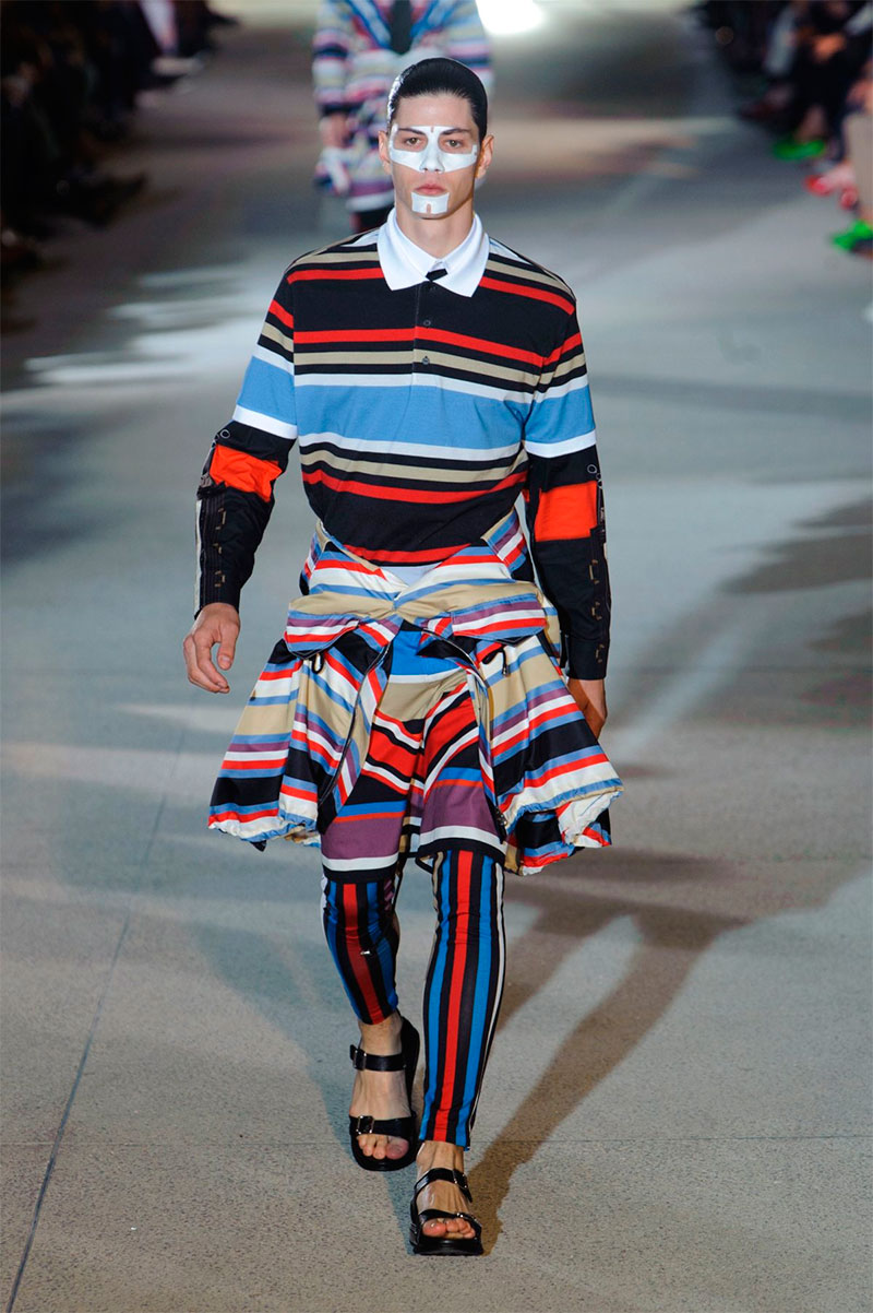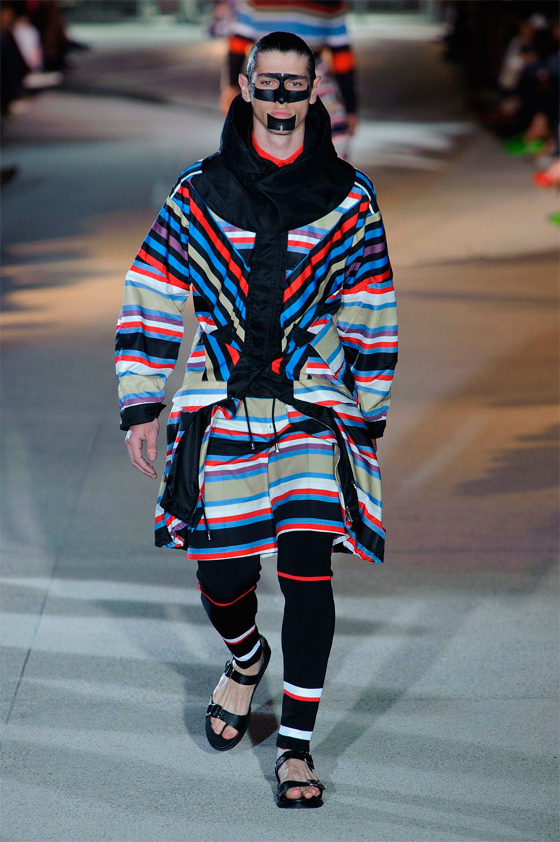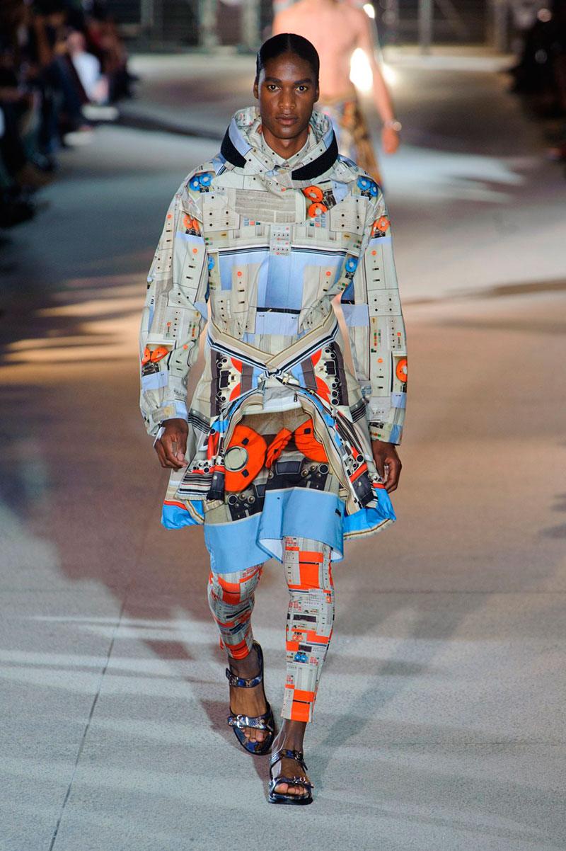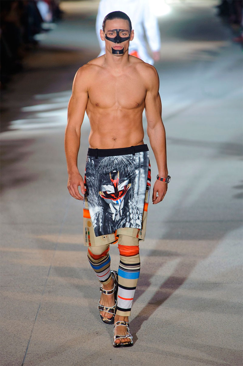 Bright and light computerized motifs give a dynamic and graphic take to prints. They are merged with an influence of Masaï and Zulu bold iconography, layered together with the energy of sportswear. Every kind of stripe animates the garments while targets and go-carts add further visual effects. Placed or worked in patchwork, each print reveals elaborate compositions. Intricate fronted shirts and athletic t-shirts with cut-outs also inject geometry.