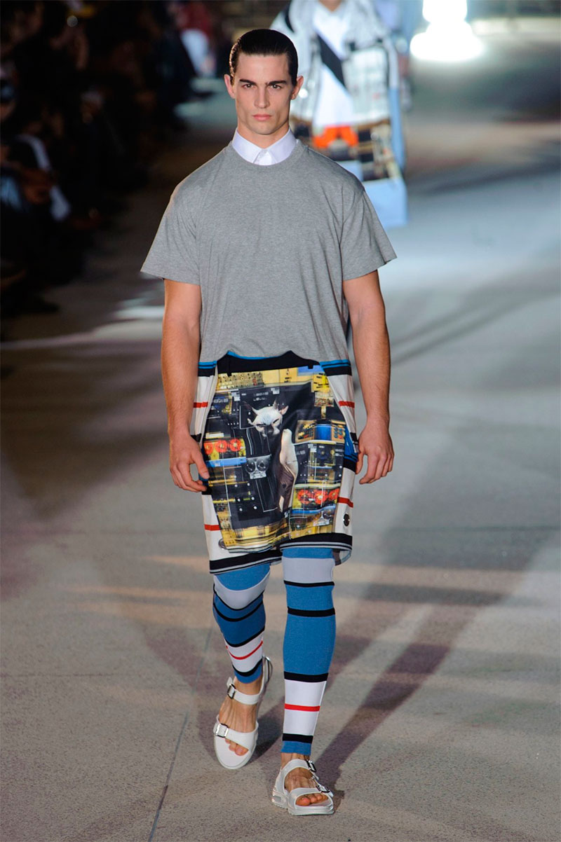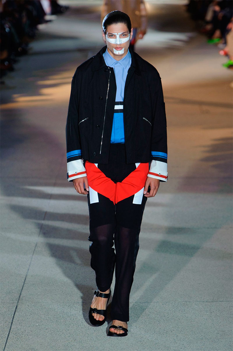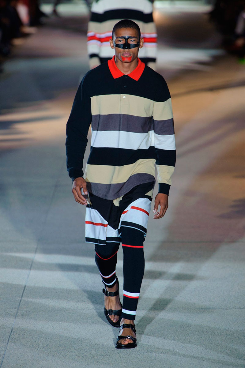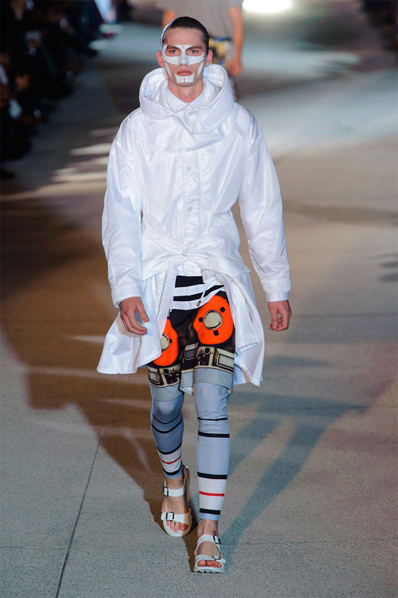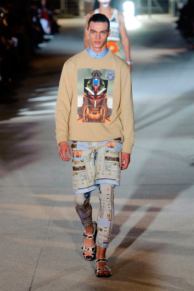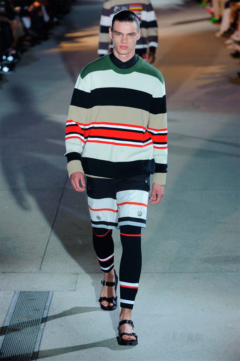 Bright and light computerized motifs give a dynamic and graphic take to prints. They are merged with an influence of Masaï and Zulu bold iconography, layered together with the energy of sportswear. Every kind of stripe animates the garments while targets and go-carts add further visual effects. Placed or worked in patchwork, each print reveals elaborate compositions. Intricate fronted shirts and athletic t-shirts with cut-outs also inject geometry.