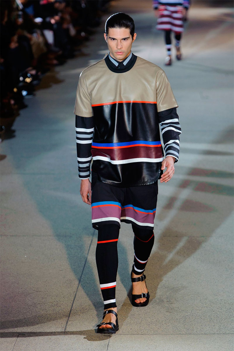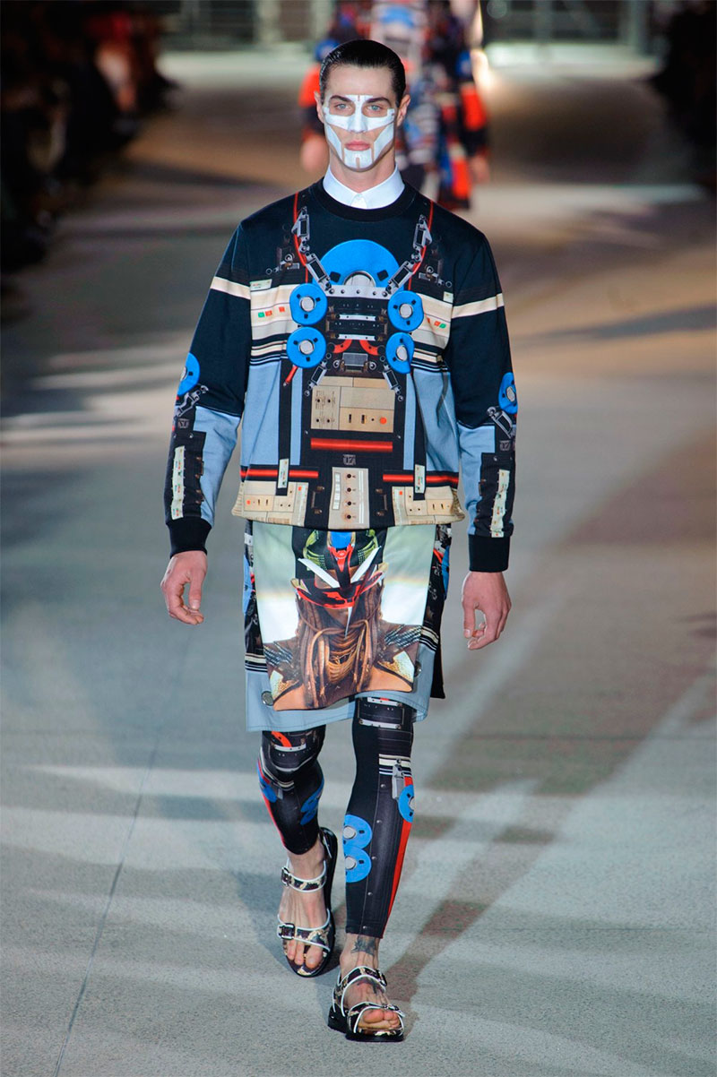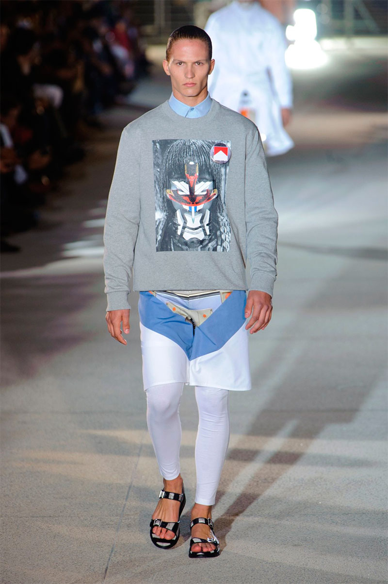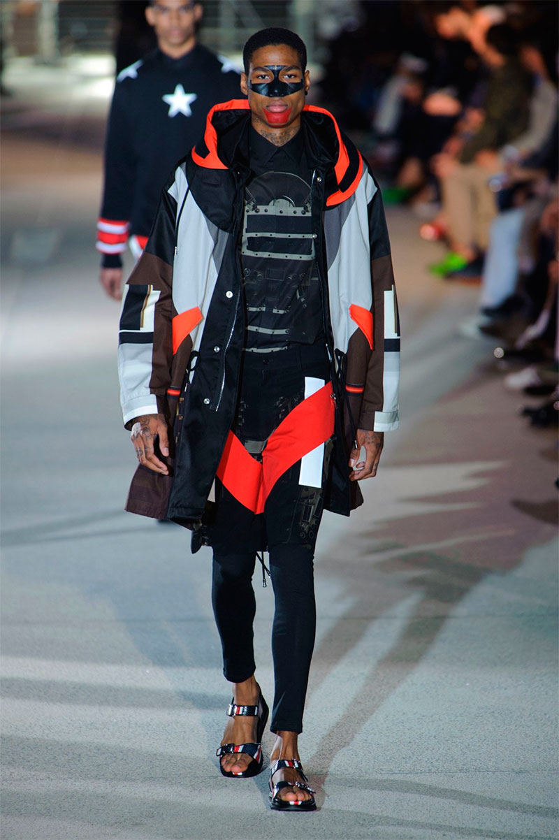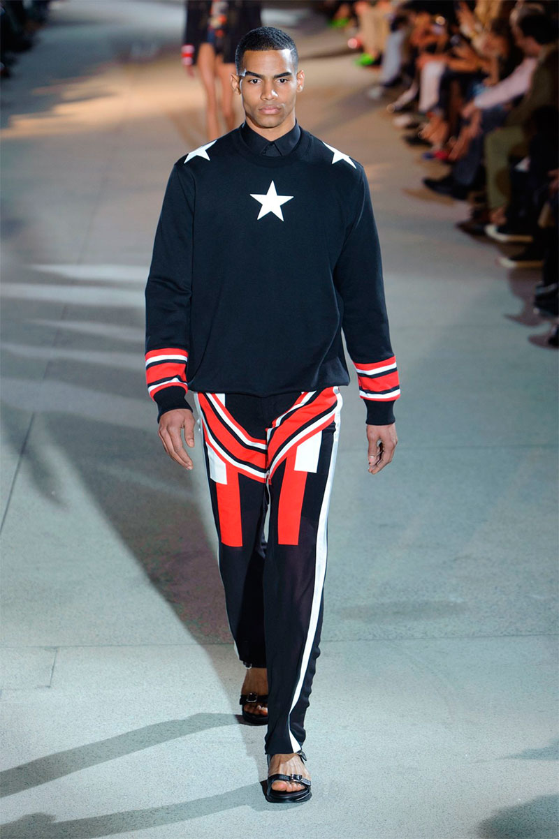 For the Givenchy Spring/Summer 2014 collection, Riccardo Tisci embarks upon a journey from America to Africa. From L.A. skaters, nerds obsessed with vintage 1970s computers, electronics’ loudspeakers to African ethnography, the show is about mixing colors, shapes, designs and prints. Colorful silhouettes exude a sporty elegance and a freedom of layering with contrasting elements.