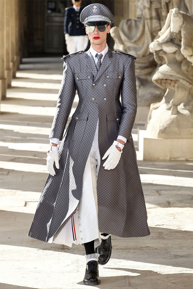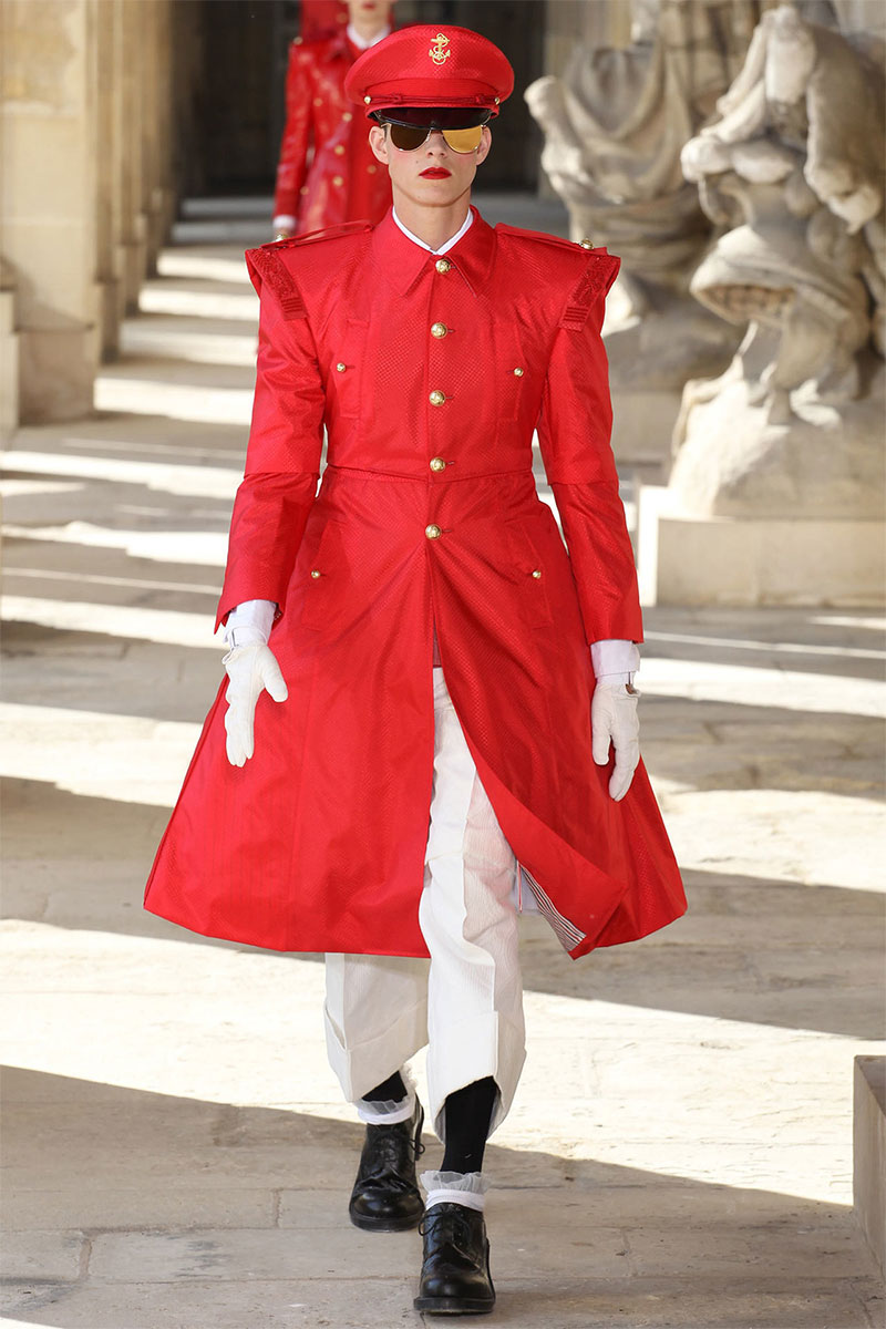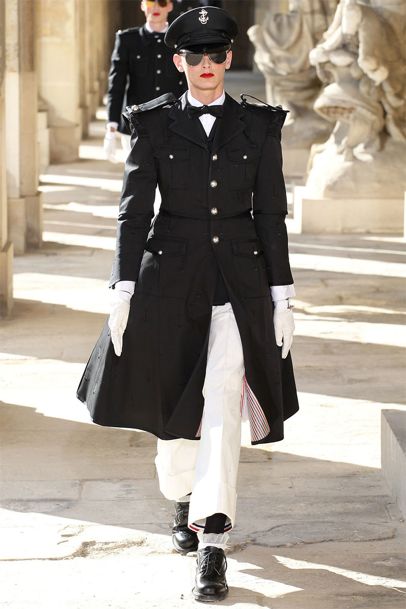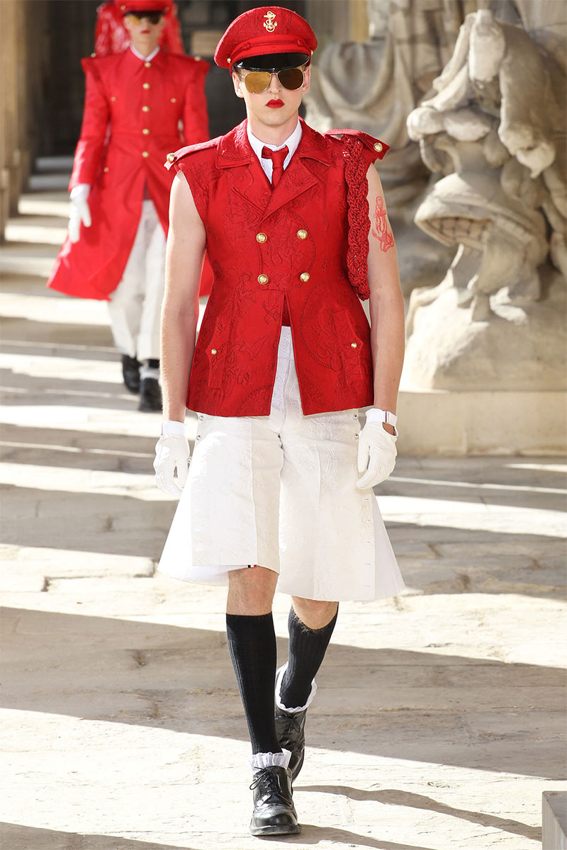 Thom Browne unveiled his Spring/Summer 2014 collection in a military school during Paris Fashion Week. The show featured the models wearing red lipstick and army inspired pieces.