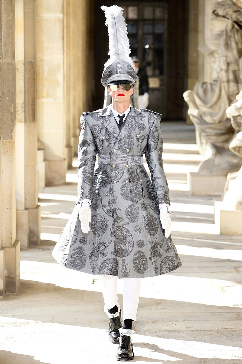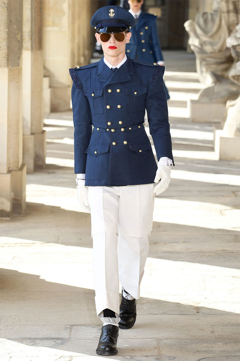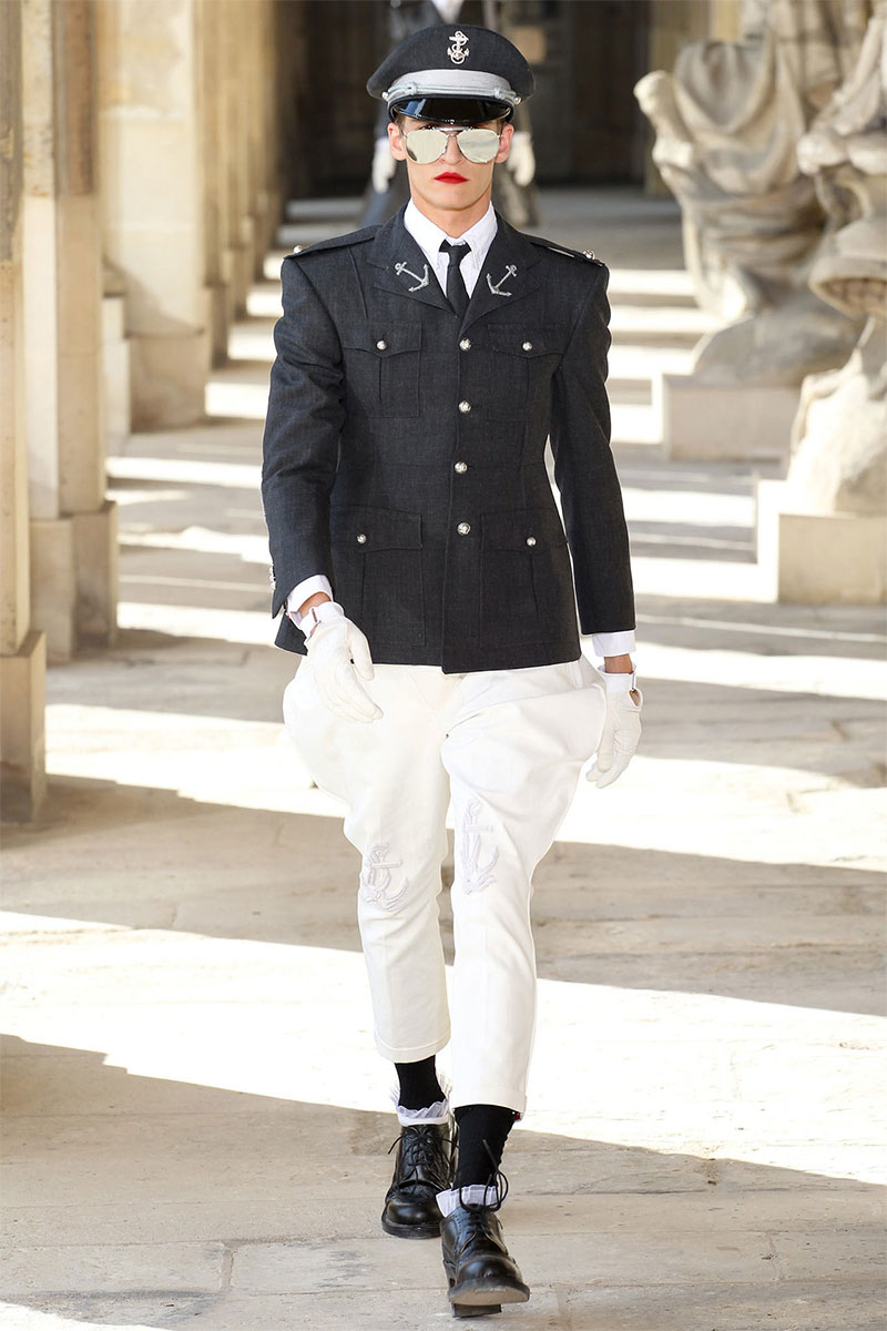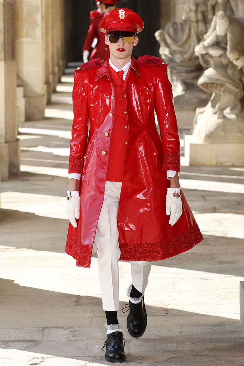 Thom Browne unveiled his Spring/Summer 2014 collection in a military school during Paris Fashion Week. The show featured the models wearing red lipstick and army inspired pieces.