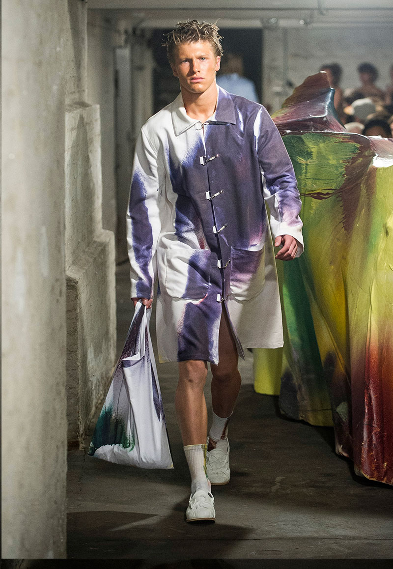 Julian Zigerli presented his Spring/Summer 2014 collection during Mercedes-Benz Fashion Week Berlin. Entitled “At the End of the World to the Left“, the collection features a collaboration with Berlin based artist Katharina Grosse.
