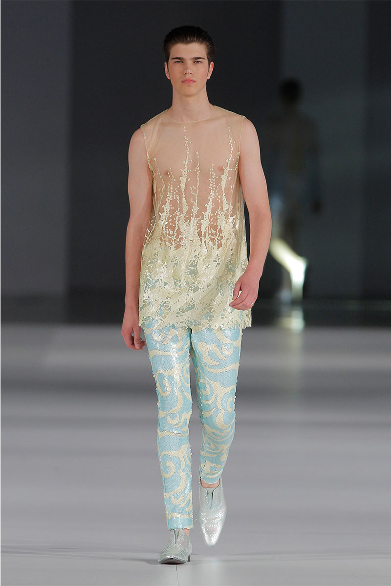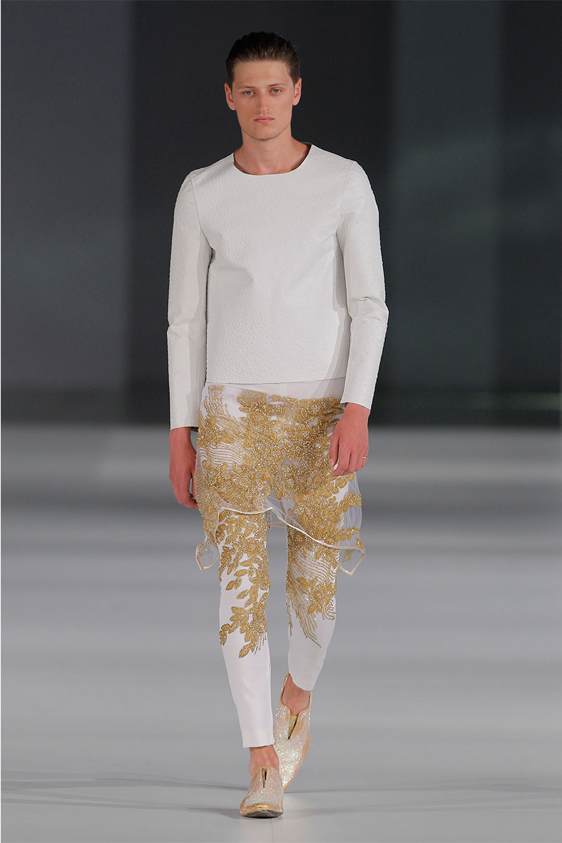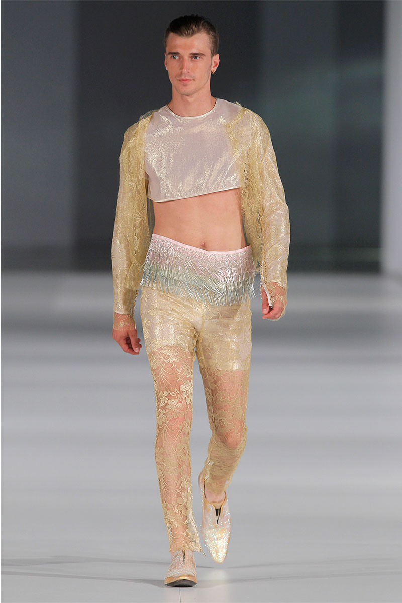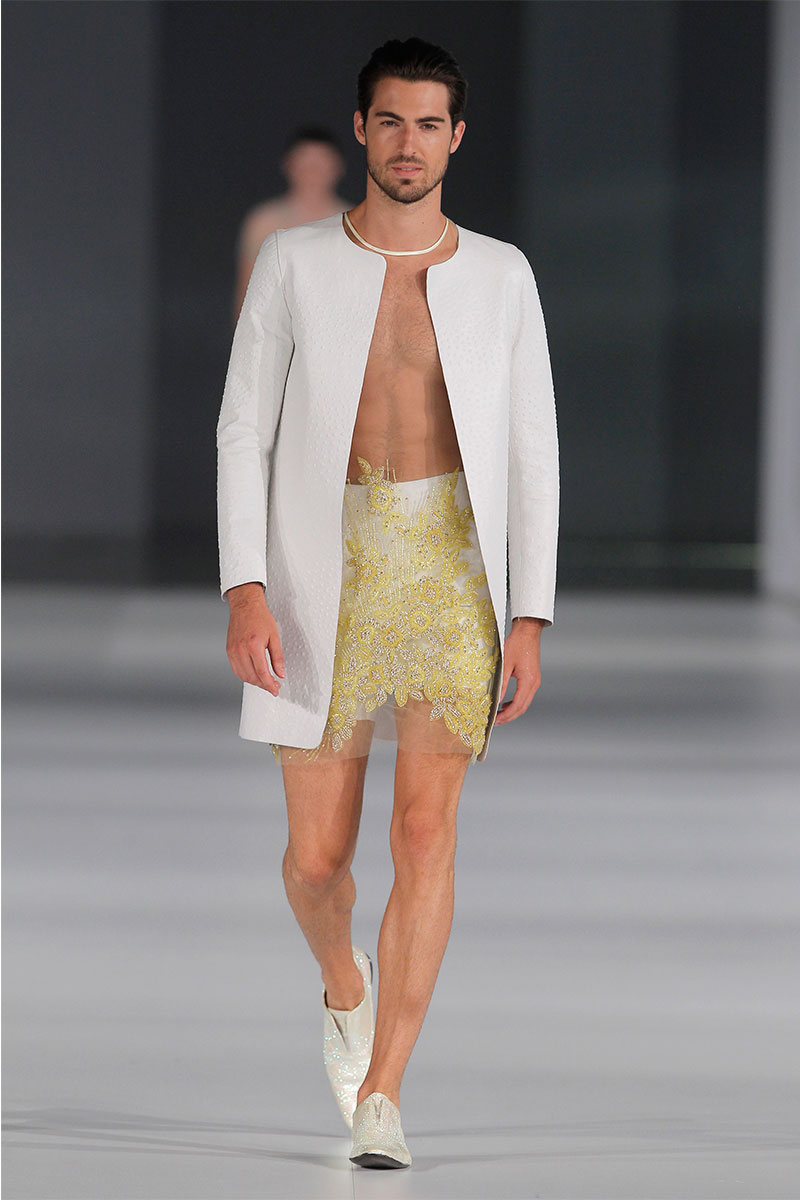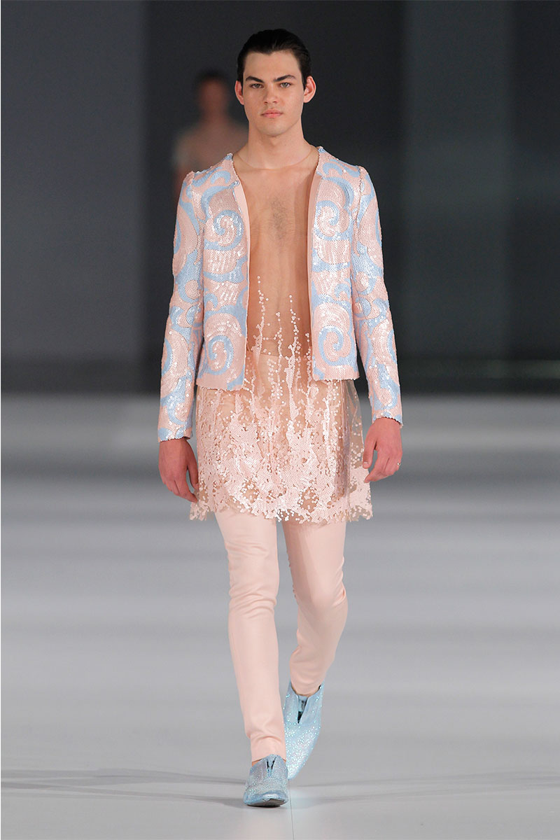 Maite Albéniz Zúñiga presented her Spring/Summer 2014 collection for Albéniz during 080 Barcelona Fashion. Entitled “Angel” the collection took Mick Jagger as a reference, presenting a slim clean vertical silhouette. The color scheme is pastel greens, blues, pinks and yellows along with whites and golds, creating a lucid, attractive and fresh image. The gold thread embroidery inspired by matador costumes together with Swarovskis makes for a daring and sophisticated style. The sumptuous fabrics and trimmings create a unique style fusing different textures and completing the final impression than could be that of a Rock star.