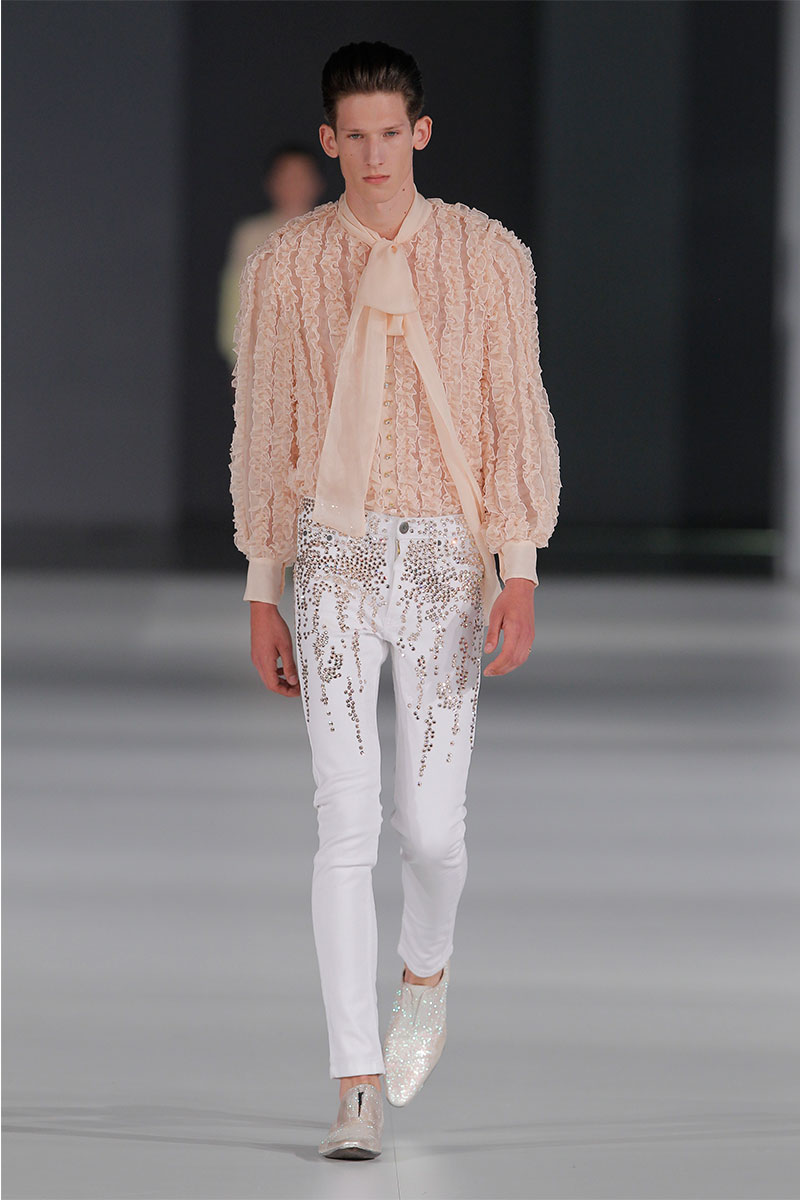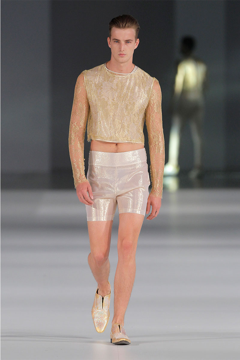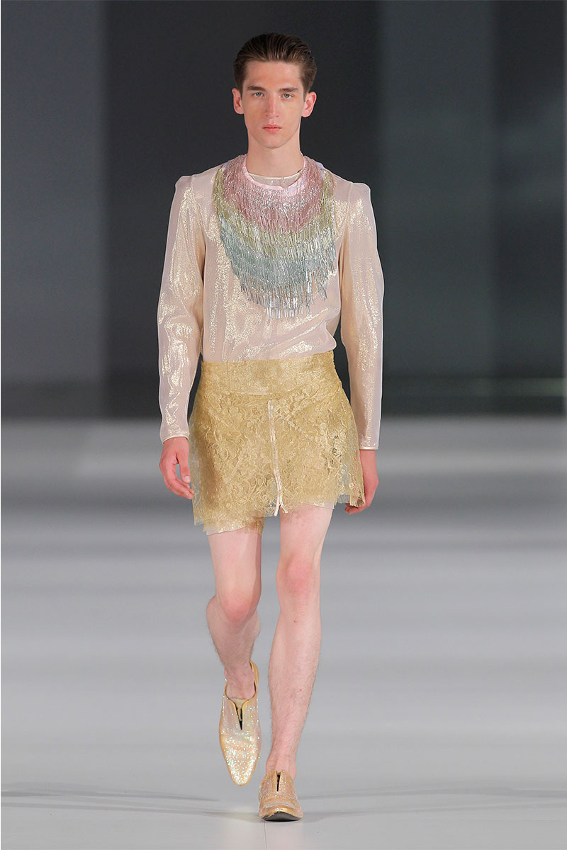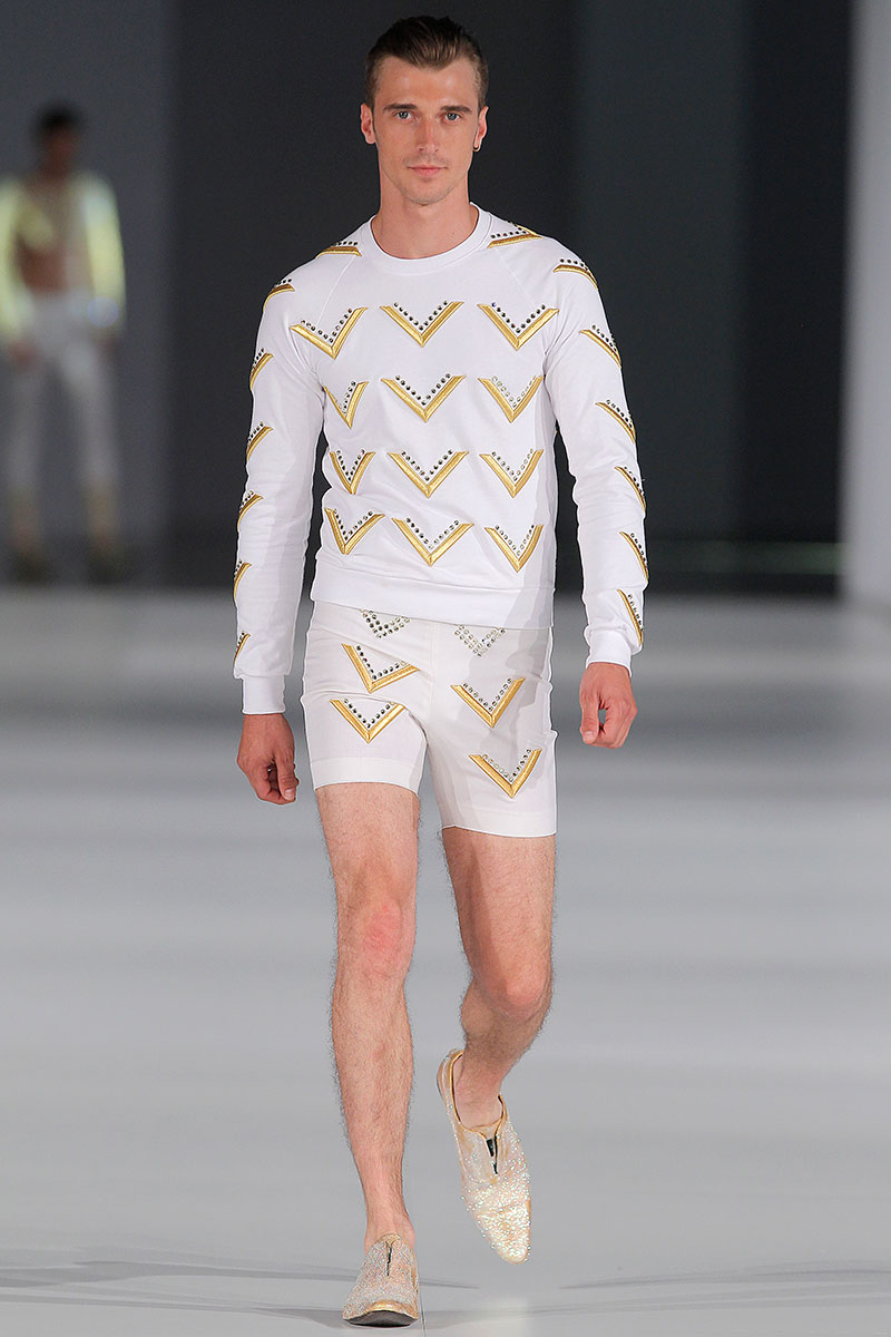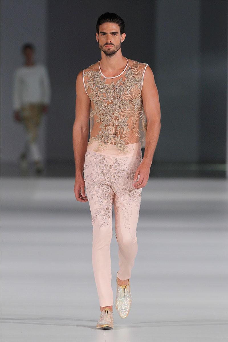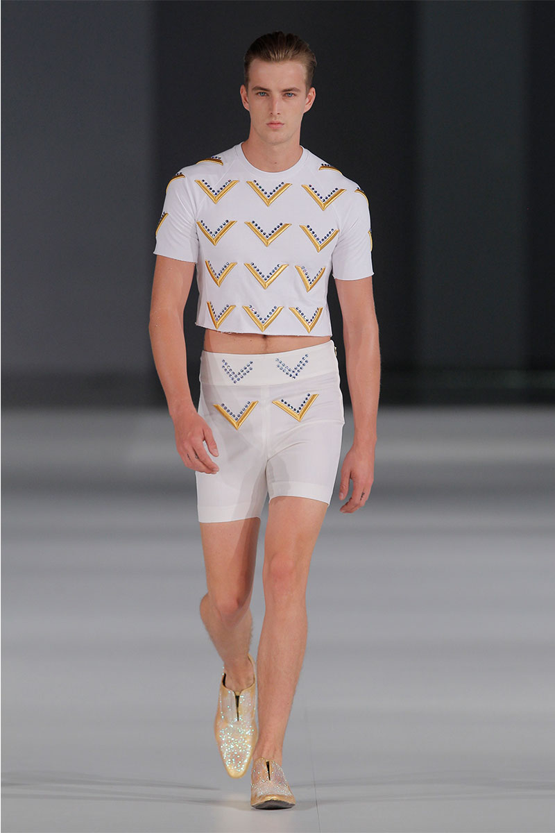 Maite Albéniz Zúñiga presented her Spring/Summer 2014 collection for Albéniz during 080 Barcelona Fashion. Entitled “Angel” the collection took Mick Jagger as a reference, presenting a slim clean vertical silhouette. The color scheme is pastel greens, blues, pinks and yellows along with whites and golds, creating a lucid, attractive and fresh image. The gold thread embroidery inspired by matador costumes together with Swarovskis makes for a daring and sophisticated style. The sumptuous fabrics and trimmings create a unique style fusing different textures and completing the final impression than could be that of a Rock star.