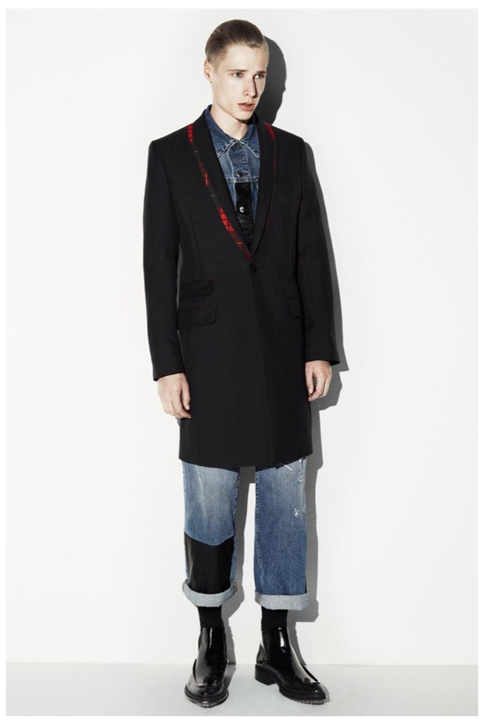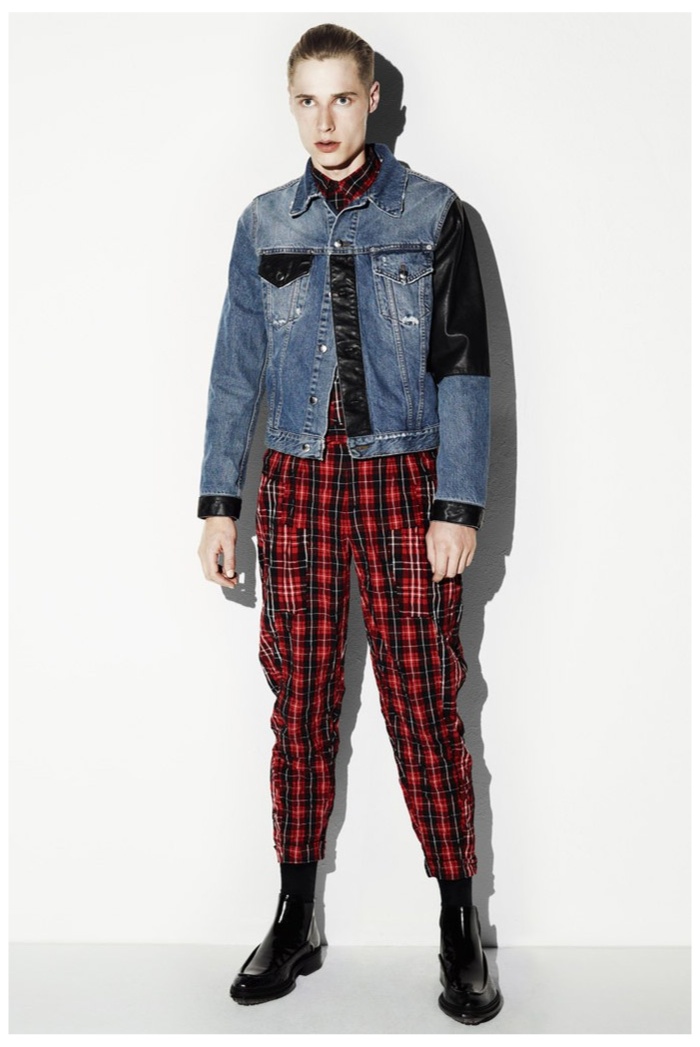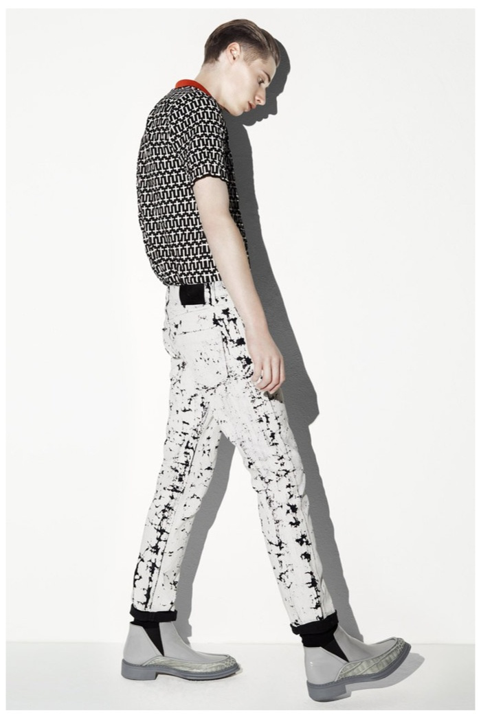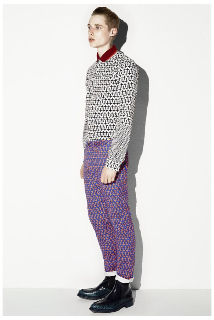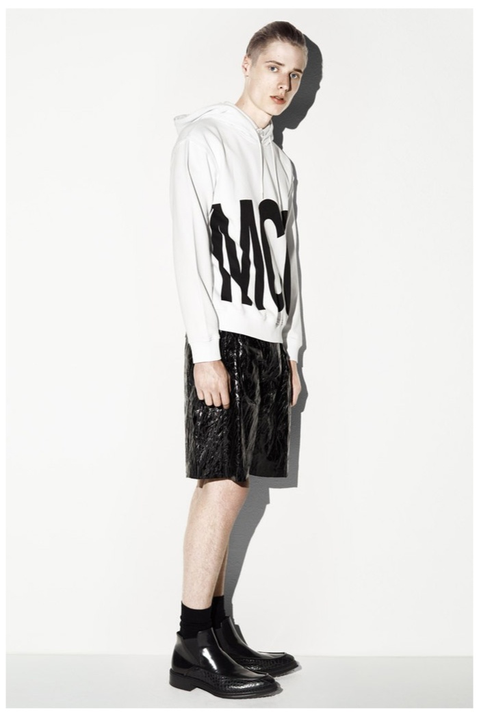 The club scene of the 1990′s informs the spring/summer 2014 McQ collection by Alexander McQueen creative director Sarah Burton. Colorful crosses create a graphic design motif while distressing on pants and sheer knits create a fun combination for logo-adorned basics. Playing with tartan, denim and a graffiti print, the collection comes full circle with an interjection of streetwear-inspired fits taken in a sartorial direction.