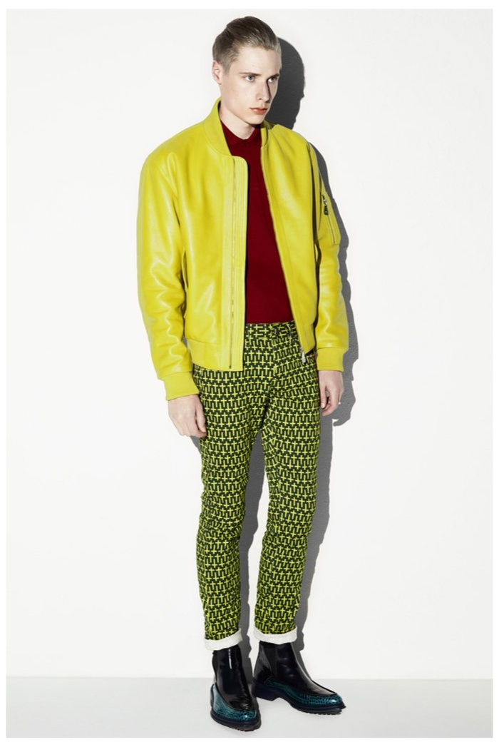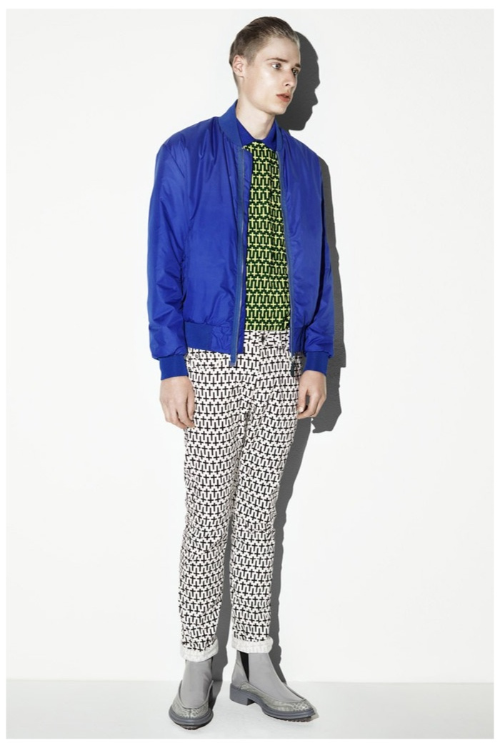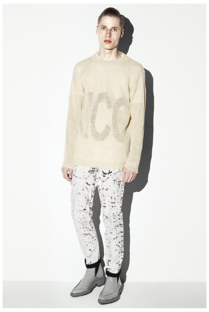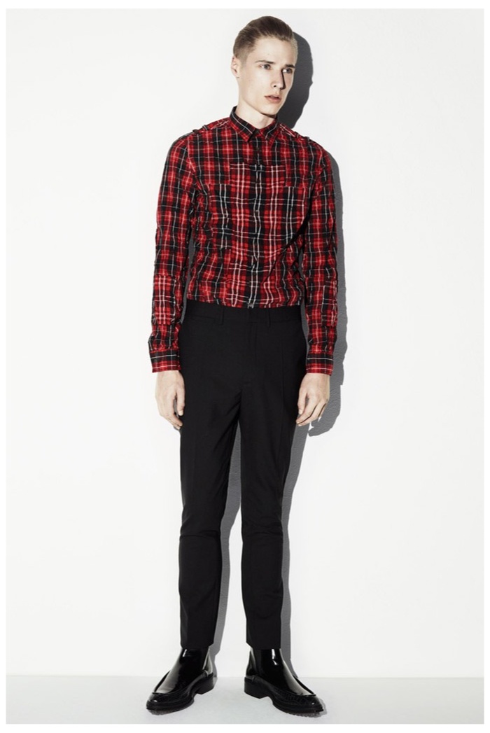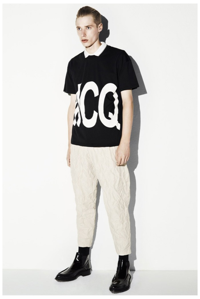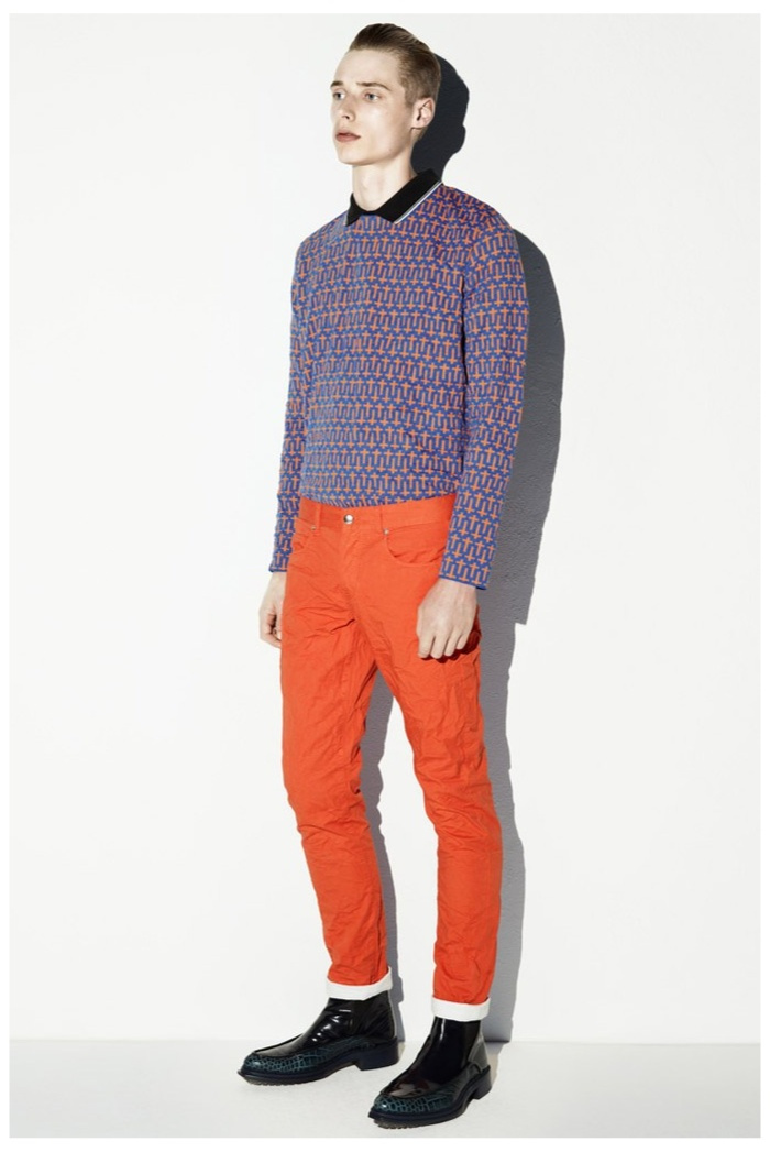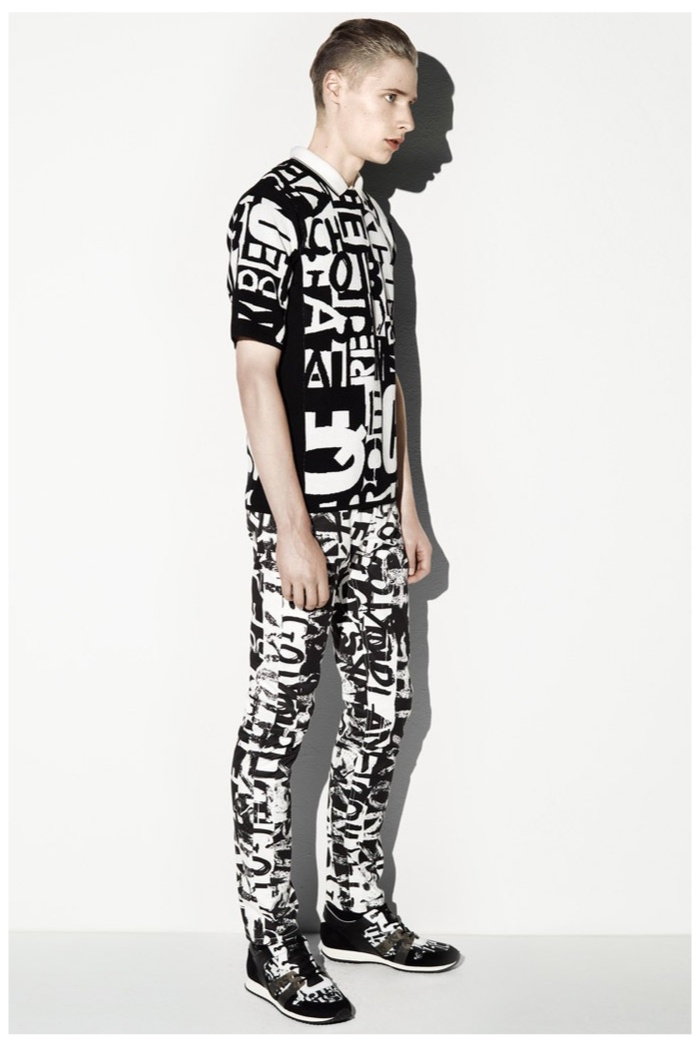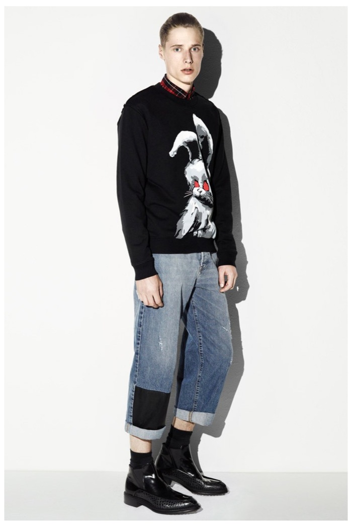 The club scene of the 1990′s informs the spring/summer 2014 McQ collection by Alexander McQueen creative director Sarah Burton. Colorful crosses create a graphic design motif while distressing on pants and sheer knits create a fun combination for logo-adorned basics. Playing with tartan, denim and a graffiti print, the collection comes full circle with an interjection of streetwear-inspired fits taken in a sartorial direction.