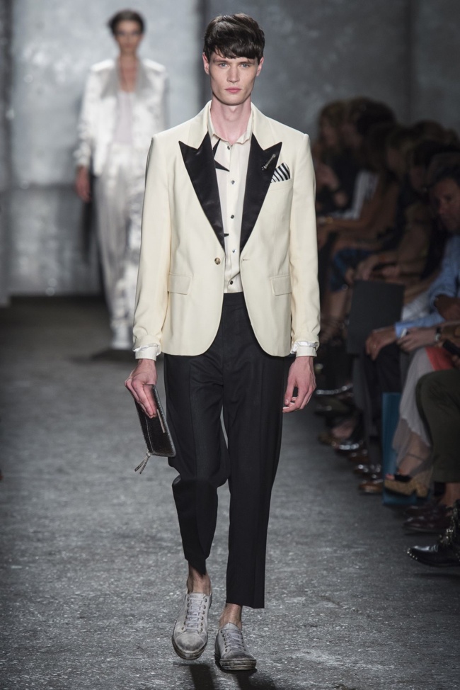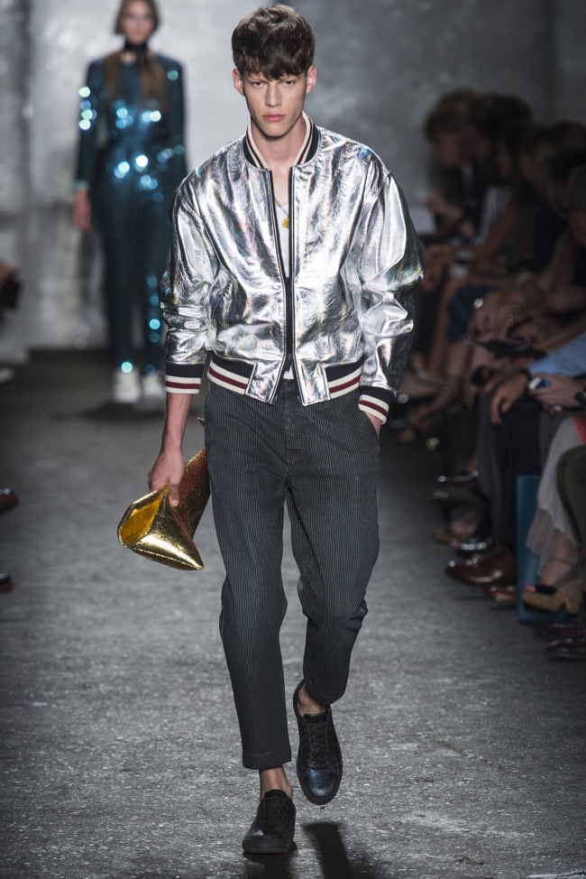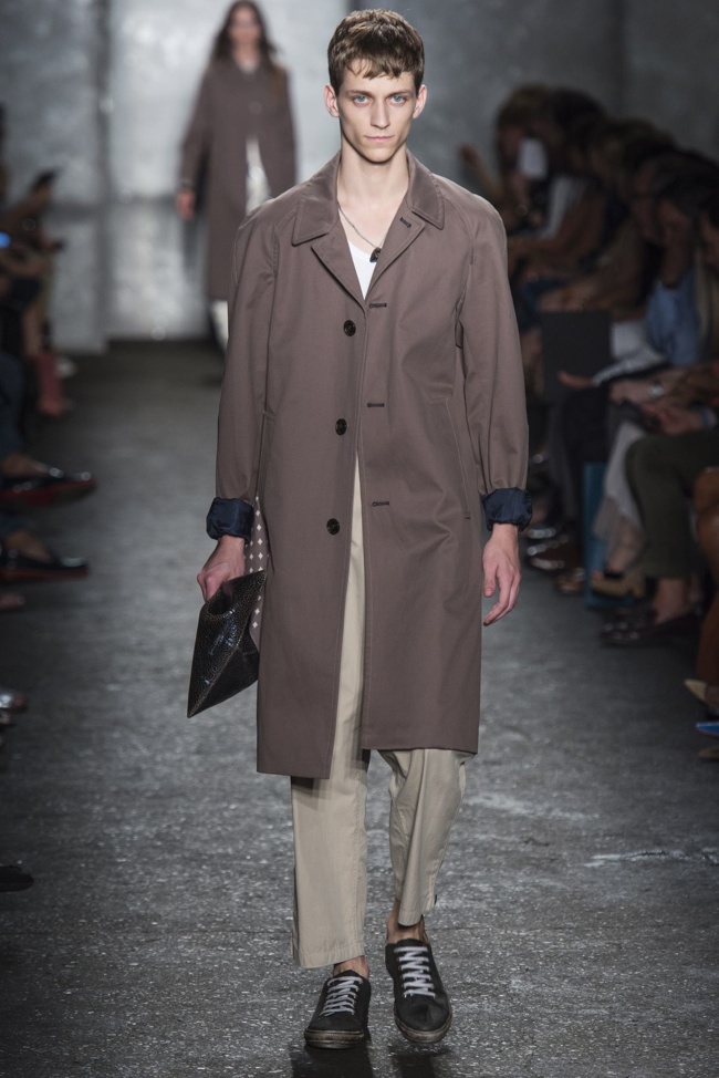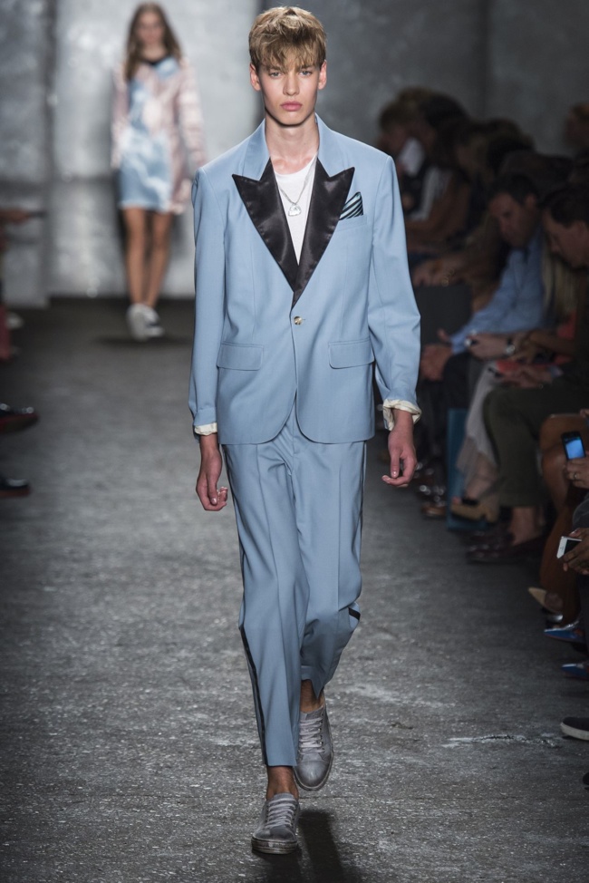 The 90s continue to make a comeback with Marc by Marc Jacobs’ spring/summer 2014 collection. Offering a relaxed guide to the season, the outing simplifies style with a lineup dominated by suiting and smart sportswear. Cutting a large lapel and loosening the fit, jackets and trousers are instantly comfortable. Classic menswear trademarks like the pinstripe suit become a young staple with the collection’s laid-back attitude. Amplified by silk bombers and short-sleeve printed button-downs, Marc by Marc Jacobs hones in on a cool nonchalance.