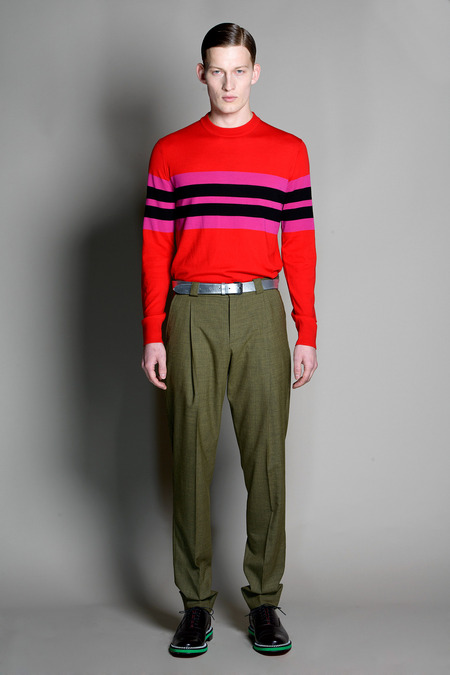 Jonathan Saunders spent part of the summer in Barcelona art directing The Visitor, a short film by Justin Anderson, which details the sexual impact the arrival of a young stranger has on a dysfunctional family. It’s a take, in other words, on Pasolini’s Theorem, which made Saunders very happy because he loves the director. The most striking effect, however, was achieved when Saunders laboriously hand-colored a precious Arts and Craft-style print in felt-tip pen, then wrapped it in bands of bleach. He had no clue at all how it would turn out. “Vandalizing,” he called it. So it is already one of Fall 2014’s happiest accidents that, cut into a blouson and pants, the result was so damn desirable. The presentation of Jonathan Saunders at London Fashion Week.