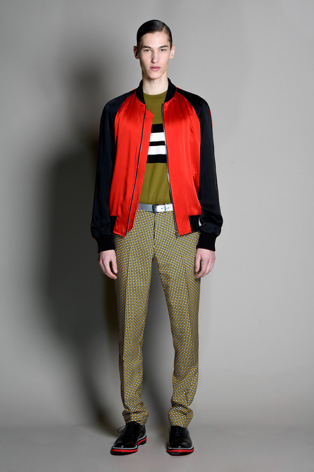 Jonathan Saunders spent part of the summer in Barcelona art directing The Visitor, a short film by Justin Anderson, which details the sexual impact the arrival of a young stranger has on a dysfunctional family. It’s a take, in other words, on Pasolini’s Theorem, which made Saunders very happy because he loves the director. The most striking effect, however, was achieved when Saunders laboriously hand-colored a precious Arts and Craft-style print in felt-tip pen, then wrapped it in bands of bleach. He had no clue at all how it would turn out. “Vandalizing,” he called it. So it is already one of Fall 2014’s happiest accidents that, cut into a blouson and pants, the result was so damn desirable. The presentation of Jonathan Saunders at London Fashion Week.