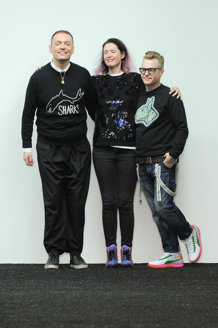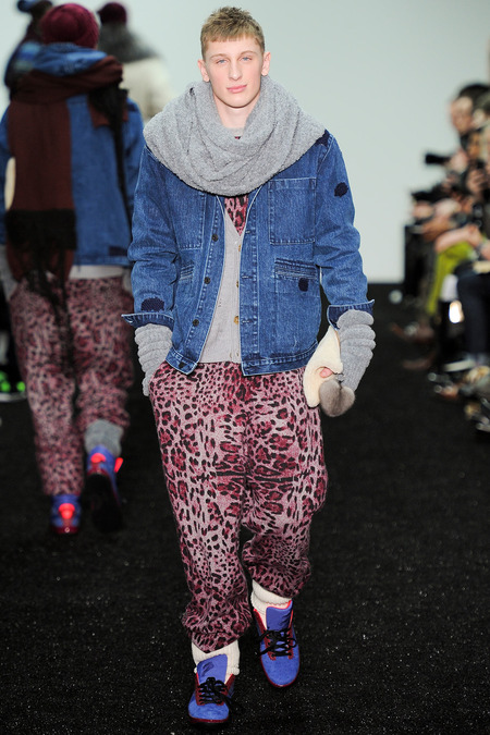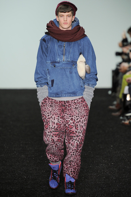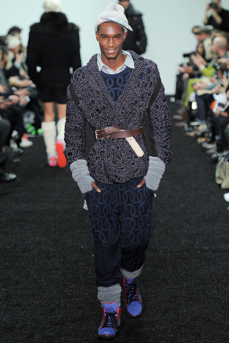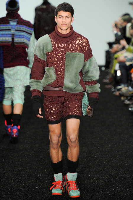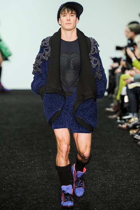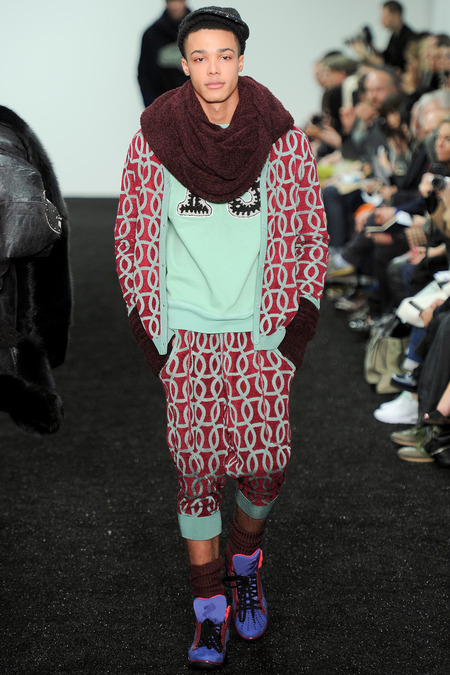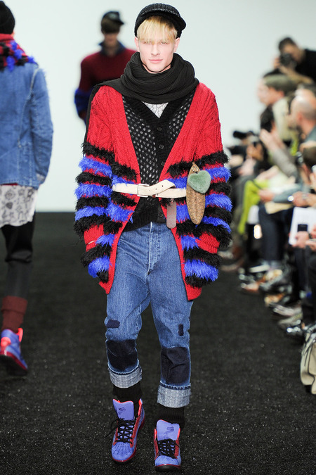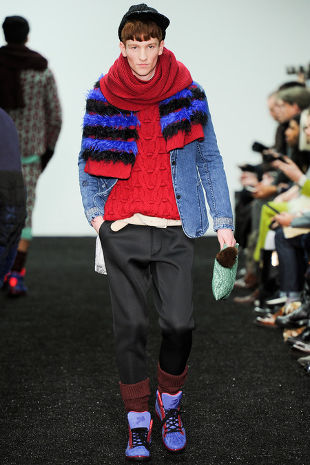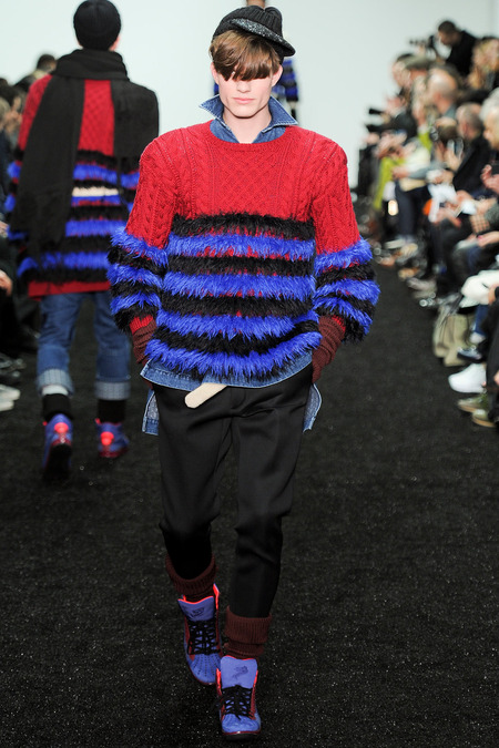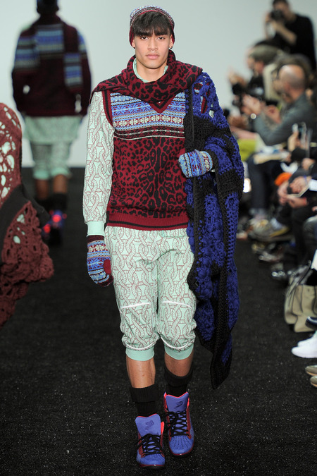 Sibling is a knitwear-specific triumvirate of Sid Bryan, Joe Bates and Cozette McCreery. It was launched in 2008 as an antidote to what we felt was a lack of choice in menswear knit on offer either in stores or from designers themselves. With a fun, colourful and great quality on the whole, multiples of knit so hat, scarf, jumpers, cardigans, joggers, socks, and gloves for this Fall/Winter 2014 Collection at London Collection Menswear.