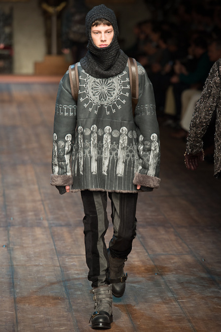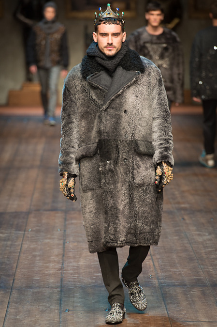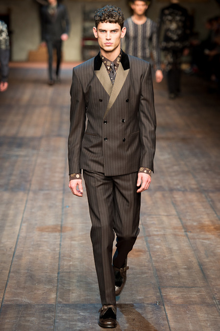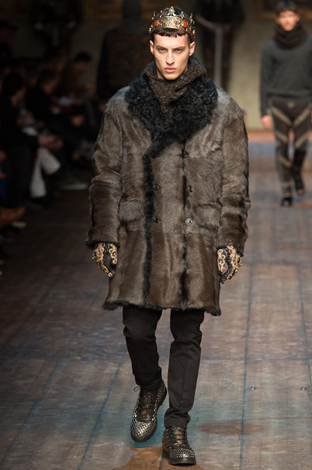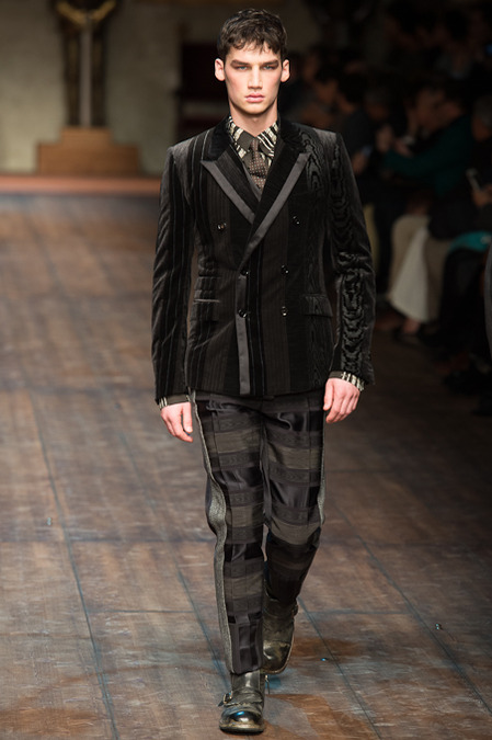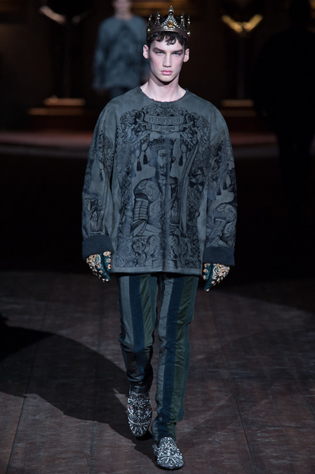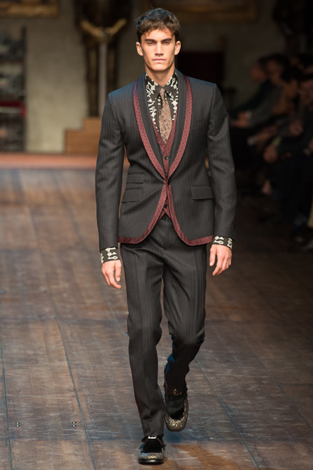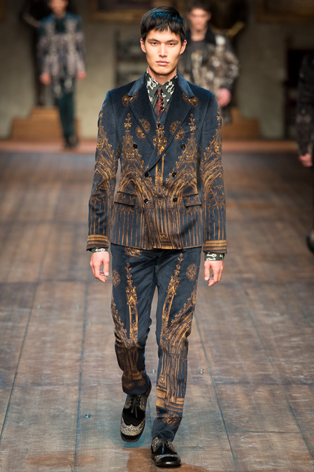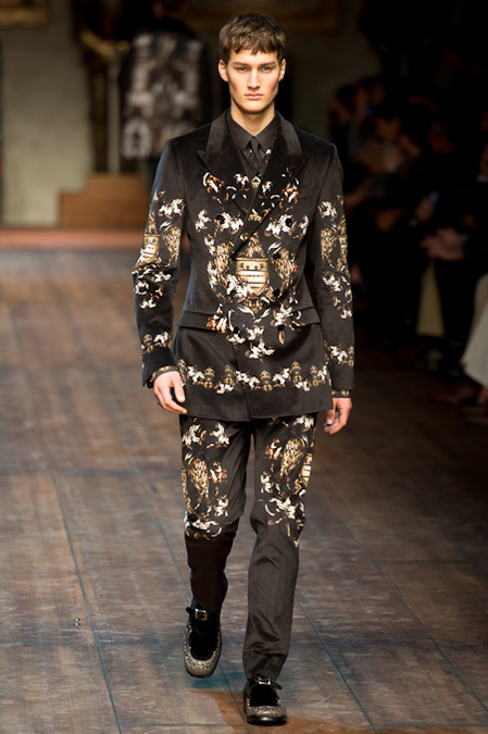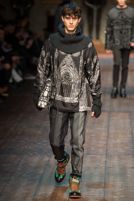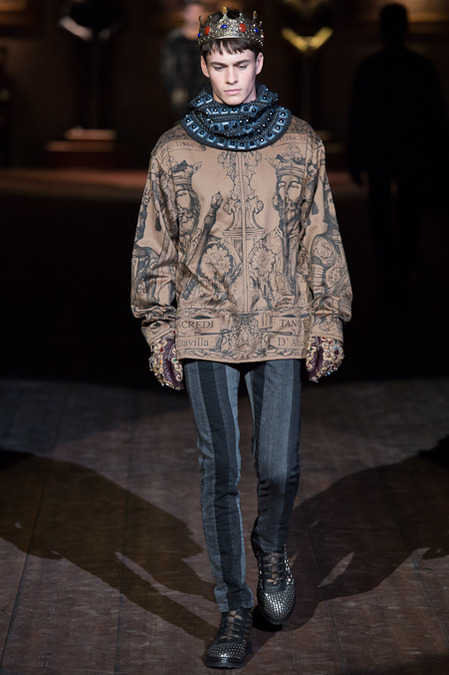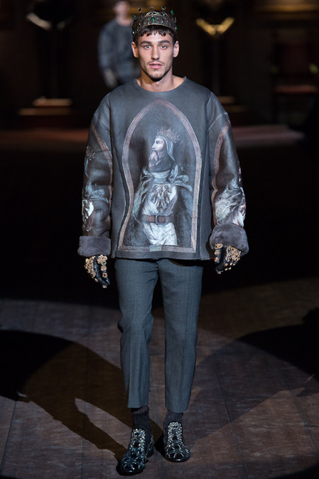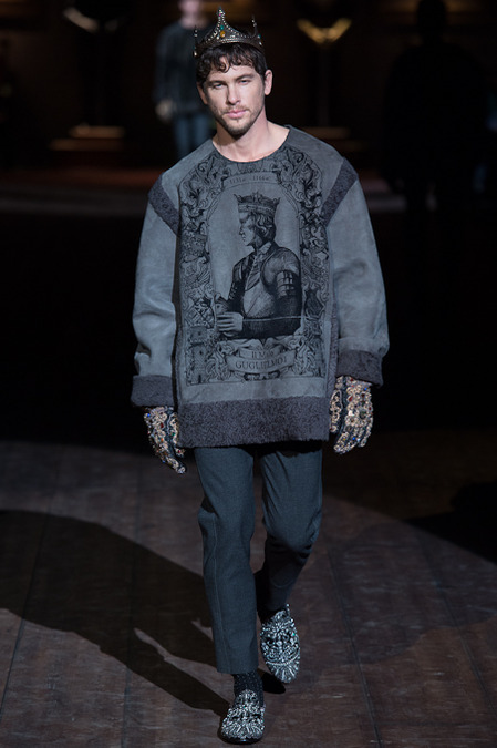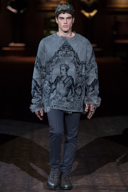 Dolce & Gabbana presented its Fall/Winter 2014 collection during Milan Fashion Week, taking inspiration from the Norman Kings Ruggero I, Ruggero II, William I, William II, Tancredi, Henry VI, Federico II and Manfredi as well as from the architecture of Norman Sicily as seen in Palermo in the Norman Building, the Cathedral and the Church of the Martorana.