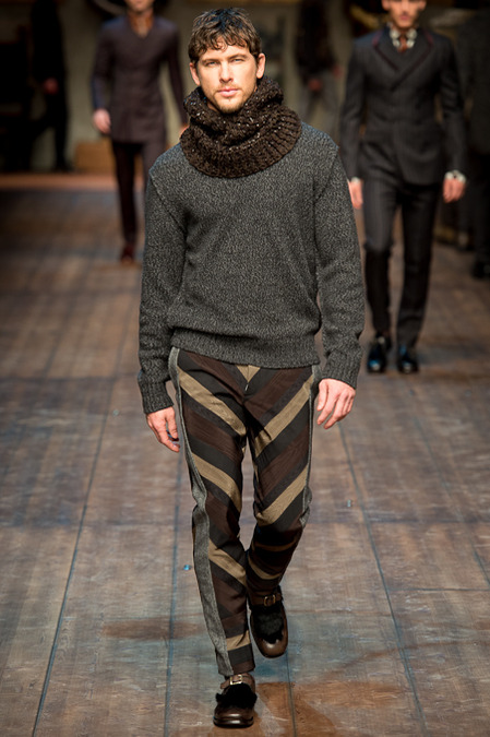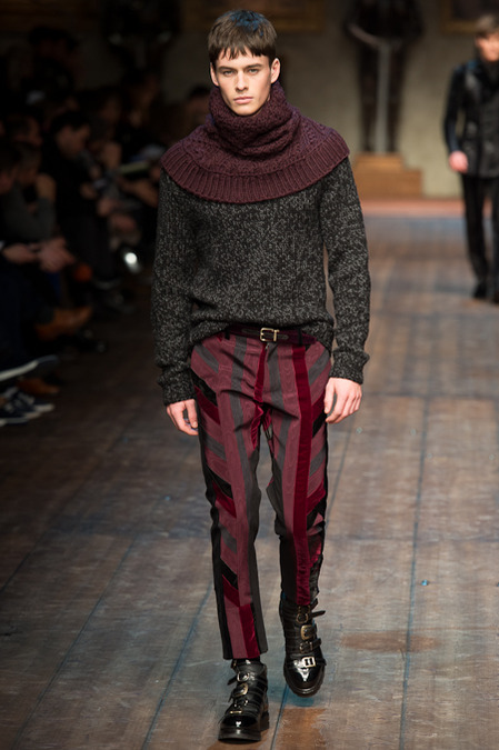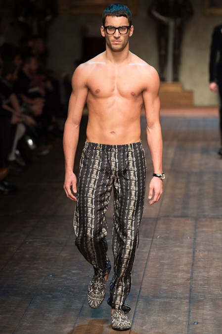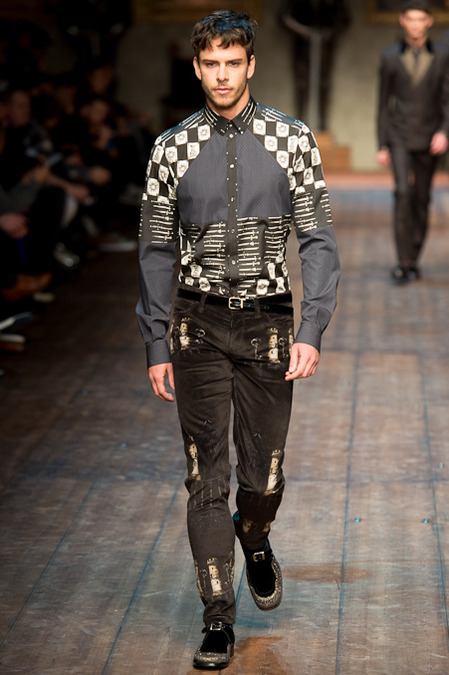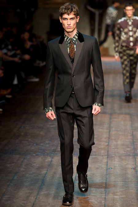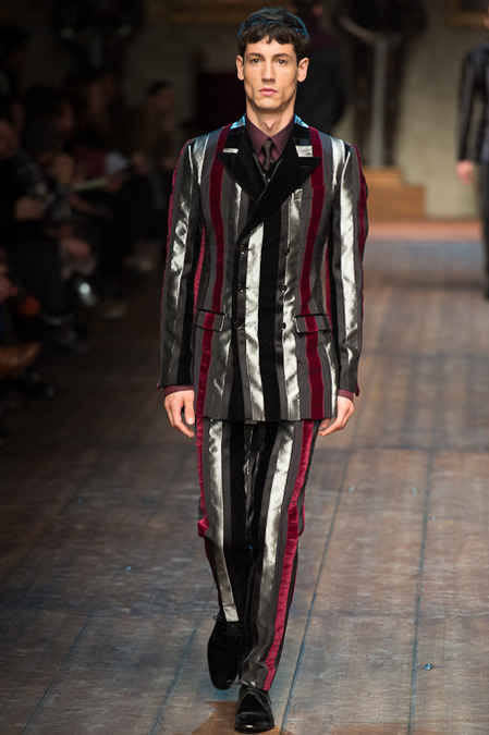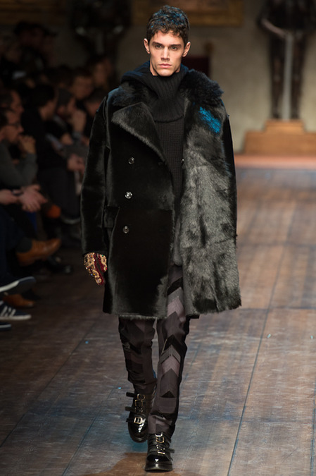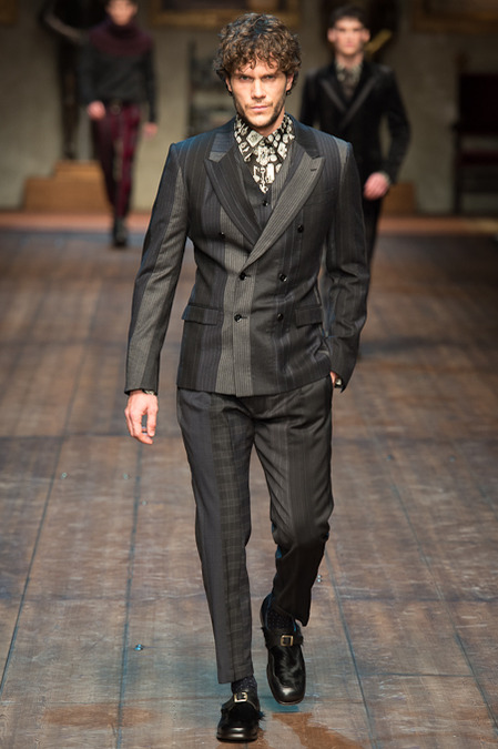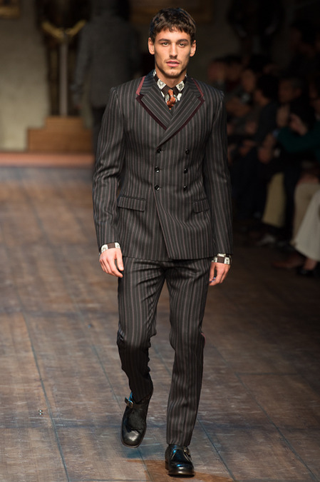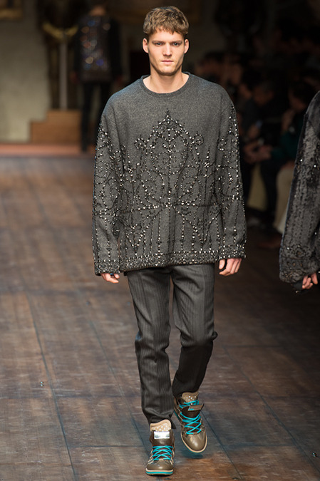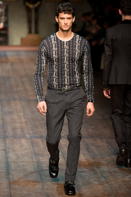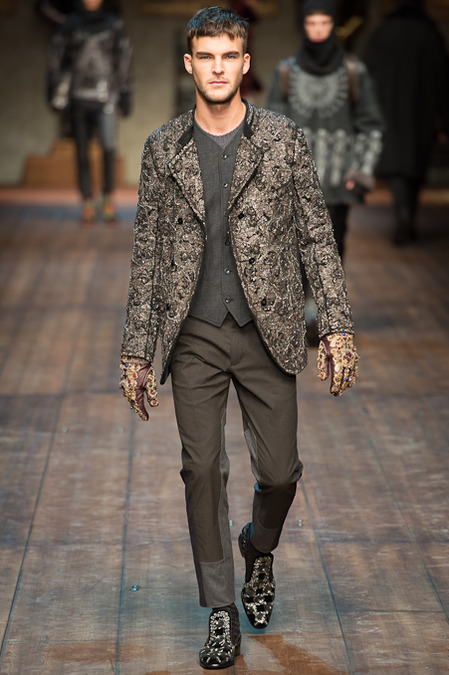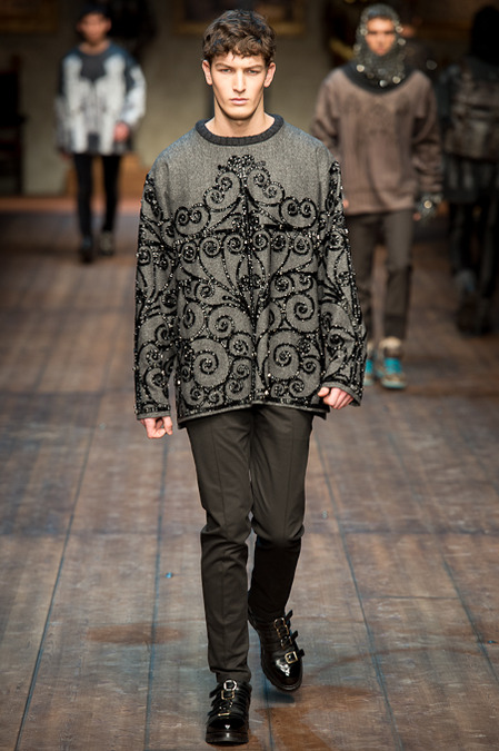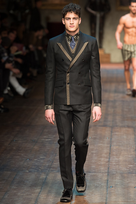 Dolce & Gabbana presented its Fall/Winter 2014 collection during Milan Fashion Week, taking inspiration from the Norman Kings Ruggero I, Ruggero II, William I, William II, Tancredi, Henry VI, Federico II and Manfredi as well as from the architecture of Norman Sicily as seen in Palermo in the Norman Building, the Cathedral and the Church of the Martorana.