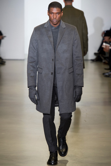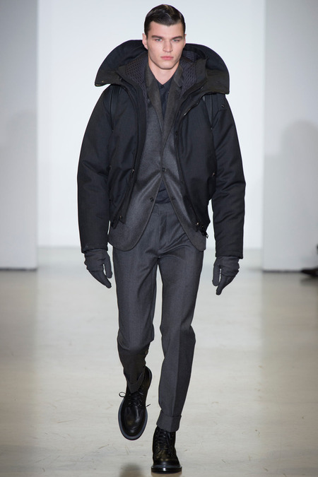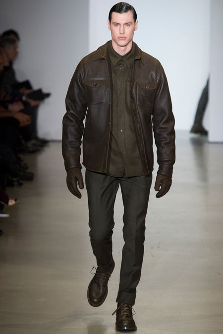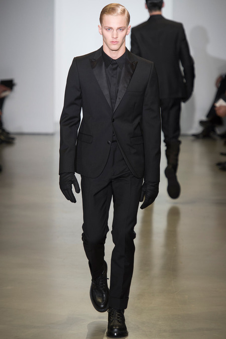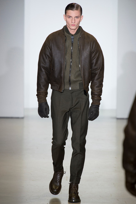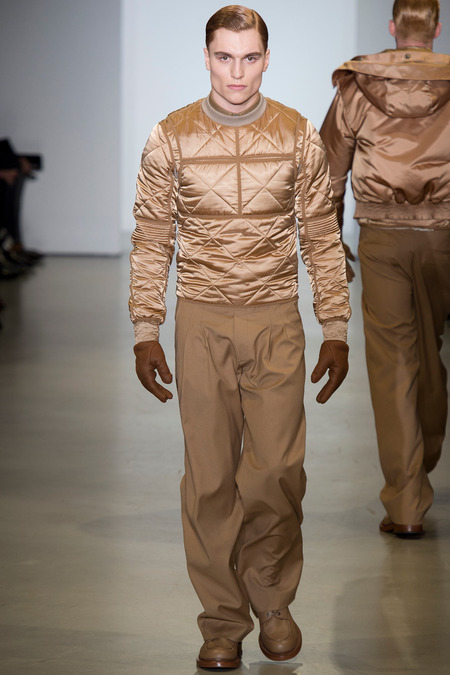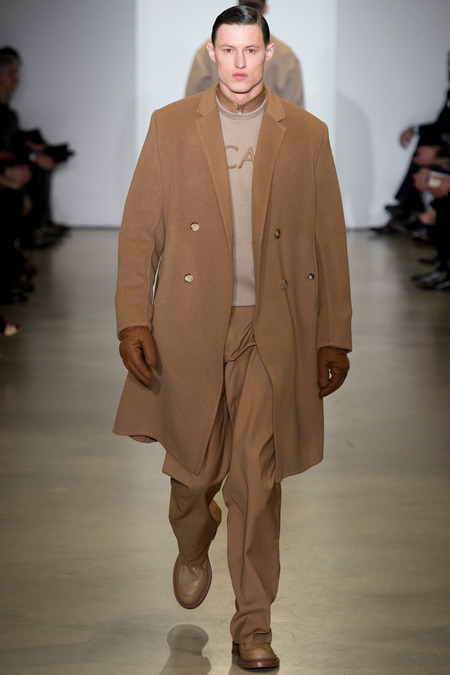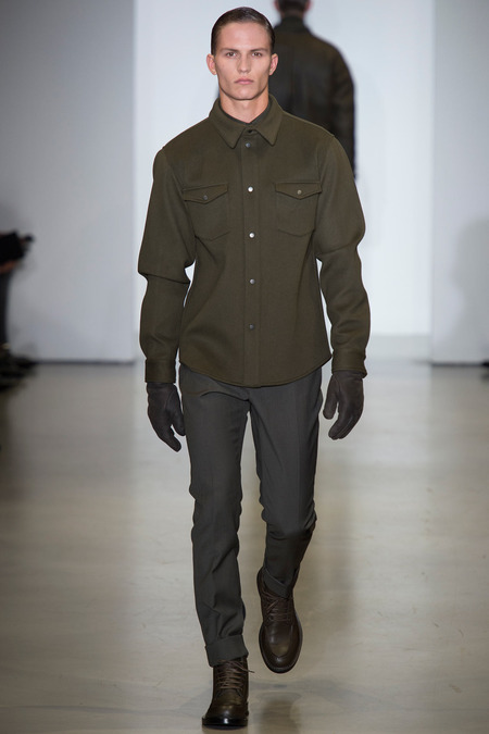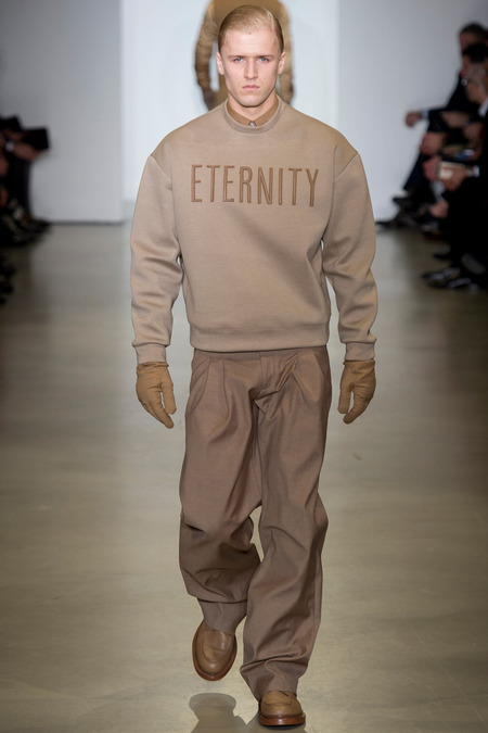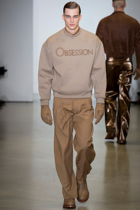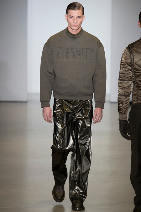 Italo Zucchelli presented his Fall/Winter 2014 collection for Calvin Klein during Milan Fashion Week, featuring military-inspired looks and the Calvin Klein fragrance names Eternity,Obsession and Escape on oversized sweatshirts.