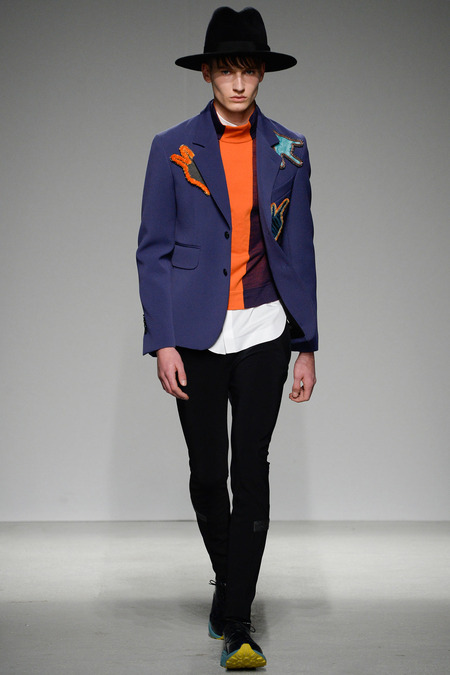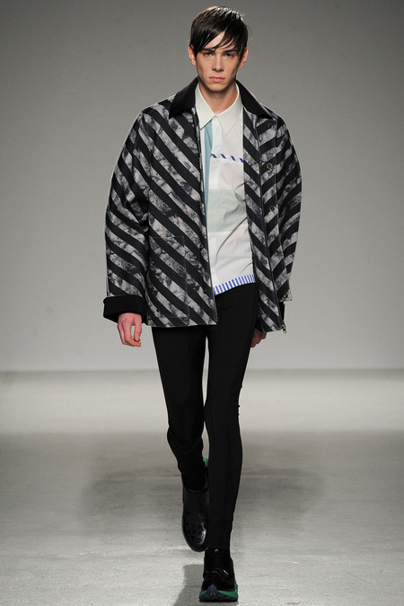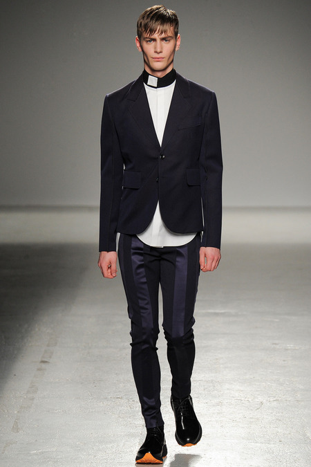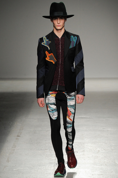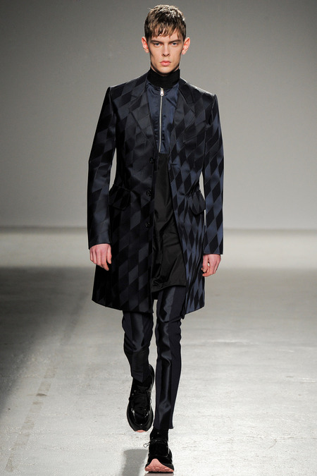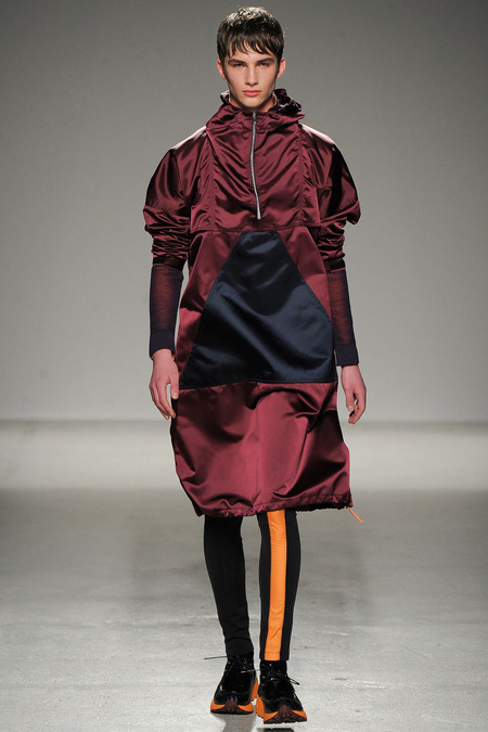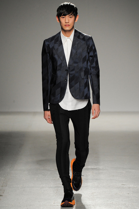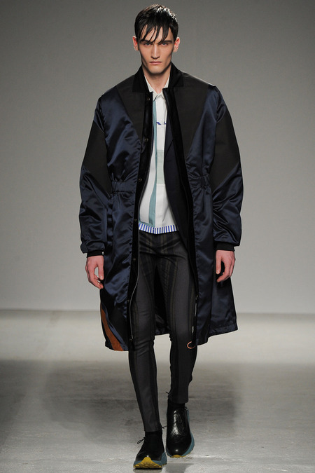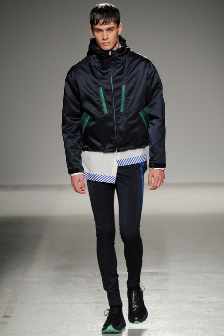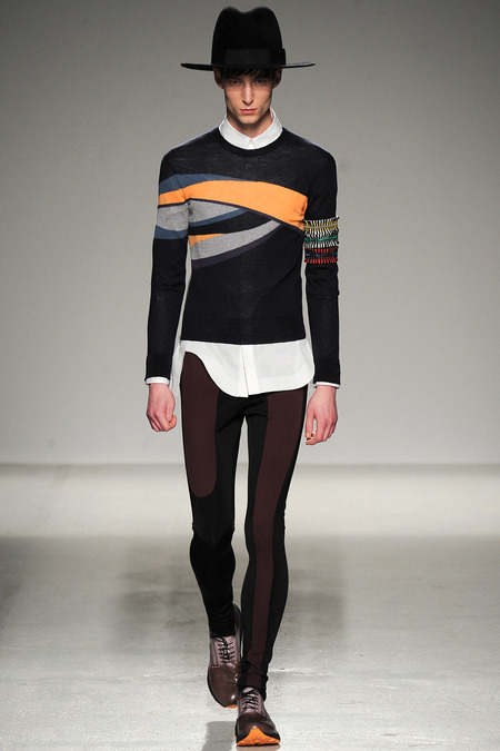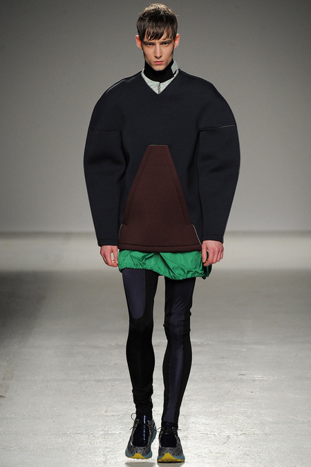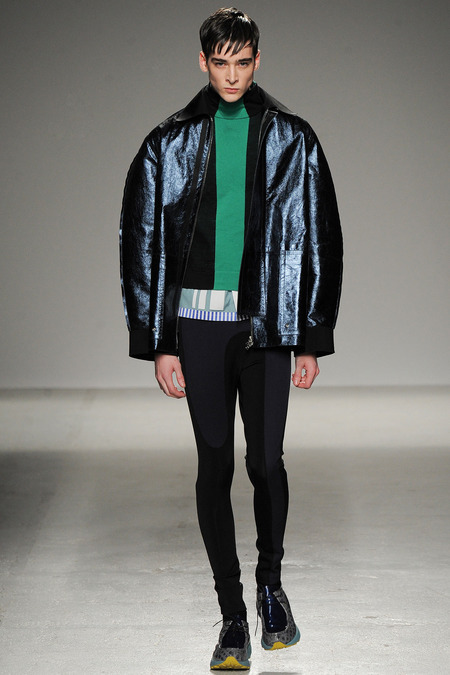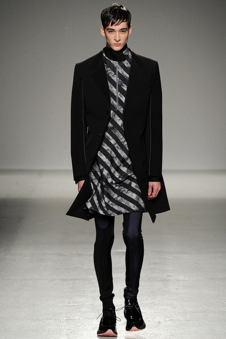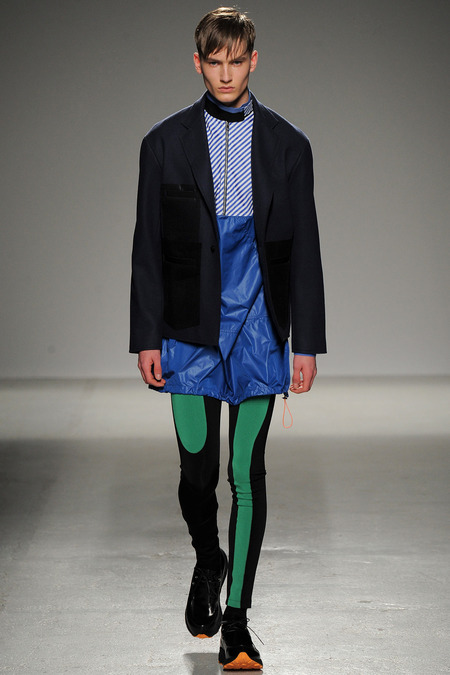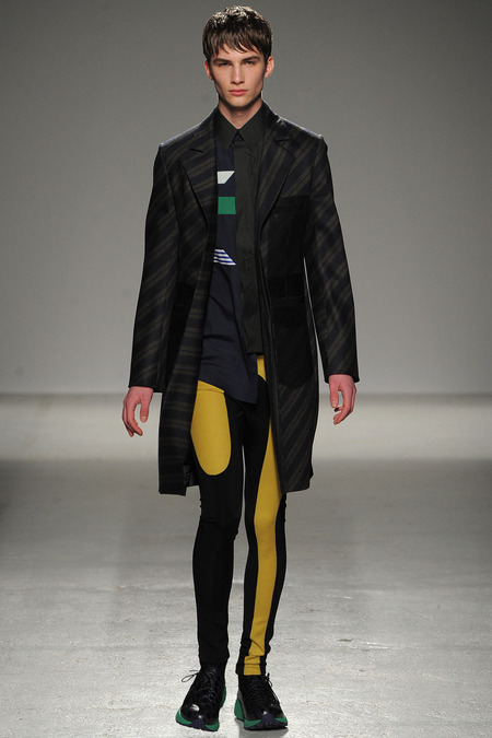 Yet if Bill Gaytten has his way, guys will be pairing dress shirts with athletic leggings and sneakers come fall. As John Galliano‘s creative director, the designer has been moving the label’s menswear more and more toward the youthful intersection of the street and sport categories. He does this cleverly by applying top-shelf fabrications to high-fashion silhouettes: foamy sweatshirts with overly rounded shoulders, satiny windbreakers and tunics like eveningwear jerseys. Gaytten also tilted the stripes on a dress shirt so that they run diagonally and create the effect of movement. Nothing, however, shifted the intensity upward as much as the knit leggings, skinnier than skinny jeans.