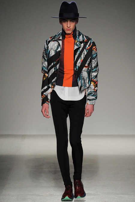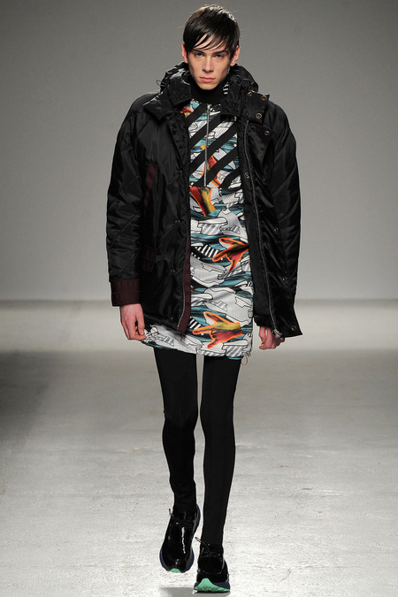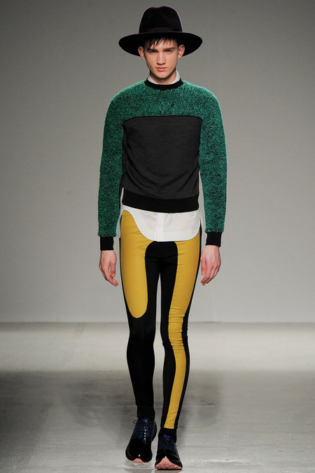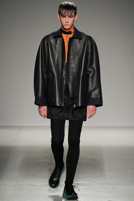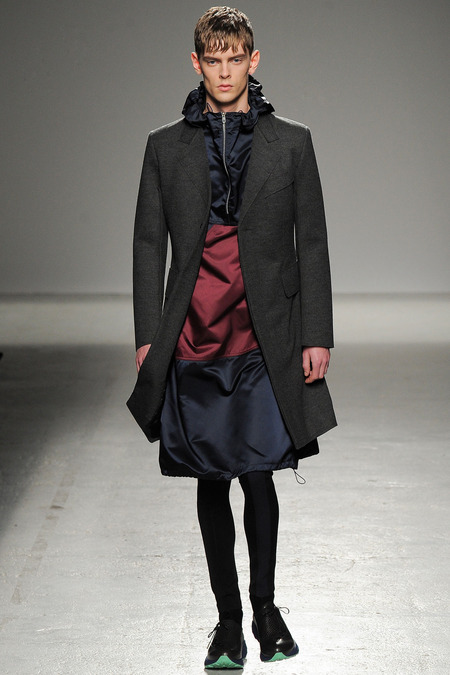 Yet if Bill Gaytten has his way, guys will be pairing dress shirts with athletic leggings and sneakers come fall. As John Galliano‘s creative director, the designer has been moving the label’s menswear more and more toward the youthful intersection of the street and sport categories. He does this cleverly by applying top-shelf fabrications to high-fashion silhouettes: foamy sweatshirts with overly rounded shoulders, satiny windbreakers and tunics like eveningwear jerseys. Gaytten also tilted the stripes on a dress shirt so that they run diagonally and create the effect of movement. Nothing, however, shifted the intensity upward as much as the knit leggings, skinnier than skinny jeans.