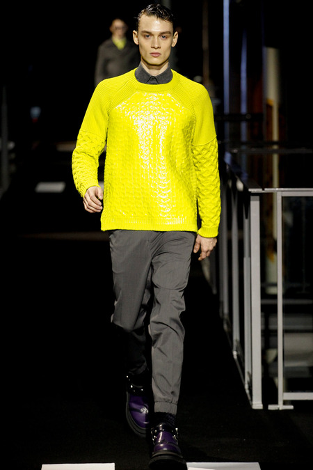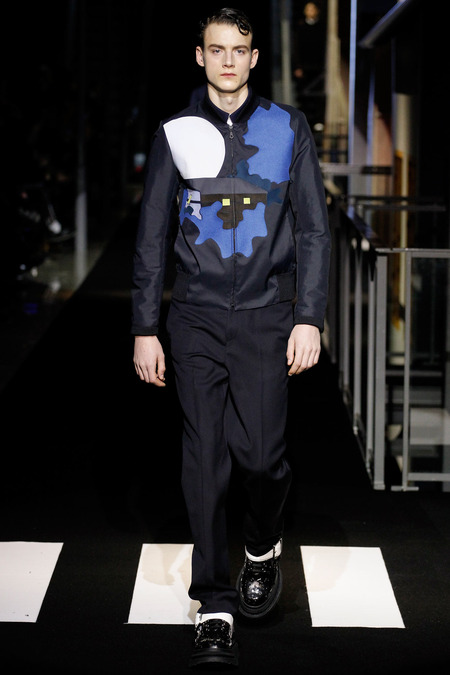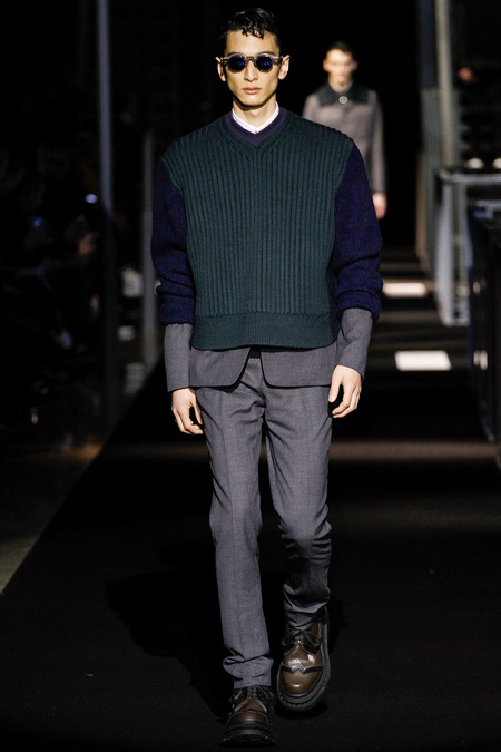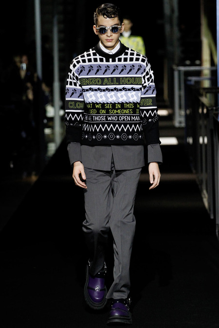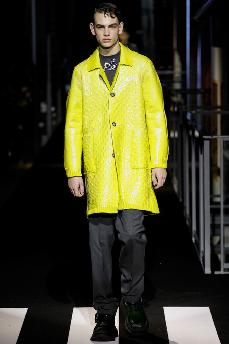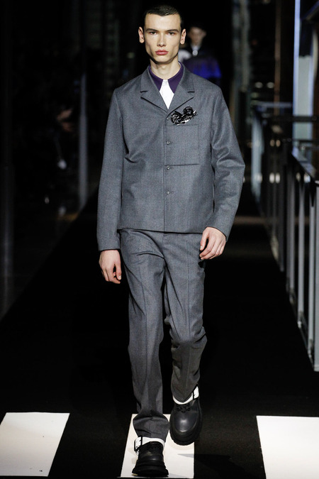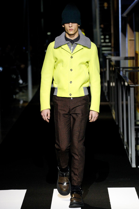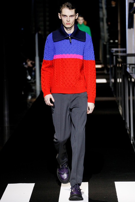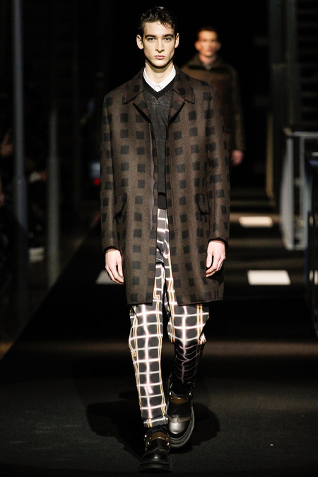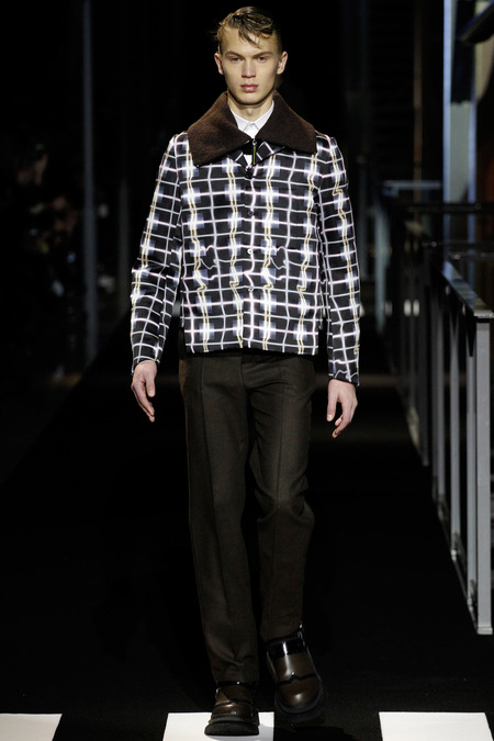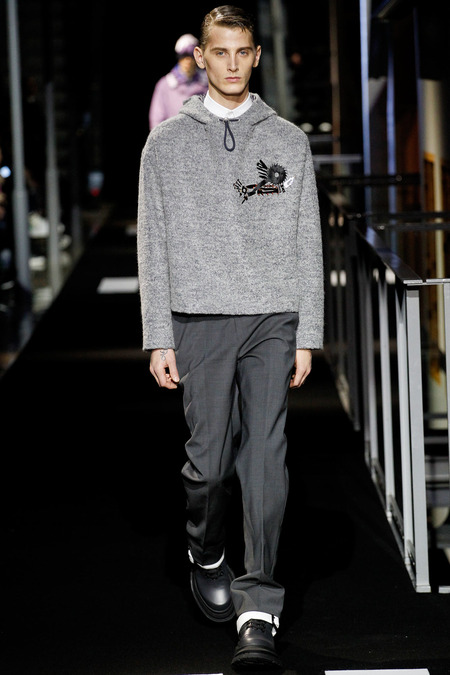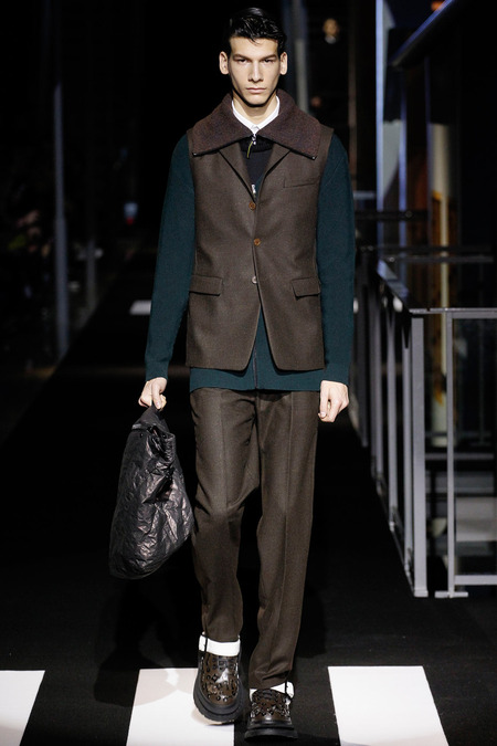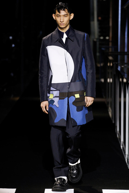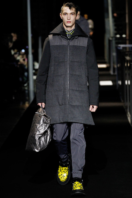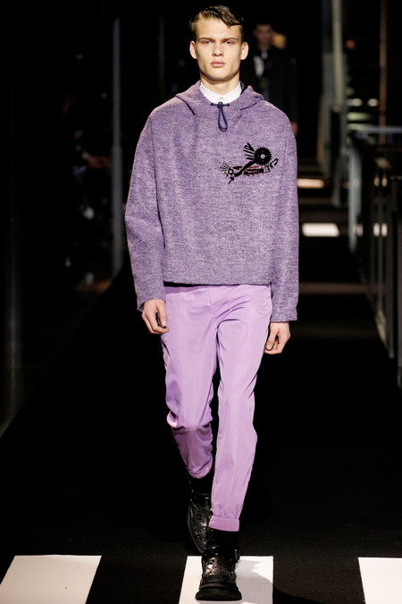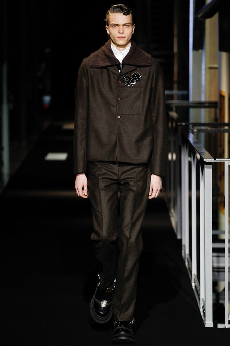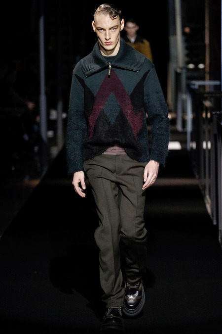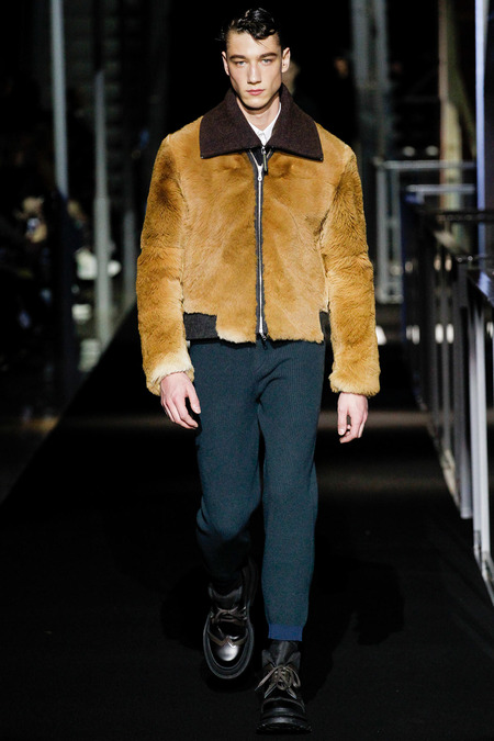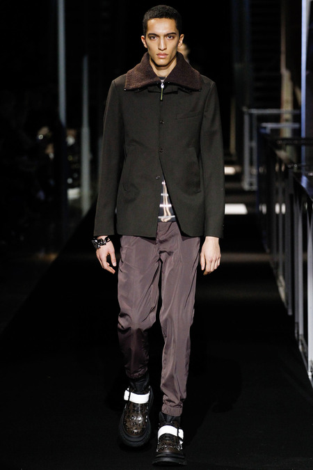 The clothes that costumed their cinematic spectacle were darker and choppier than usual: four-button jackets squared at the waist, cropped knitwear, and high straight pants in forest-floor colors of mud and leaf. The designers said they’d obsessed over the functionality of every piece, from the warmth of a down puffer to the grip of a massive-soled boot. Was it this new emphasis that gave the proceedings a more self-consciously serious air than in some seasons past? You can’t spell “function” without “fun,” but this downplayed the Kenzo pop that’s been a signature of its revival under Leon and Lim. Without it, the results weren’t as distinctively their own as usual; here and there a whiff of Prada crept in.