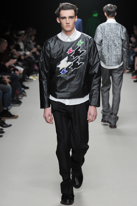 The best part of a John Baldessari piece is that you can almost hear the color land on his black-and-white photographs and photomontages with a splat. Kris Van Assche was looking at Baldessari’s work to inspire his own this season—in particular, Man Running, which gave the collection its title, Run—and a jolt of color hit Van Assche’s black-and-white looks with that same comic whomp. It was, in an entirely complimentary way, almost funny. The athletic stringency Van Assche often favors gave way to a looser-limbed bounce.