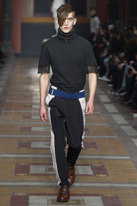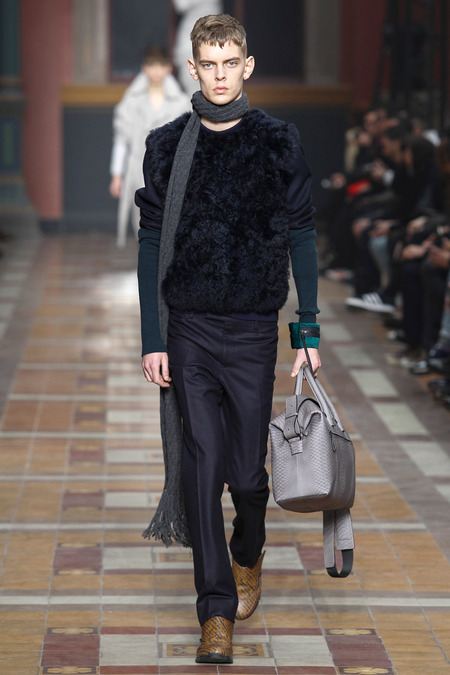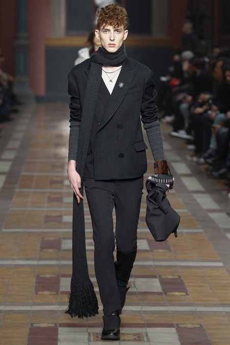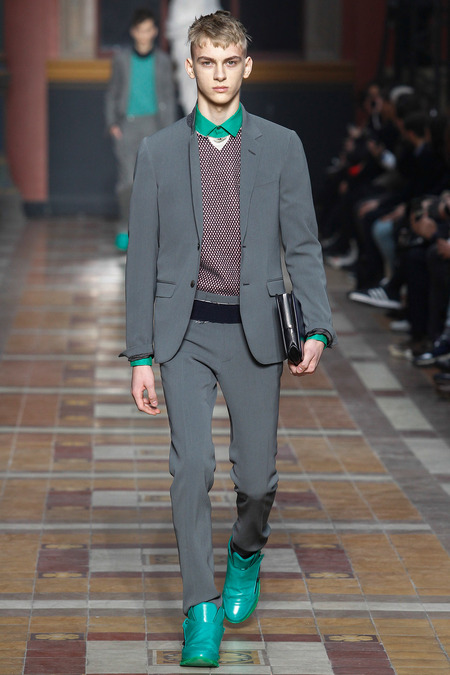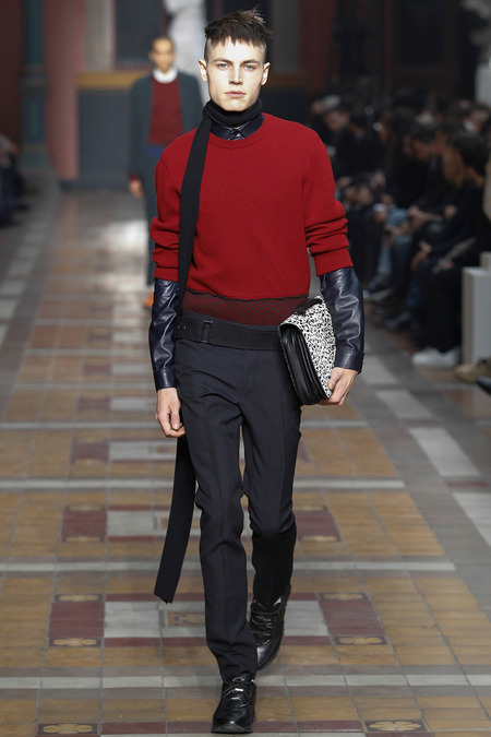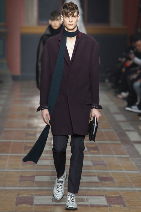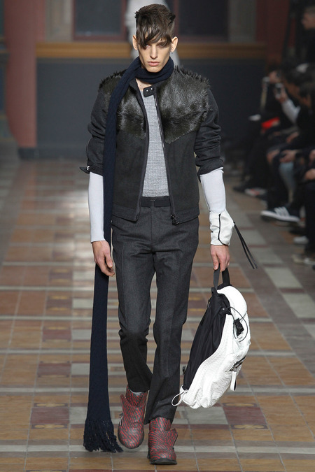 There was something downbeat about such a notion, and the models, with their Berlin side-shaves and po-faced grimness, did their level best to extend it. But their poutiness hardly dovetailed with a collection that was pretty upbeat. Elbaz insisted there was nothing nostalgic, but there were infusions of the eighties in skinny Memphis-print ties, power-pop pinkness, and graphic zap. There were linear prints, round shapes: “like us,” Elbaz joked, indicating lanky Lucas and himself. “We’re trained to think uniform,” he added, so he was keen to underscore the collection’s commitment to individuality. In actual fact, what was on parade were some of the season’s key trends, like major coats in every conceivable silhouette, and fur used as a decorative element (one particular panel of pony erupted into a spine of hair across the shoulder of a jacket).