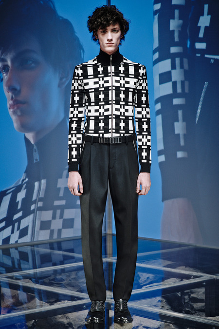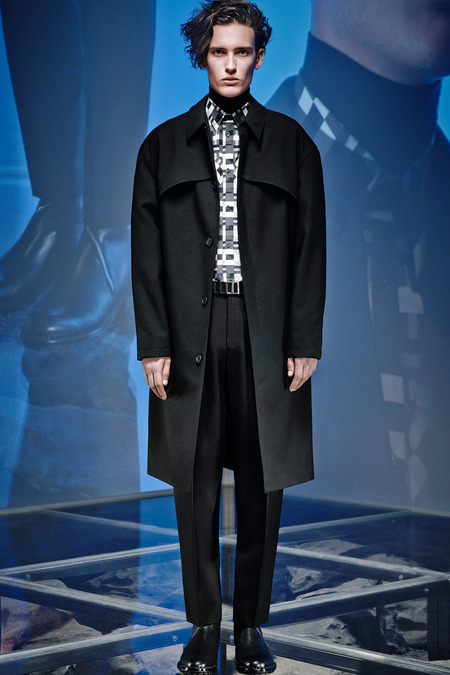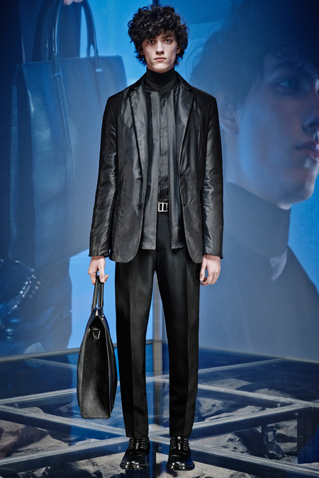 As usual, the collection was rounded out by evergreens that raise no questions at all: Leather jackets, including an especially streamlined version in elephant gray; sharp-shouldered suiting; and a cool double-breasted formal coat tweaked every so slightly by the outsize addition of grosgrain on its lapels.