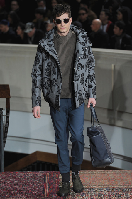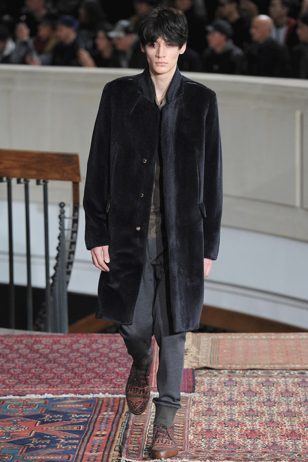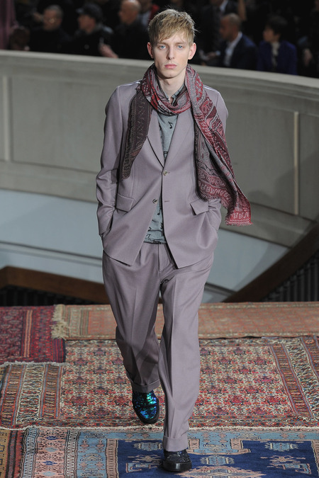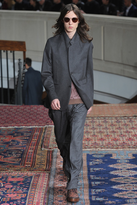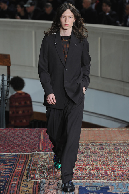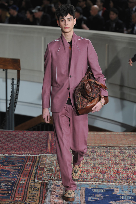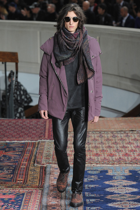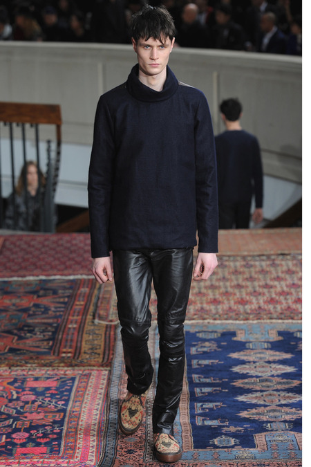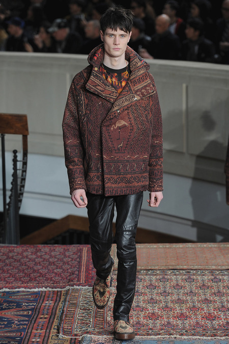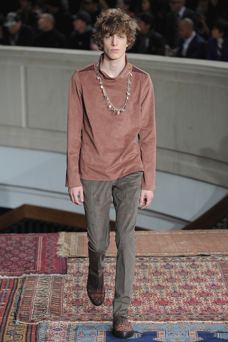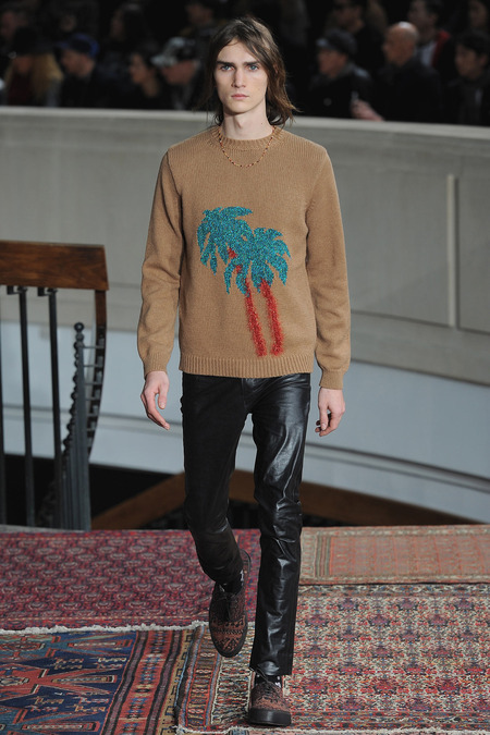 Smith was equally adamant that his vaguely ethnic rug patterns had been custom-designed to include the music motifs, all while underscoring hand-craftsmanship as a necessary constituent of the collection’s soul. Not that the look struggled to express personality; a leather hooded sweatshirt and tie-dyed jogging pants proposed yet another spin on men’s loungewear. Smith also wasn’t wrong to think that men welcome sequined sneakers (although the similarly shimmery Western shirt skewed more Mick than Jim). Smocks with tearaway side snaps seemed radically proportioned by Smith’s standards. But then he reminded us that he put David Bowie in a dramatic pair of trousers 30 years ago, which makes you realize he doesn’t exercise his feisty side enough. Or when he does, it usually plays out as pop—i.e. sweaters fronted with a large Lurex flamingo or a pair of palm trees (symbolizing the neon road signs of Morrison’s California years). Picturing Morrison in a cashmere robe coat and papery leather pants seemed just about right.