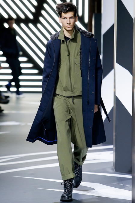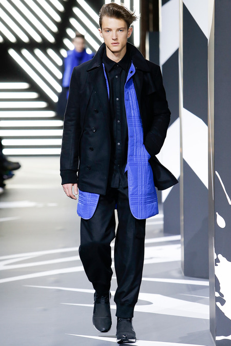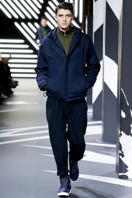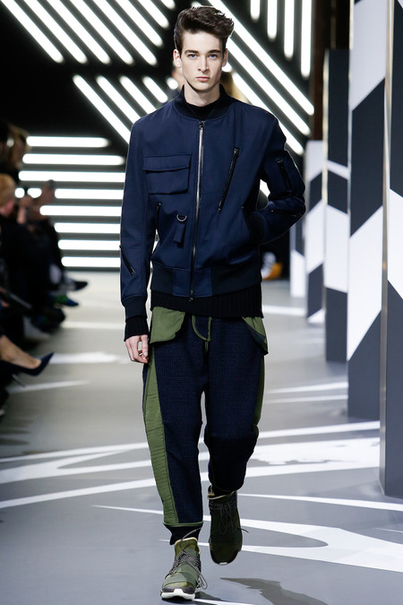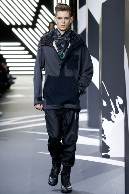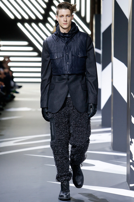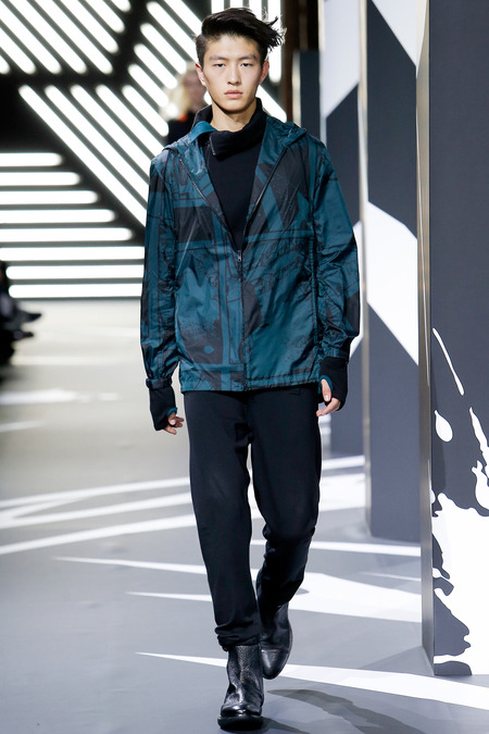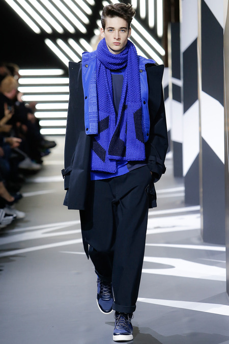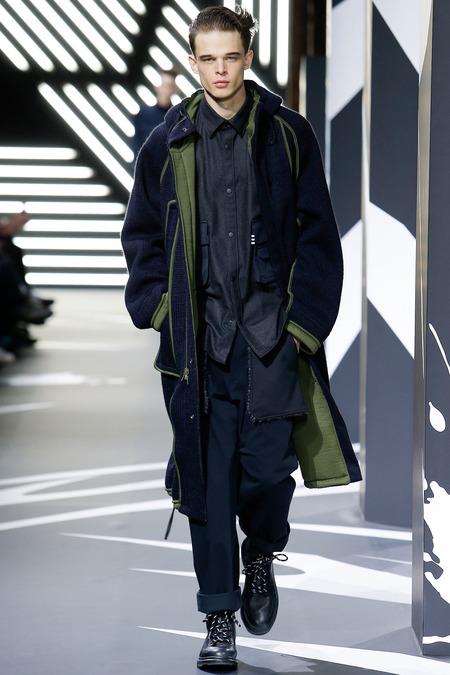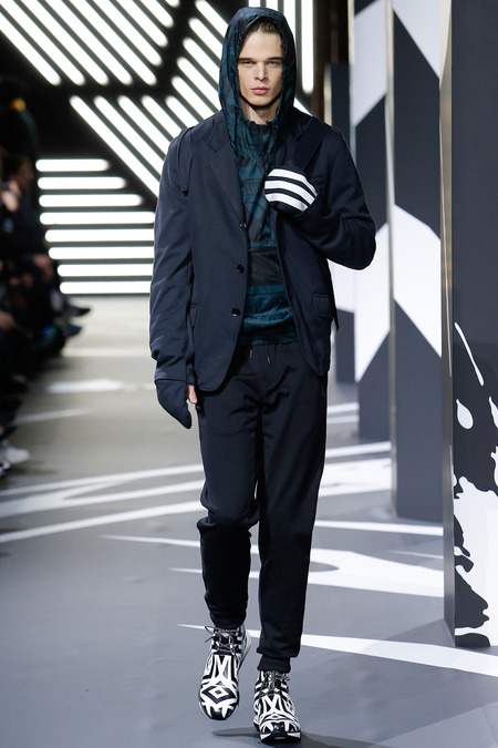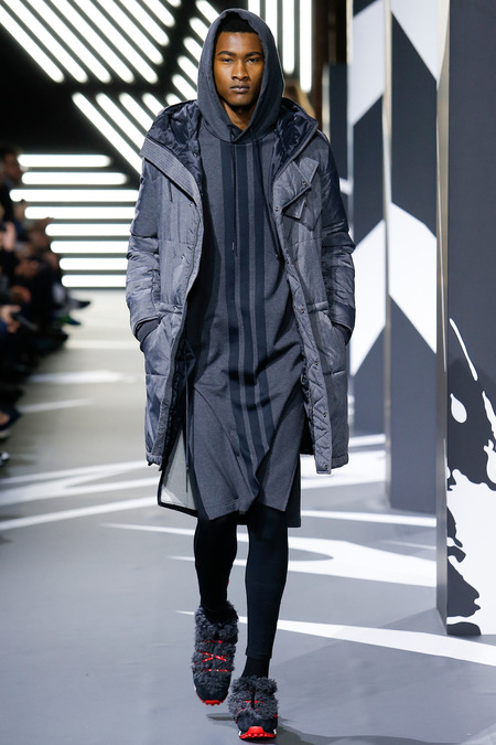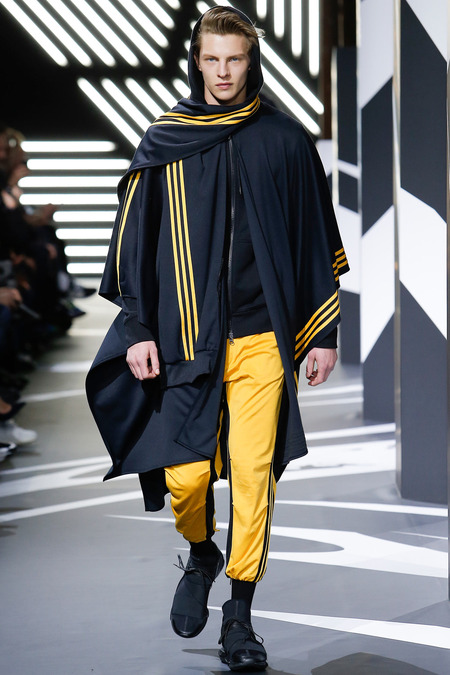 Of course the landscape has changed since Y-3 came to be a decade ago. (The ubiquity of Raf Simons’ multicolored Adidas trainers in the audience alone reminded you that fashion/sport collaborations are now considered a given, not a novelty.) Still, Yamamoto and Y-3 acquitted themselves ably. In the thick of a long and product-heavy collection, play with proportion—a nod, according to the label, to sixties couturiers—set the showpieces apart. Striped hoodies were stretched into tunics, gym shorts into sarouel pants, and a track jacket into a wrapped blanket-cum-poncho, debonair enough for a corsair. If clothes make the man, capes makes the hero.