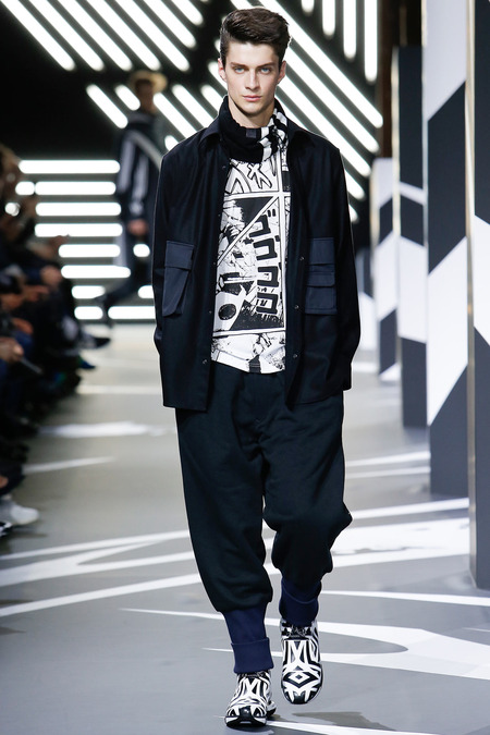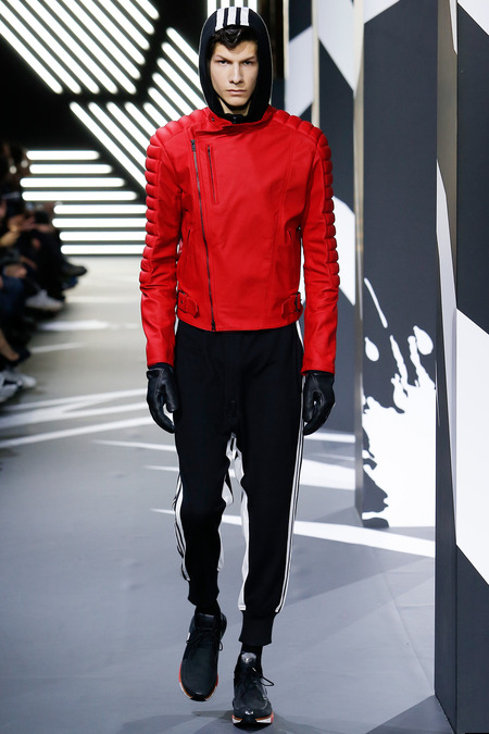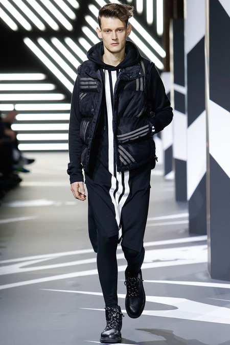 Of course the landscape has changed since Y-3 came to be a decade ago. (The ubiquity of Raf Simons’ multicolored Adidas trainers in the audience alone reminded you that fashion/sport collaborations are now considered a given, not a novelty.) Still, Yamamoto and Y-3 acquitted themselves ably. In the thick of a long and product-heavy collection, play with proportion—a nod, according to the label, to sixties couturiers—set the showpieces apart. Striped hoodies were stretched into tunics, gym shorts into sarouel pants, and a track jacket into a wrapped blanket-cum-poncho, debonair enough for a corsair. If clothes make the man, capes makes the hero.