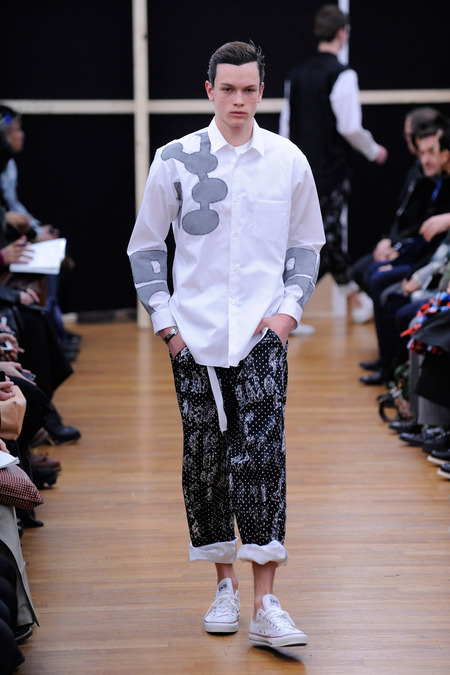 Shirt’s small show, held the day after Homme Plus, offered its seasonal variations on its fundamental theme. For Fall, pants were uniformly cropped or rolled, shirts shown entire; the sense pervades that tucking one in would amount to a violation. (CDG is nothing if not strict in its preferences.) They are detailed with patchworking, ruffles, double plackets, and bubble-shaped appliqués that called to mind some of the details of the Homme Plus collection. The two lines are entirely distinct, Joffe said, but they do often connect with one another. “She’s the same person,” he said with a shrug.