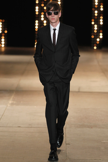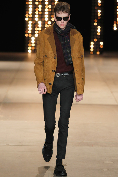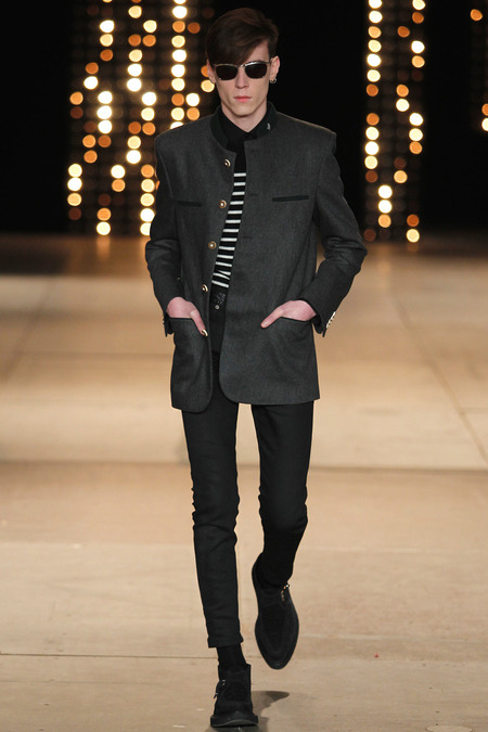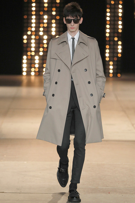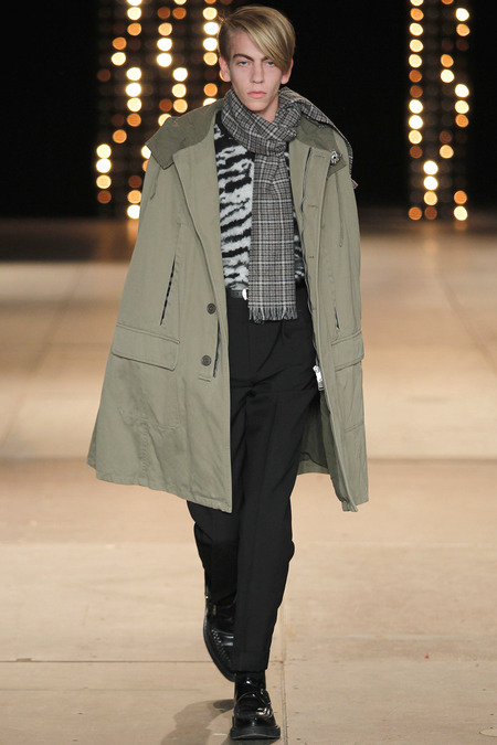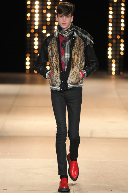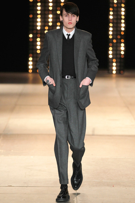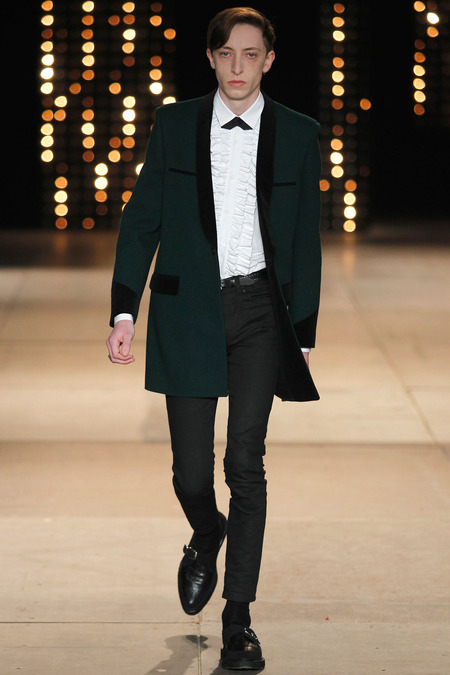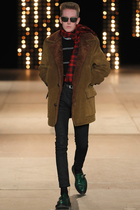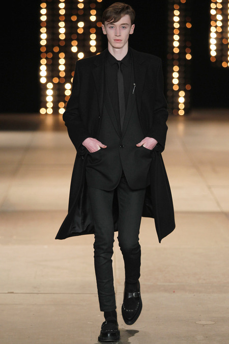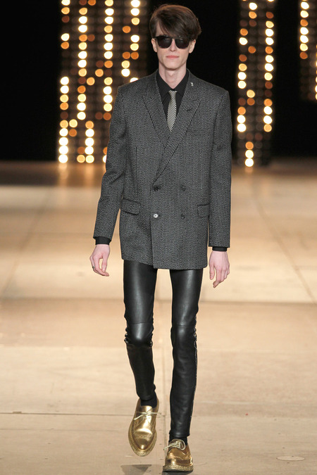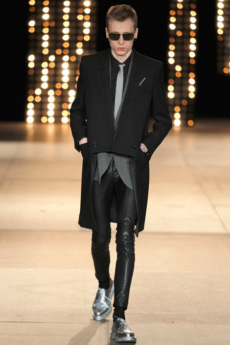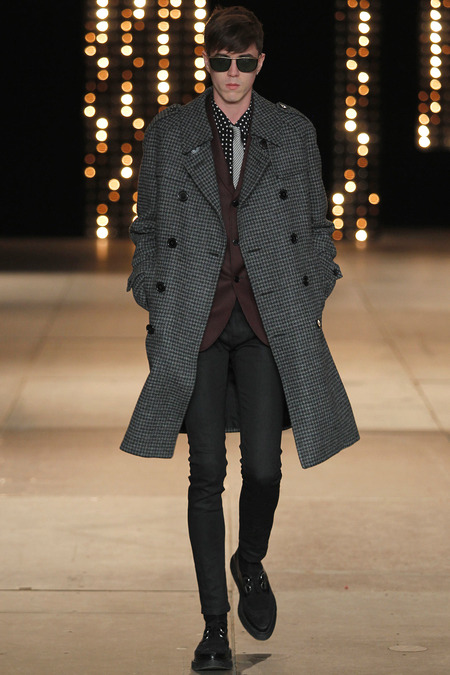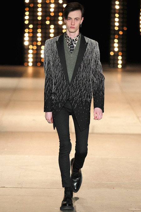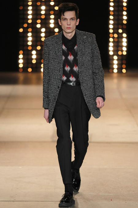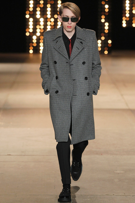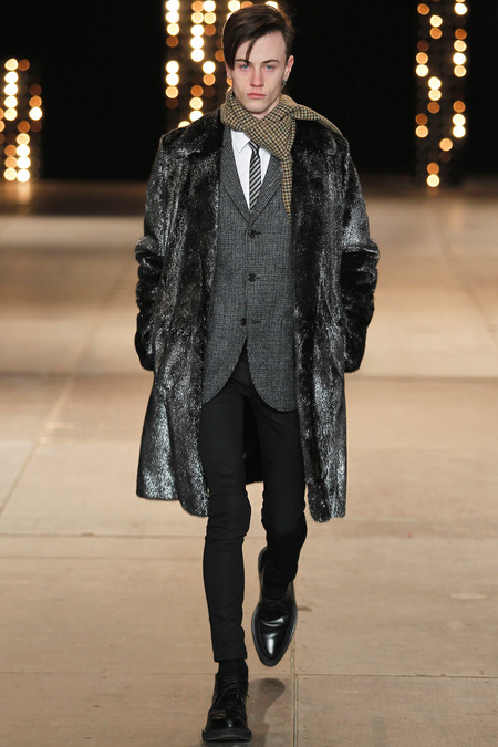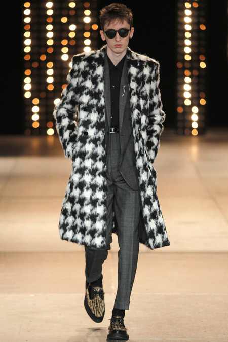 He’s their Pied Piper. His clothes speak to them. Whose legs will ever be that stovepipe-y again? Still, Slimane is a businessman as well as a designer. Tonight, he broadened his constituency with a collection that sized the tailoring up a notch, Teddy Boy rather than speed-riven punk, drape jackets rather than shrunken bumfreezers. Plus a selection of coats so gorgeous they came from outerwear heaven: digital tweed, micro-leopard print, maxi-houndstooth mohair, a stripey thing, and best of all, a herringbone that sparkled like it had been paved with sequins.