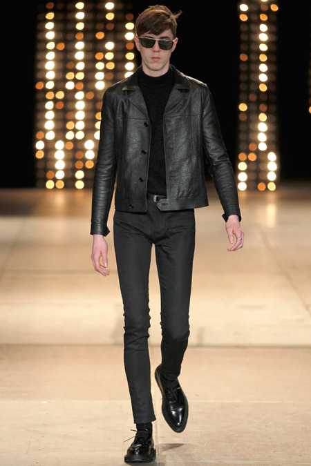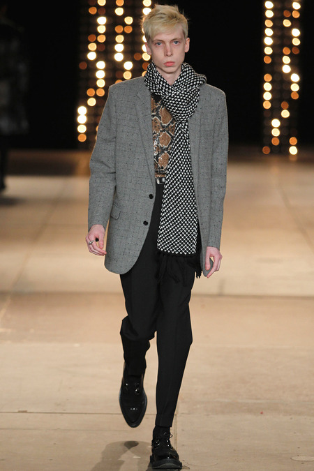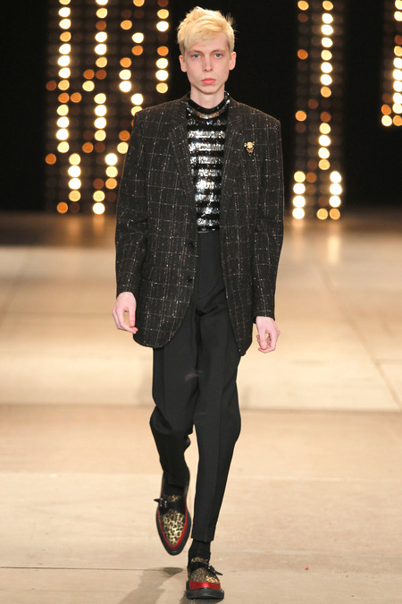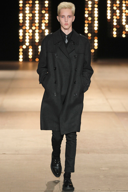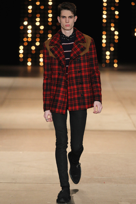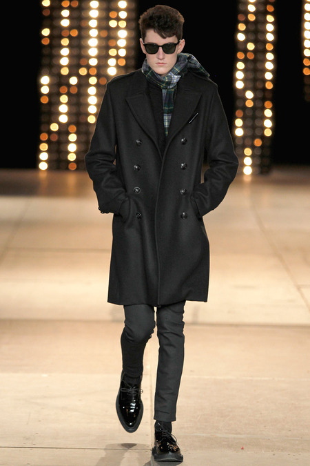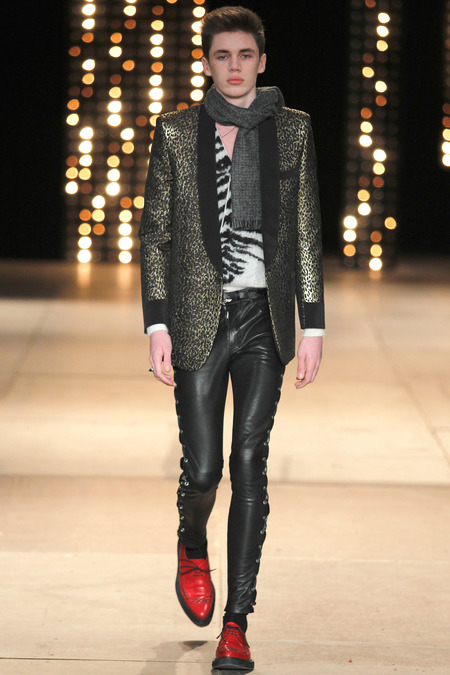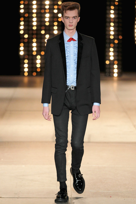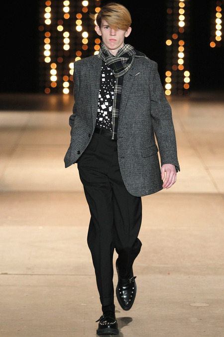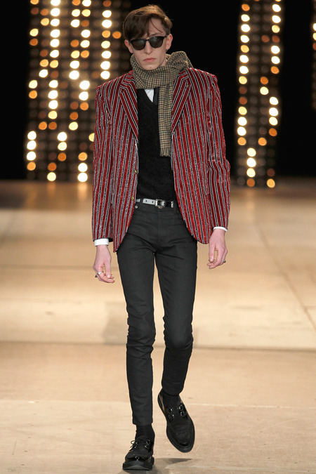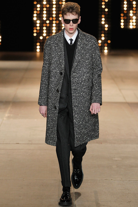 He’s their Pied Piper. His clothes speak to them. Whose legs will ever be that stovepipe-y again? Still, Slimane is a businessman as well as a designer. Tonight, he broadened his constituency with a collection that sized the tailoring up a notch, Teddy Boy rather than speed-riven punk, drape jackets rather than shrunken bumfreezers. Plus a selection of coats so gorgeous they came from outerwear heaven: digital tweed, micro-leopard print, maxi-houndstooth mohair, a stripey thing, and best of all, a herringbone that sparkled like it had been paved with sequins.