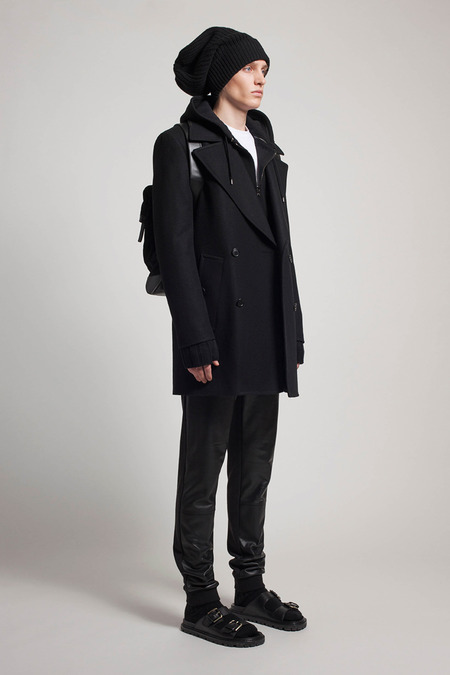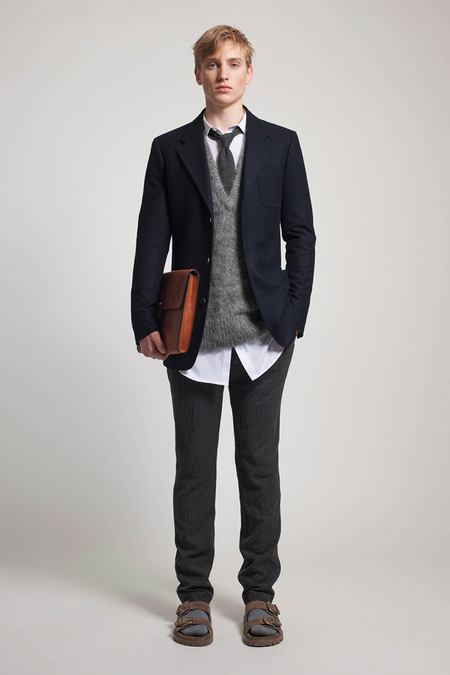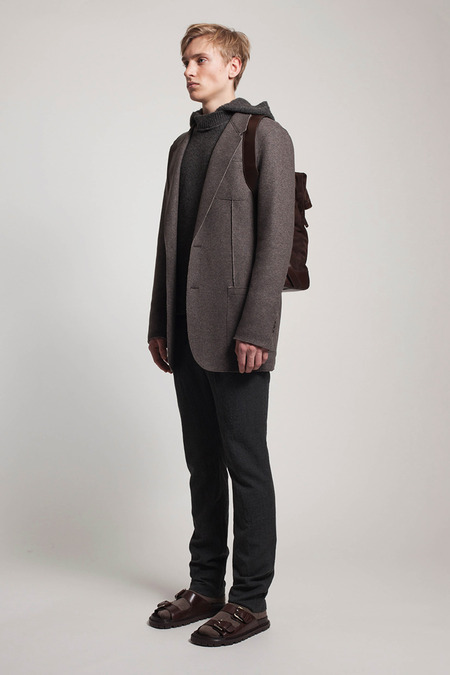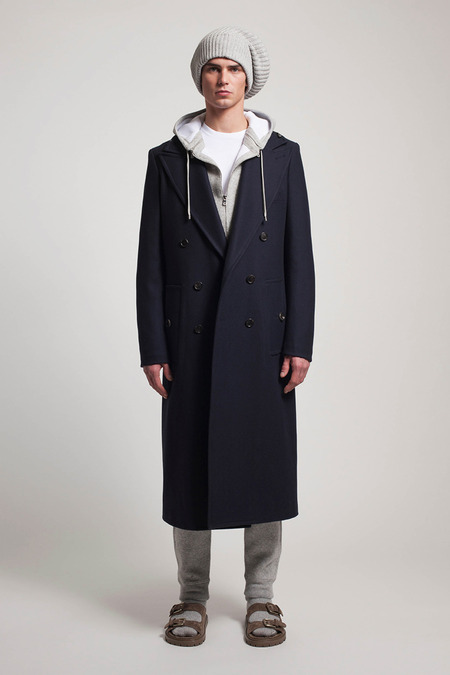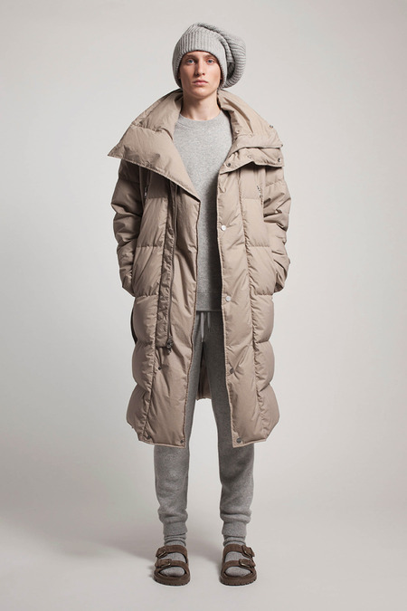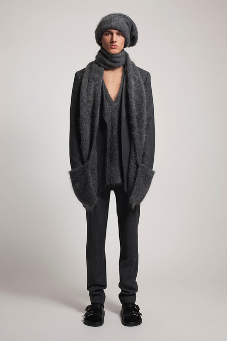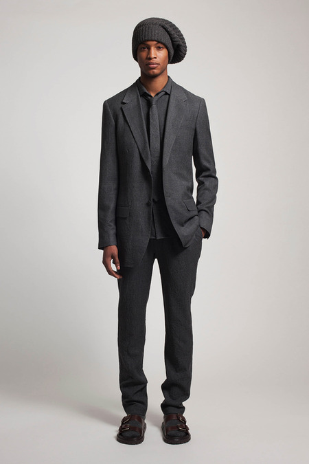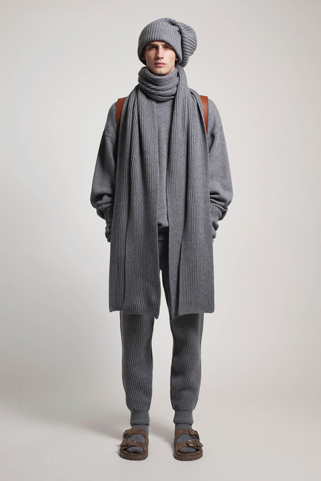 He was reacting, he said, to the twin nightmares of business-formal overdressing and casual Fridays. He combined both into what he called “Big Sur meets Big City.” Baja sweaters and beanies abounded. There were suit fabrics and tailored jackets, but softened into something more like pajamas than power suits. A representative look paired crinkled flannel track pants with a longer, three-button jacket, untucked shirt, mohair pullover, and sandals. “It’s the crushing of Wall Street,” Kors said gleefully.