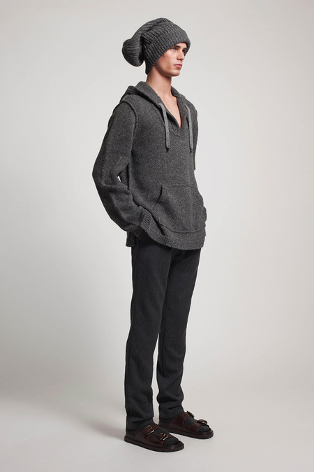 He was reacting, he said, to the twin nightmares of business-formal overdressing and casual Fridays. He combined both into what he called “Big Sur meets Big City.” Baja sweaters and beanies abounded. There were suit fabrics and tailored jackets, but softened into something more like pajamas than power suits. A representative look paired crinkled flannel track pants with a longer, three-button jacket, untucked shirt, mohair pullover, and sandals. “It’s the crushing of Wall Street,” Kors said gleefully.