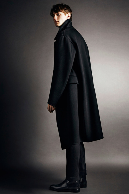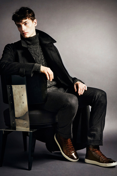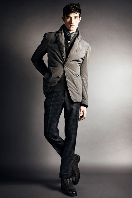 Things got even better when Ford dialed down the volume, as in a down-filled taupe blazer and a bone-toned mac (aestheticized, he claimed, with a process that removes the characteristic rubbery aroma). But the most telling addition to Ford’s newly casual Fall repertoire may well have been trainers. He called them “tennis shoes.” Said he’d been resisting them forever, or at least “until I could figure out how to make them distinctive.” The secret? They are produced using the hand-polishing technique that is applied to Ford’s dress shoes: three days per pair, to yield a lustrous aged-in-wood effect.