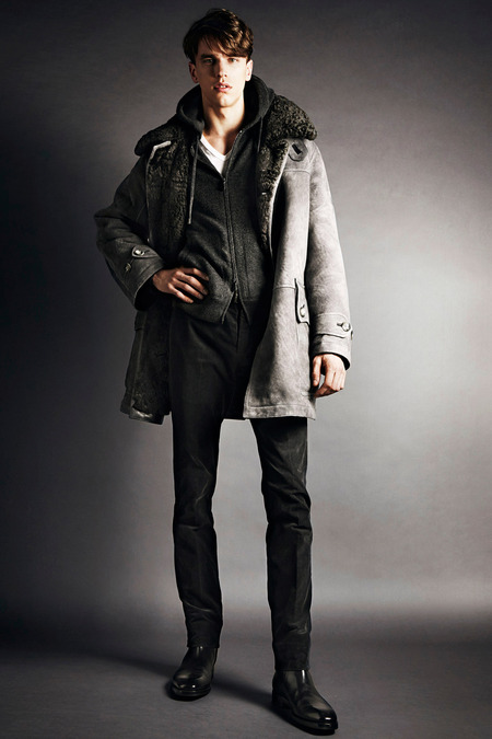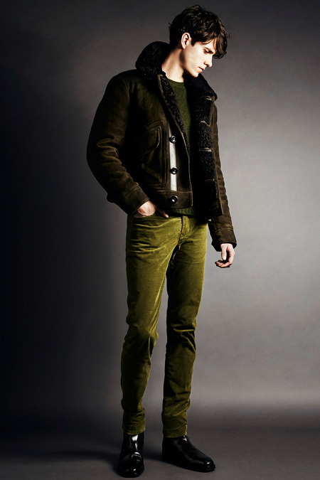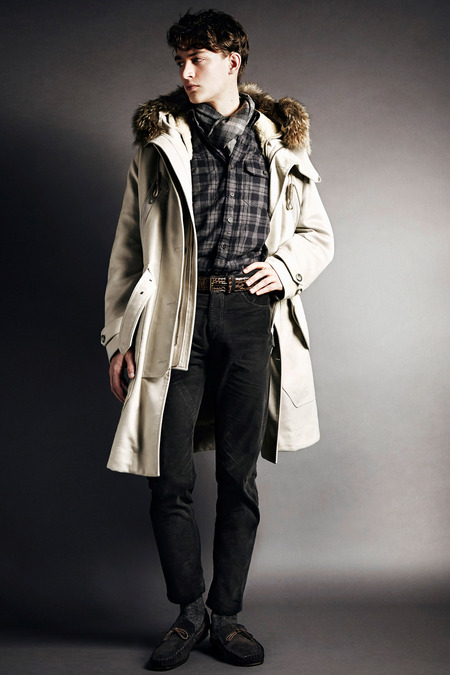 Things got even better when Ford dialed down the volume, as in a down-filled taupe blazer and a bone-toned mac (aestheticized, he claimed, with a process that removes the characteristic rubbery aroma). But the most telling addition to Ford’s newly casual Fall repertoire may well have been trainers. He called them “tennis shoes.” Said he’d been resisting them forever, or at least “until I could figure out how to make them distinctive.” The secret? They are produced using the hand-polishing technique that is applied to Ford’s dress shoes: three days per pair, to yield a lustrous aged-in-wood effect.