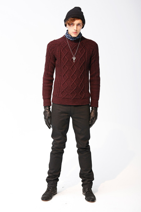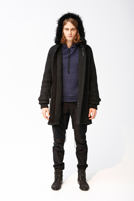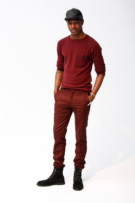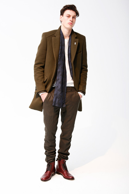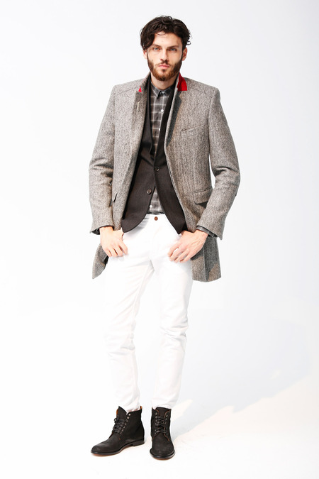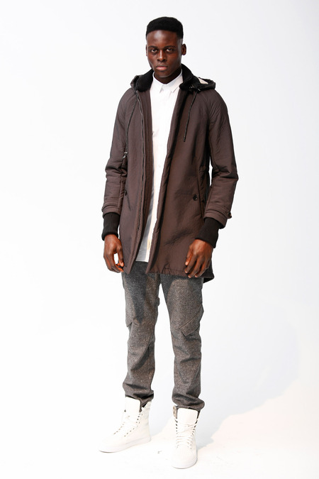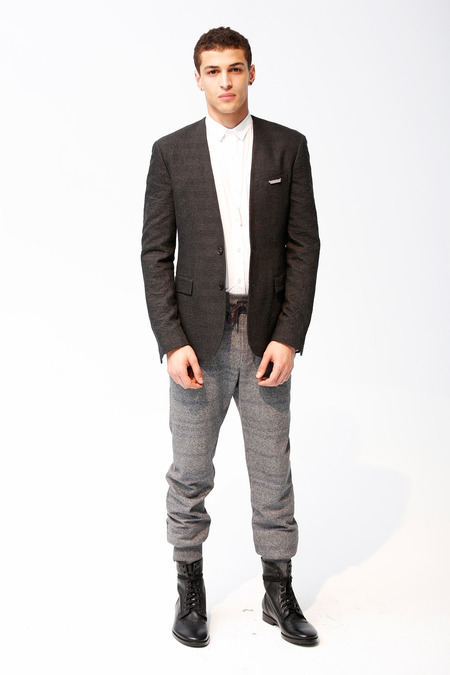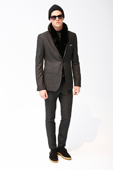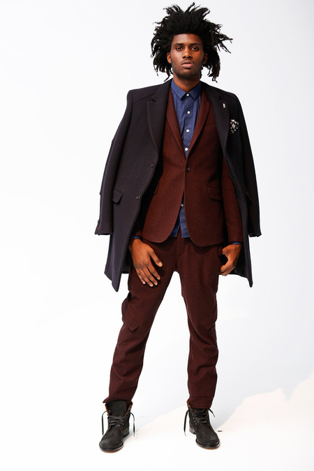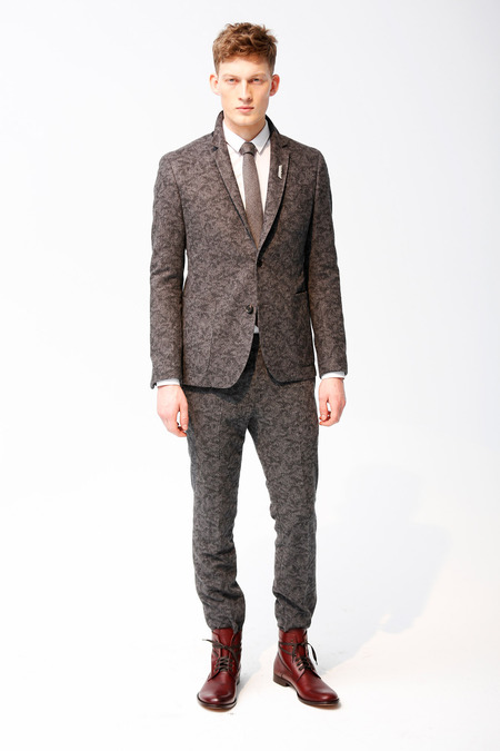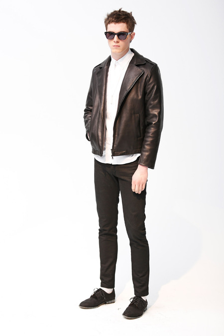 Bespoken would seem to be in a dark place for Fall, and it suits them. The Fayed brothers, Liam and Sammy, whose family owns Savile Row titan Turnbull & Asser, have made a name for themselves over eight seasons by turning traditional suiting tropes on their head. This time out, their inspiration board brimmed over with stark, sooty images of troubled types like Libertines front man Pete Doherty, plenty of leather, and a shot of Mick Jagger (no doubt compulsory for anyone showing menswear in the 2010s). Bespoken’s latest offering, dubbed Tailored Vandals, took the rock ‘n’ roll leanings that have become the label’s hallmark and upped the Doherty factor exponentially. There were razor-blade stickpins tucked into lean lapels, and pendants took cues from textured handgun grips and drum-tuning keys. Lest these touches start to sound like they’re erring on the wrong side of rock flash, they were all carried off with impressive elegance. It doesn’t hurt that they were paired with some of the finest fabrics available, and an innate eye for tailoring.