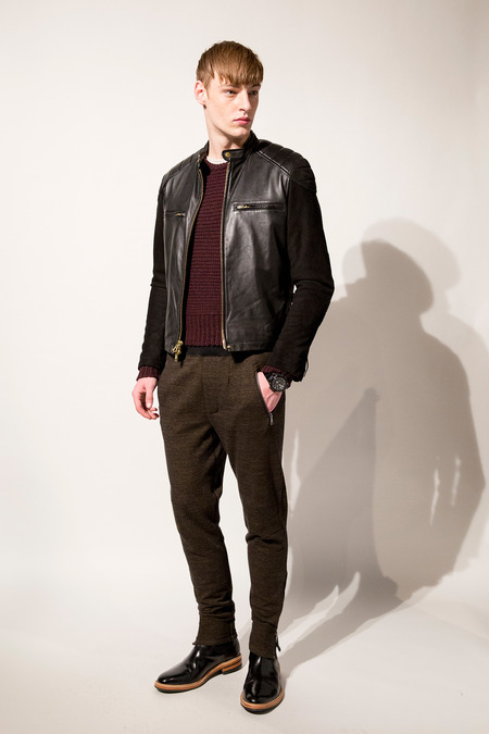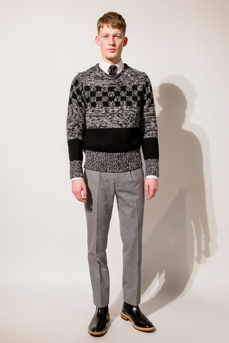 The proportions—slightly tapered cropped pants worn with Chelsea boots, and layered sweaters, vests, and coats—were spot-on, particularly in the looks that featured dressed-up wool athletic pants. The autumnal palette of heather gray, cappuccino, burgundy, rust, and aubergine was mostly on point, too, save a dusty blue series that stuck out as overly retro. Snyder also could have done away with a pair of shiny silk jacquard dinner jackets, one in black, one in white with an ebony lapel. To be fair, Mick would rock those toppers, but on a mere mortal they read more bandleader, or busboy, than rock star.
