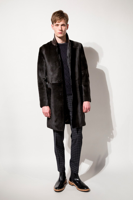 There were options for rebels and dandies alike in Snyder’s Fall outing, which marks the veteran menswear designer’s seventh season since launching his eponymous range. And they were luxe options at that—particularly when it came to outerwear. Bomber jackets were a focus, the best ones being a buttery black leather number with quilted shoulders and suede sleeves, a sporty perforated lambskin iteration, and a tan shearling style whose hide was covered in a houndstooth print. Snyder’s pride and joy, though, is a shaved shearling topcoat with just the right amount of sheen. “This is my chicest thing,” he beamed, pulling at its hem.