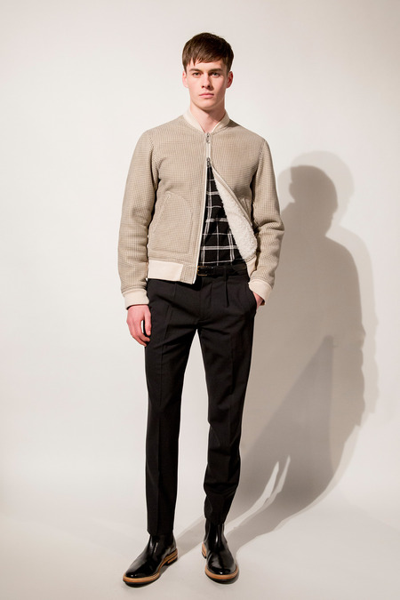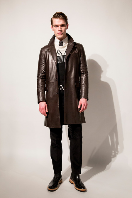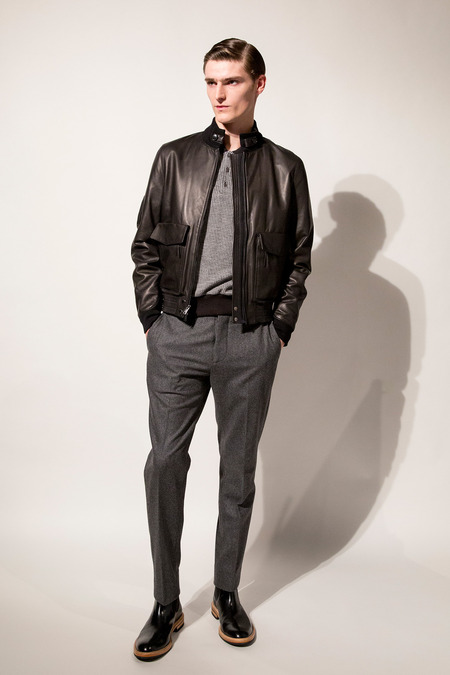 There were options for rebels and dandies alike in Snyder’s Fall outing, which marks the veteran menswear designer’s seventh season since launching his eponymous range. And they were luxe options at that—particularly when it came to outerwear. Bomber jackets were a focus, the best ones being a buttery black leather number with quilted shoulders and suede sleeves, a sporty perforated lambskin iteration, and a tan shearling style whose hide was covered in a houndstooth print. Snyder’s pride and joy, though, is a shaved shearling topcoat with just the right amount of sheen. “This is my chicest thing,” he beamed, pulling at its hem.