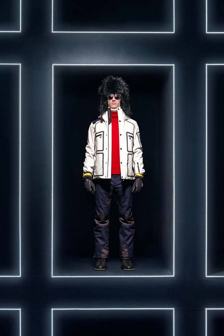 Hmm. Where to start? This evening’s Moncler Grenoble event was easily one of the oddest fashion presentations this reviewer has had the fine fortune to witness. It would have been somewhat odd had it merely featured the Pendulum Choir, an all-male a cappella group from Switzerland, singing strange arrangements of traditional Alpine song. It would have been fairly odd if the choir had performed in front of a backdrop of singers, each one in a lit box, clad in new looks from Moncler. But what really made this coup de théâtre one for the ages was the fact that the members of the Pendulum Choir were clad in down-filled Moncler morning suits—ski-ready, one presumes—and mounted on mechanized pedestals that moved them about as they sang. That was the cherry on top, the thing that made you wonder, Is there an opera based on a short story by Kafka I don’t know about? (Probably.) You also wondered, more fleetingly, what all those ski suits worn by the choristers actually looked like. Who knows? Their clothes were all black and white; the lookbook pictures that run with this review show women’s polarwear in a variety of colors, featuring stretch quilting and tie-dye fur, and men’s looks heavy on nylon printed to resemble tweed. All very natty, as these things go, and no doubt we’ll be seeing plenty of these Moncler looks riding up the lifts at Chamonix and Gstaad. The Pendulum Choir seemed to be singing in German; maybe that’s what they were singing about.