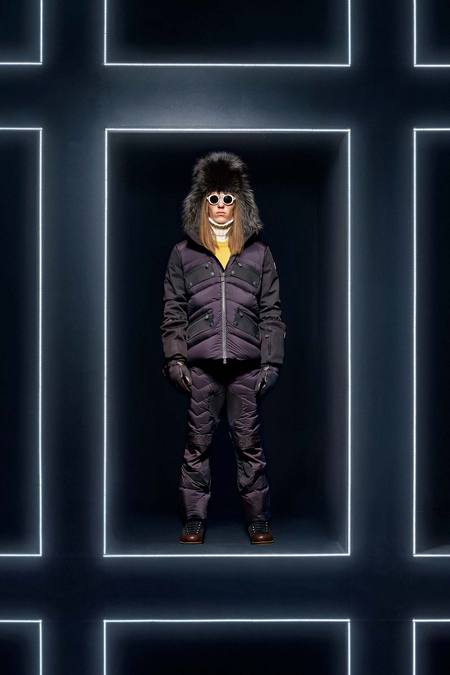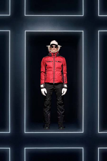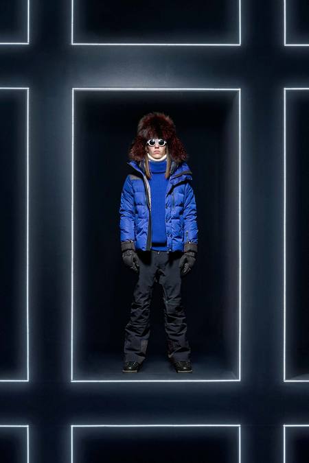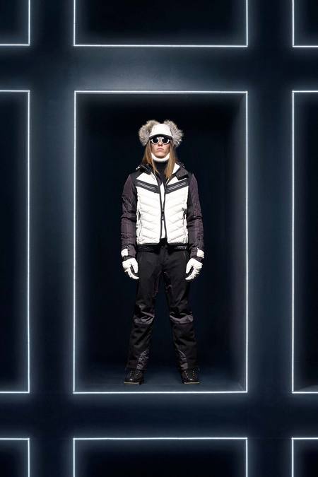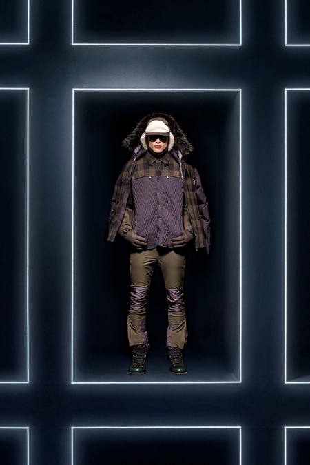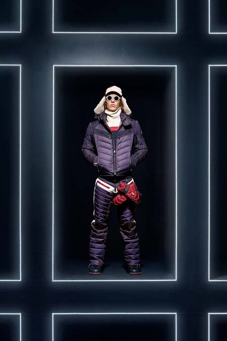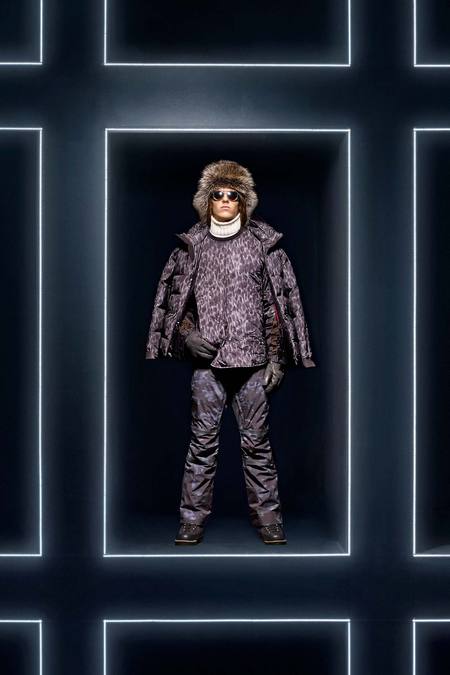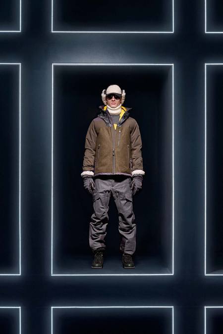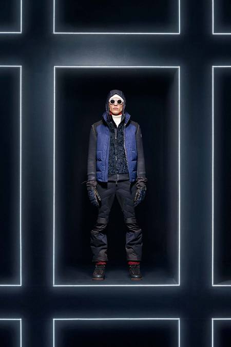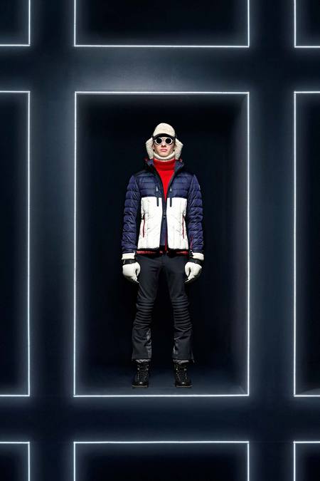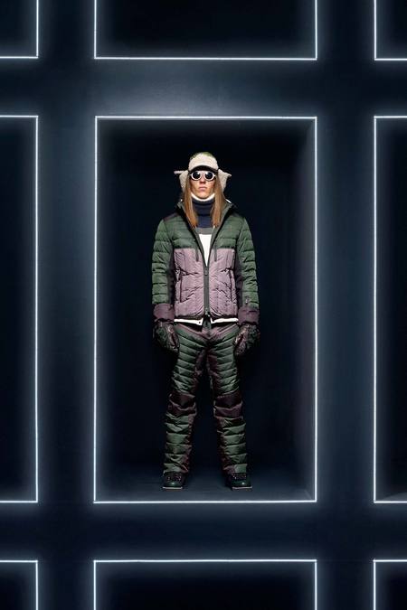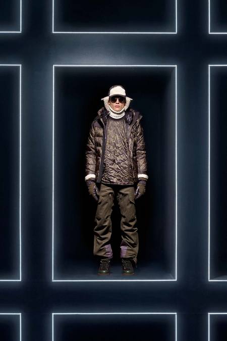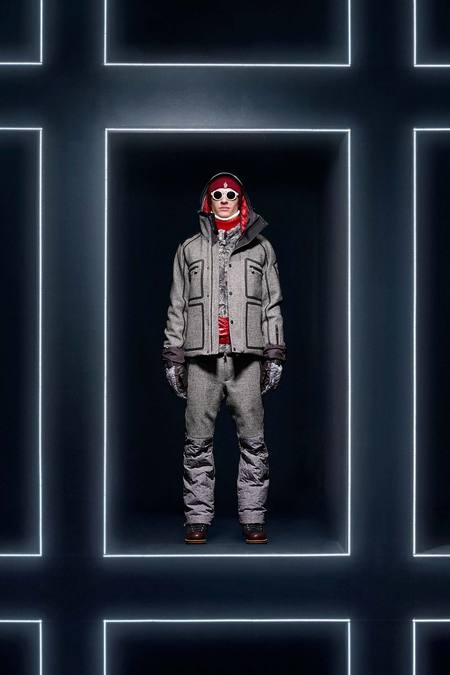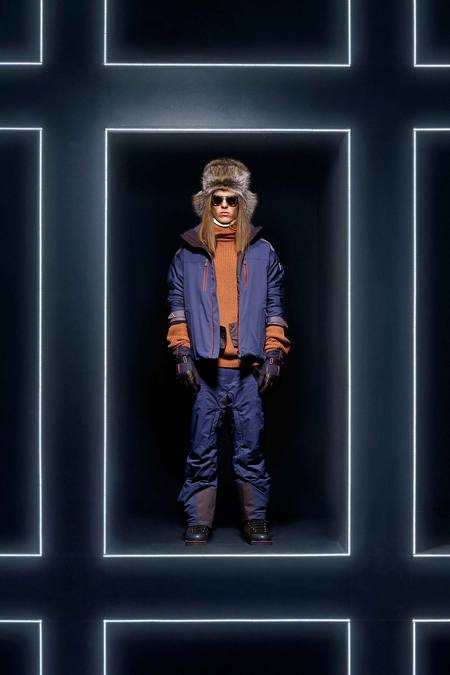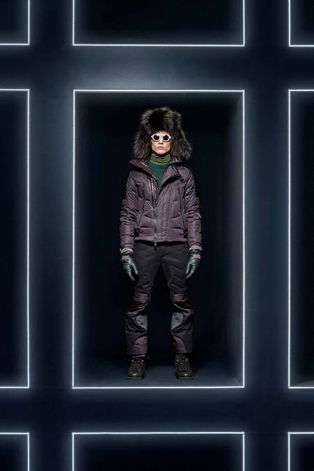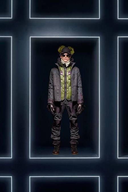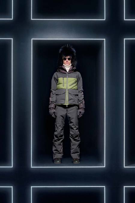 Hmm. Where to start? This evening’s Moncler Grenoble event was easily one of the oddest fashion presentations this reviewer has had the fine fortune to witness. It would have been somewhat odd had it merely featured the Pendulum Choir, an all-male a cappella group from Switzerland, singing strange arrangements of traditional Alpine song. It would have been fairly odd if the choir had performed in front of a backdrop of singers, each one in a lit box, clad in new looks from Moncler. But what really made this coup de théâtre one for the ages was the fact that the members of the Pendulum Choir were clad in down-filled Moncler morning suits—ski-ready, one presumes—and mounted on mechanized pedestals that moved them about as they sang. That was the cherry on top, the thing that made you wonder, Is there an opera based on a short story by Kafka I don’t know about? (Probably.) You also wondered, more fleetingly, what all those ski suits worn by the choristers actually looked like. Who knows? Their clothes were all black and white; the lookbook pictures that run with this review show women’s polarwear in a variety of colors, featuring stretch quilting and tie-dye fur, and men’s looks heavy on nylon printed to resemble tweed. All very natty, as these things go, and no doubt we’ll be seeing plenty of these Moncler looks riding up the lifts at Chamonix and Gstaad. The Pendulum Choir seemed to be singing in German; maybe that’s what they were singing about.