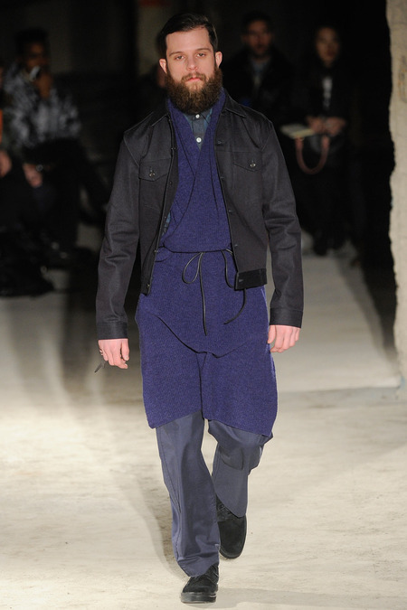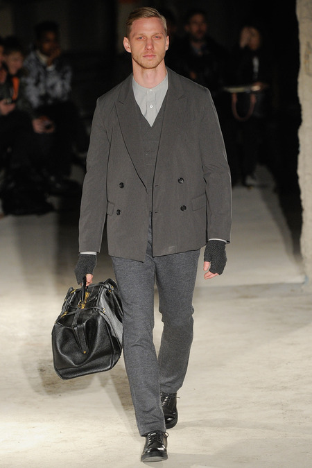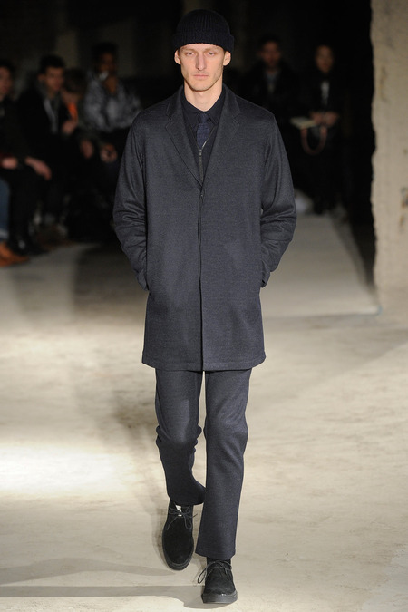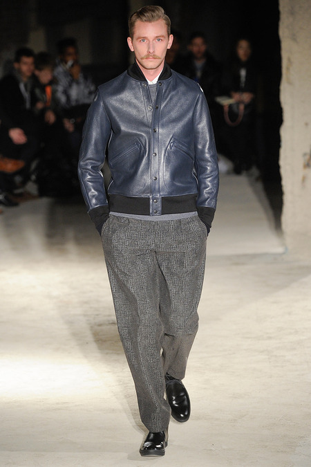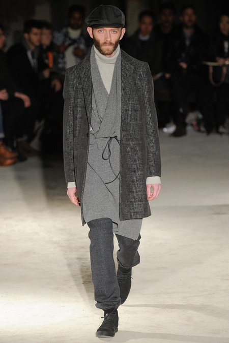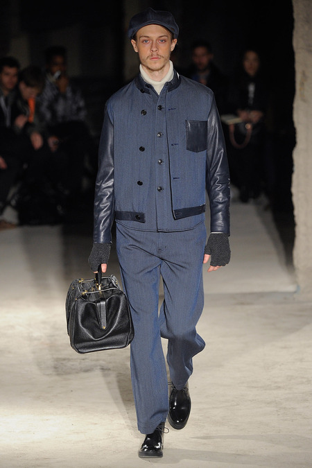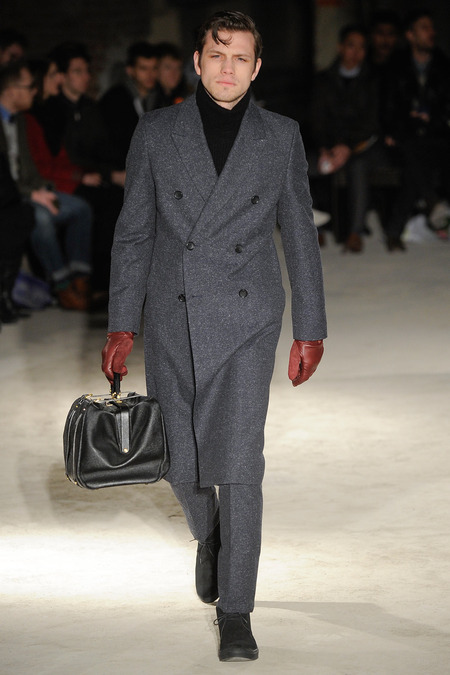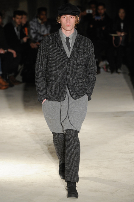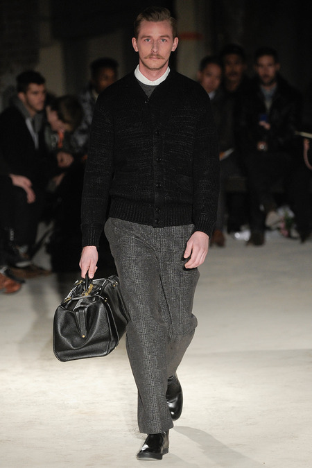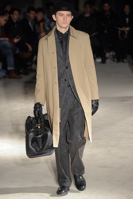 Thankfully, it was nothing of the sort. Obana, a vintage clothing expert with an eye for fine fabrication, had a much subtler, softer vision in mind. His characters, some with beards or mustaches, looked more like G-riding haberdashers than gunslinging gangsters. They sported beautifully tailored camel topcoats, loose-fitting yet impeccable three-piece gray suits, and—hinting at those mobsters who worked the docks—peacoats and wool knit caps. Even the humble ribbed sweater made several appearances, as did intriguing scarf-apron hybrids, also ribbed, that alluded to similar items worn by brewers of the day. Black leather bags were voluminous and squared off, and they were passed between models as if exchanging smuggled goods or extorted money. These were Roaring looks that had been tamed and, dare we say, dandified.