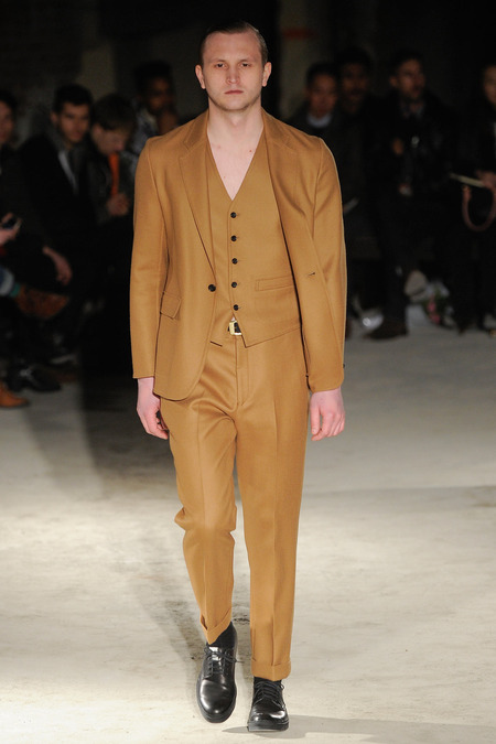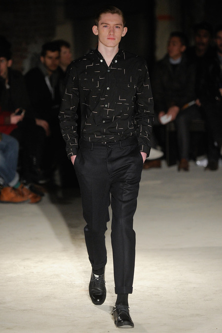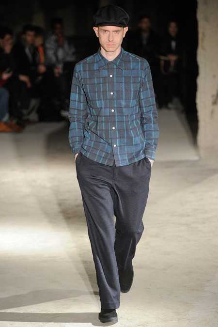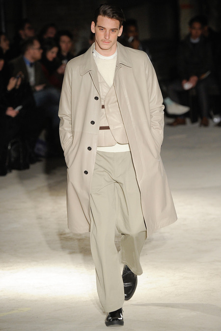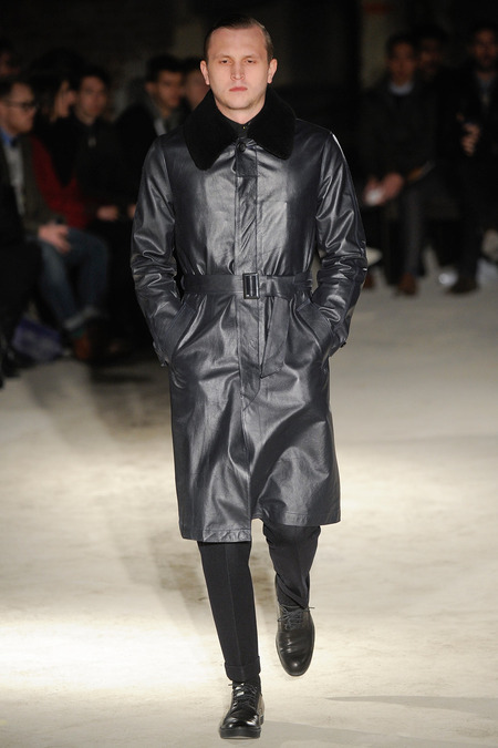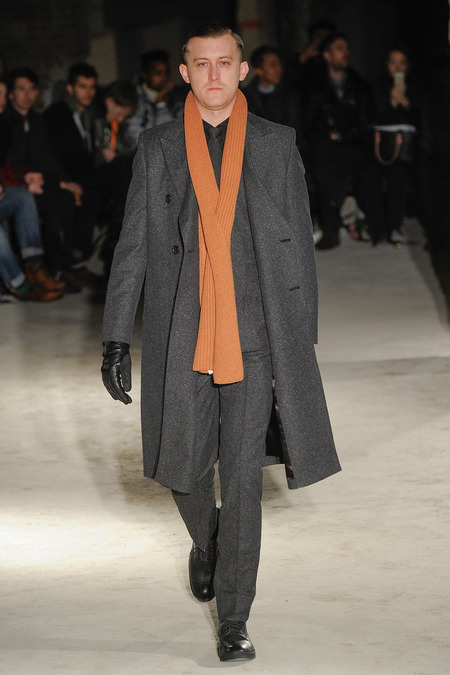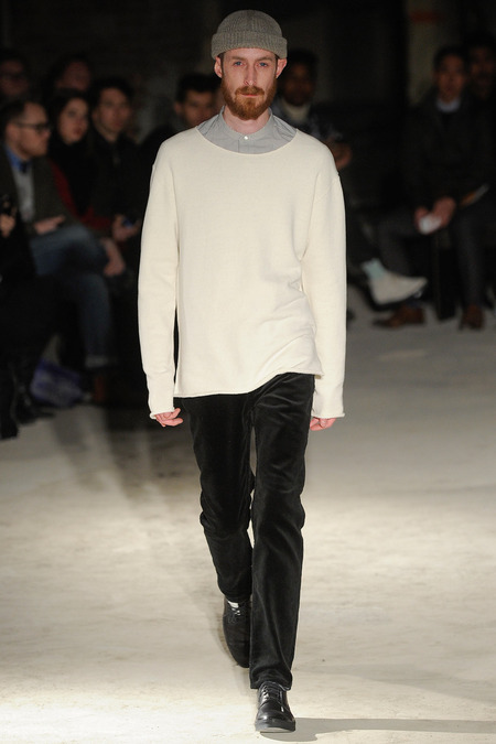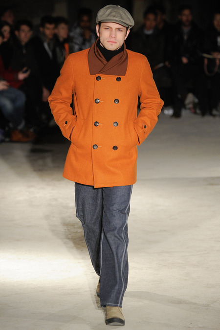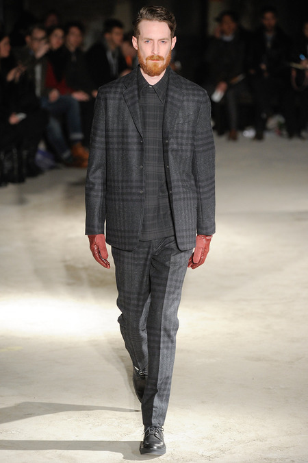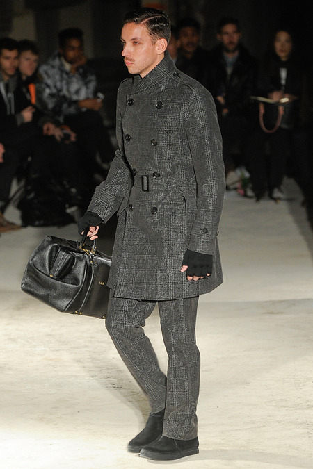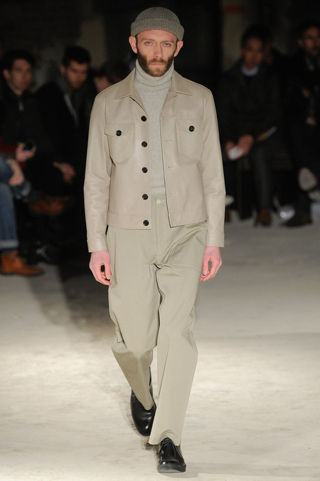 Thankfully, it was nothing of the sort. Obana, a vintage clothing expert with an eye for fine fabrication, had a much subtler, softer vision in mind. His characters, some with beards or mustaches, looked more like G-riding haberdashers than gunslinging gangsters. They sported beautifully tailored camel topcoats, loose-fitting yet impeccable three-piece gray suits, and—hinting at those mobsters who worked the docks—peacoats and wool knit caps. Even the humble ribbed sweater made several appearances, as did intriguing scarf-apron hybrids, also ribbed, that alluded to similar items worn by brewers of the day. Black leather bags were voluminous and squared off, and they were passed between models as if exchanging smuggled goods or extorted money. These were Roaring looks that had been tamed and, dare we say, dandified.