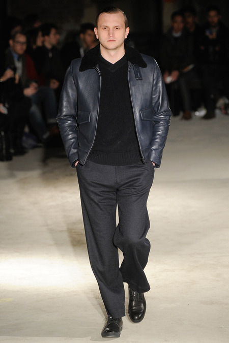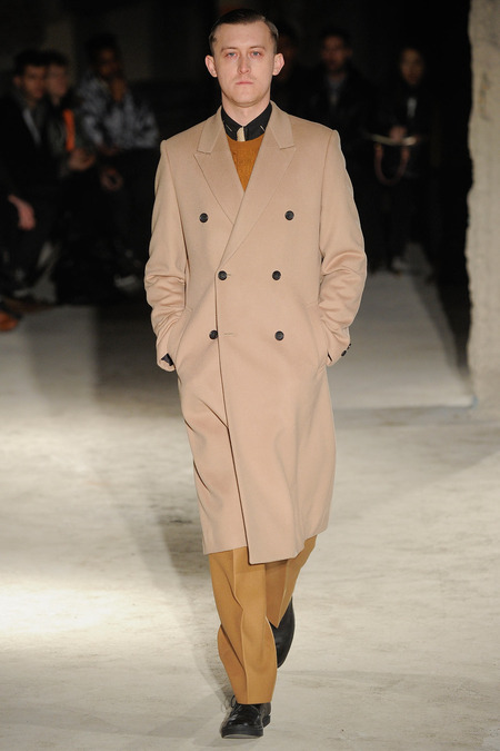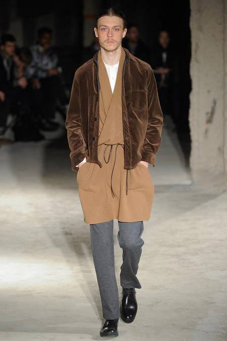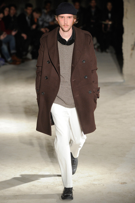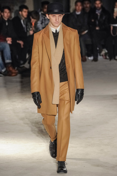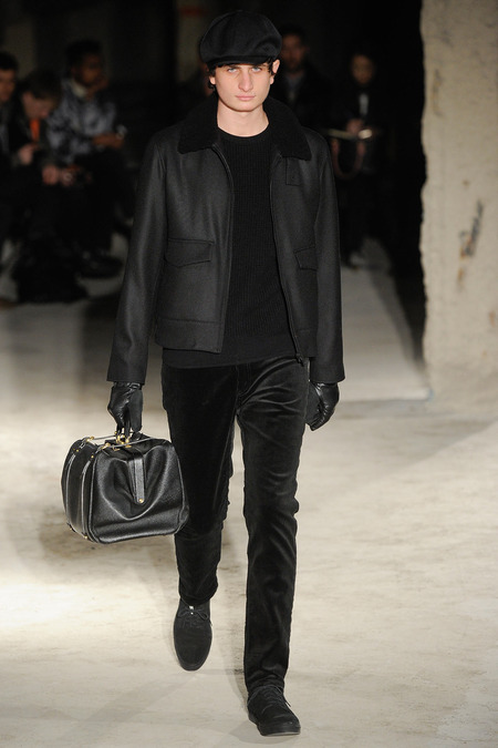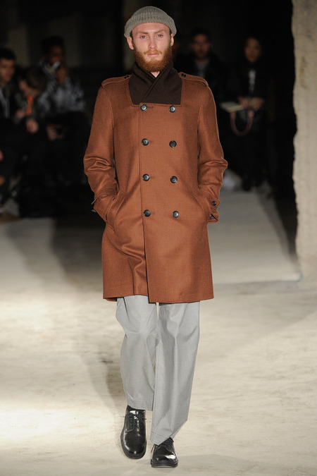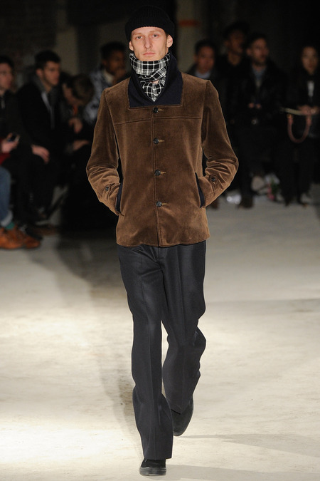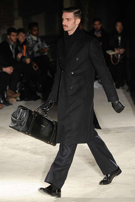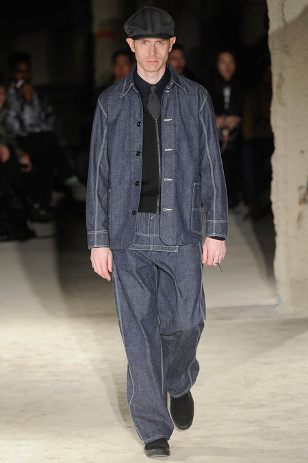 Thankfully, it was nothing of the sort. Obana, a vintage clothing expert with an eye for fine fabrication, had a much subtler, softer vision in mind. His characters, some with beards or mustaches, looked more like G-riding haberdashers than gunslinging gangsters. They sported beautifully tailored camel topcoats, loose-fitting yet impeccable three-piece gray suits, and—hinting at those mobsters who worked the docks—peacoats and wool knit caps. Even the humble ribbed sweater made several appearances, as did intriguing scarf-apron hybrids, also ribbed, that alluded to similar items worn by brewers of the day. Black leather bags were voluminous and squared off, and they were passed between models as if exchanging smuggled goods or extorted money. These were Roaring looks that had been tamed and, dare we say, dandified.
