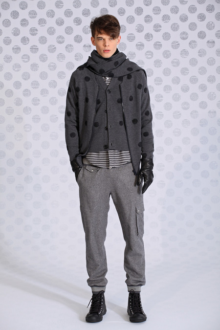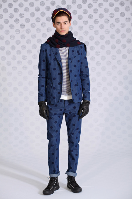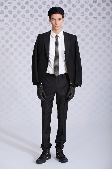 Sternberg thus channeled the buzzy, frenetic spirit of old-school newsrooms, cobbling together mismatched patterns like windowpane and polka dot in clever and appealing ways. Some of those polka dots were filled in with classified copy, which could also be found on ties. The palette pinged between black and white, sticking mostly to gray scale, occasionally darting into lush green dégradé or red-blue tartan. Squint and you could almost make out Clark Kent in Sternberg’s thought process, but no, these were old-fashioned newsboys, topped with jaunty little newsboy caps to prove it.