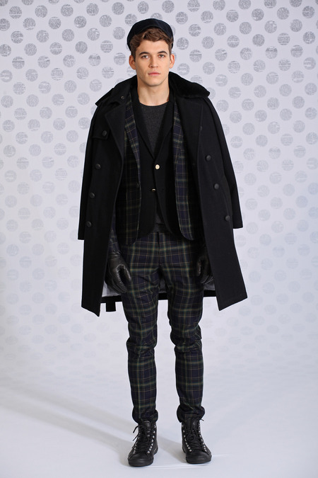 Sternberg thus channeled the buzzy, frenetic spirit of old-school newsrooms, cobbling together mismatched patterns like windowpane and polka dot in clever and appealing ways. Some of those polka dots were filled in with classified copy, which could also be found on ties. The palette pinged between black and white, sticking mostly to gray scale, occasionally darting into lush green dégradé or red-blue tartan. Squint and you could almost make out Clark Kent in Sternberg’s thought process, but no, these were old-fashioned newsboys, topped with jaunty little newsboy caps to prove it.